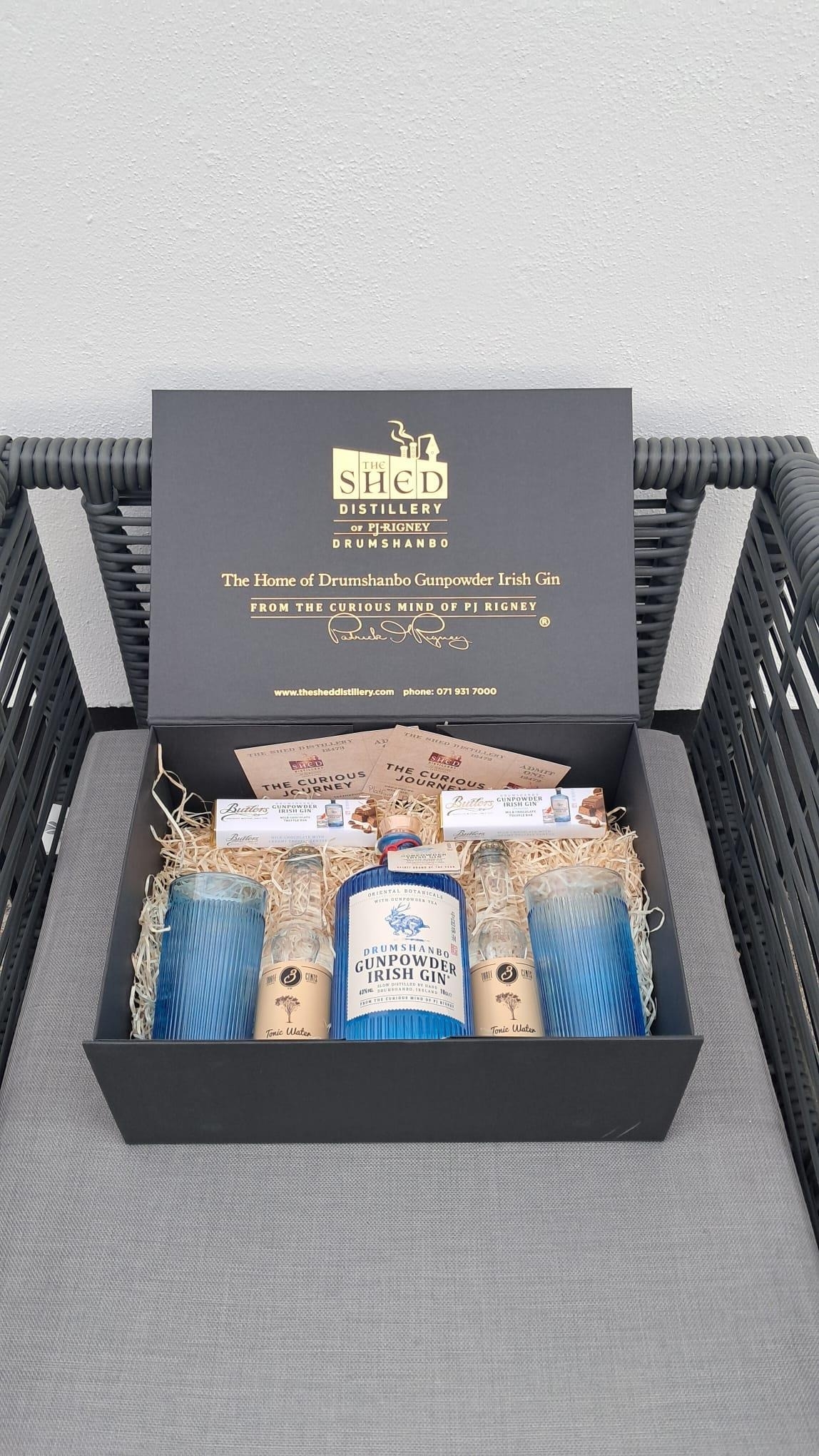 Drumshanbo Shed Distillery Hamper and Tour for two - Embark on a Curious Journey of your own at the home of Drumshanbo Gunpowder Irish Gin with a fully guided experience for two with one of our Curious Ambassadors. The hamper contains 2 tickets for a fully-guided tour, a bottle of Drumshanbo Gunpowder Irish Gin, two glasses, two mixers and two Butler's Drumshanbo Irish Gin® Truffles.