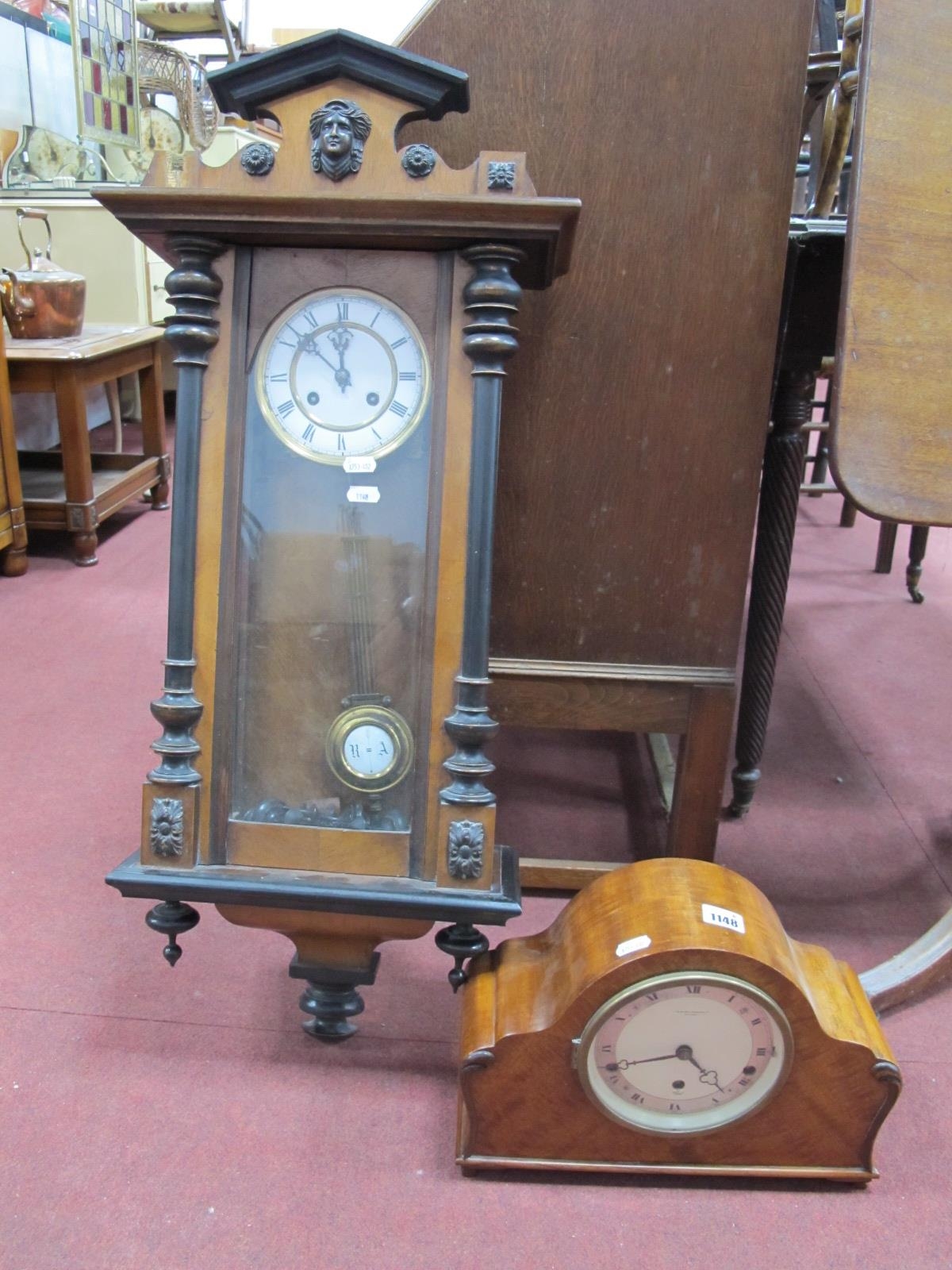 Vienna Wall Clock, marked 'R.A. to pendulum; together with an Elliot London mantle clock, both with keys. (2)