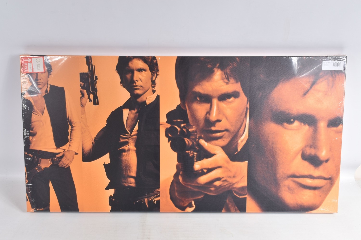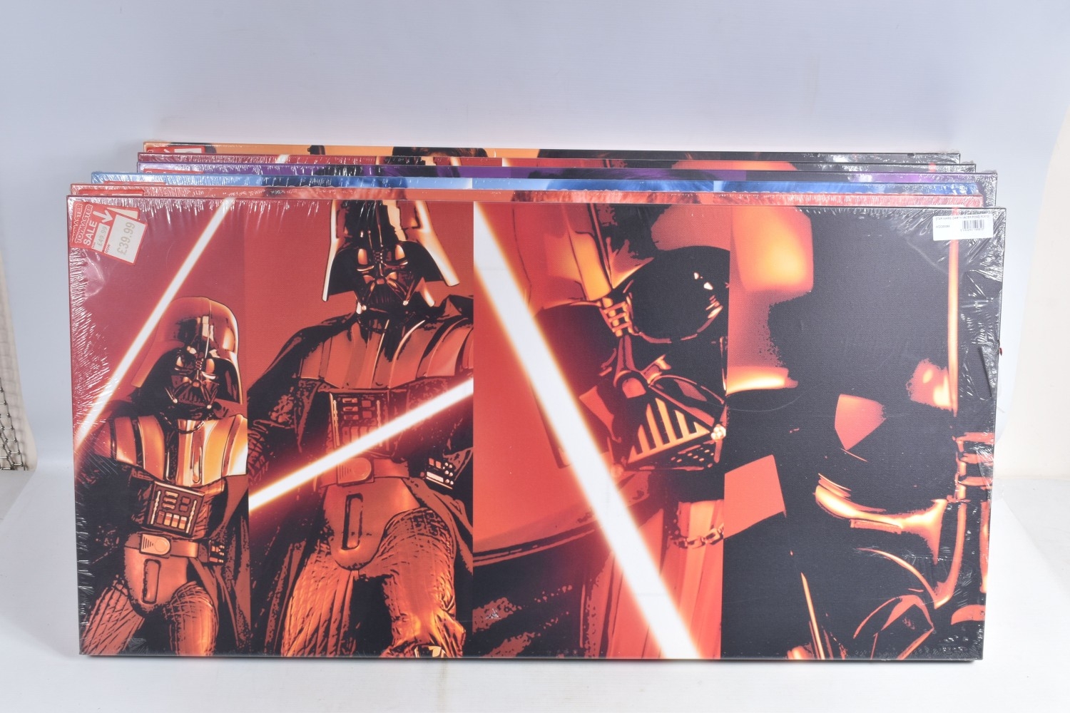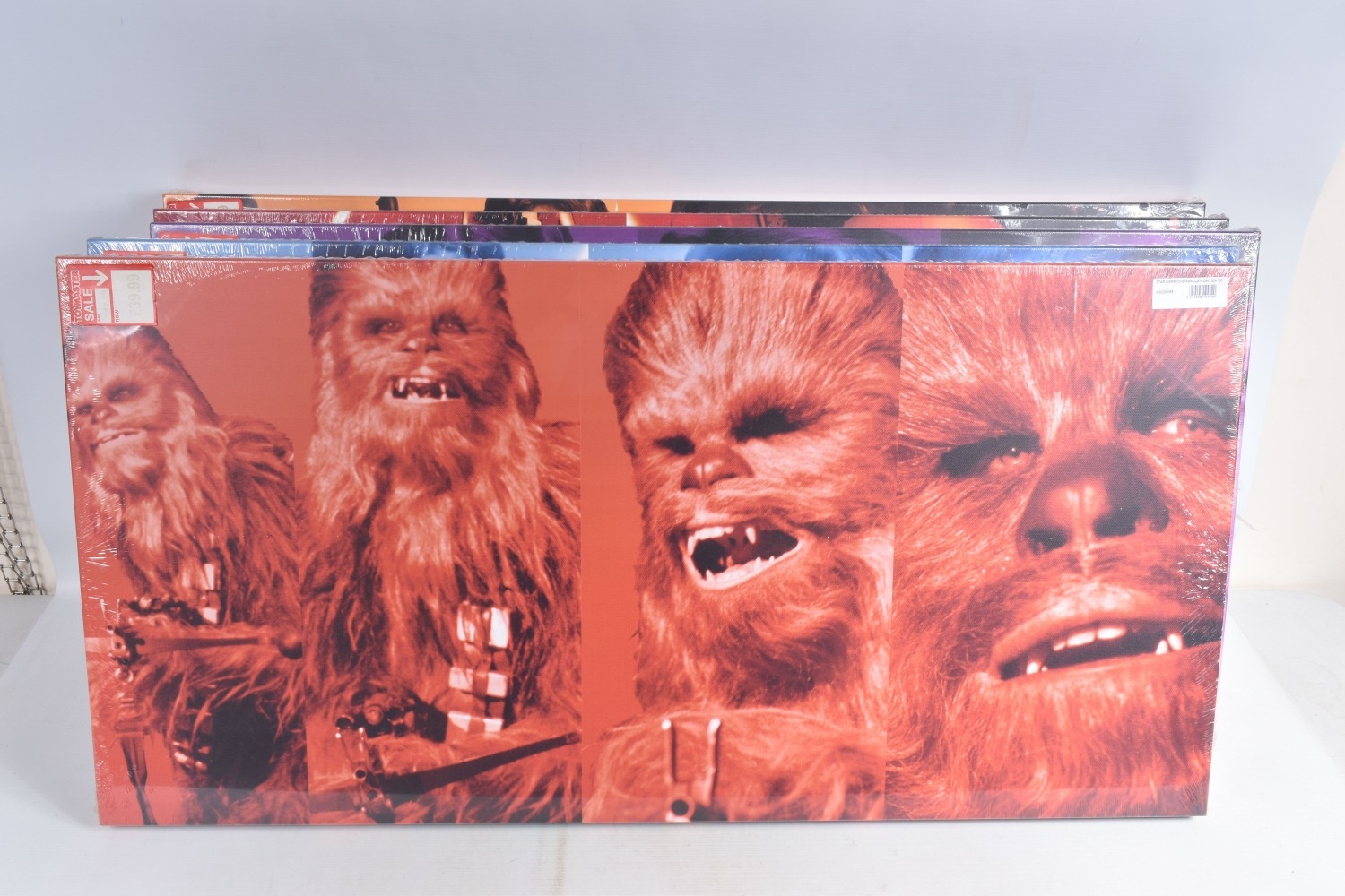 SIX NEW STAR WARS PRINTS ON CANVAS, featuring Han Solo, Chewbacca, two Darth Vader, Luke Skywalker and Princess Leia, each 100cm wide by 50cm tall, approximately 4cm depth, produced by Pyramid International