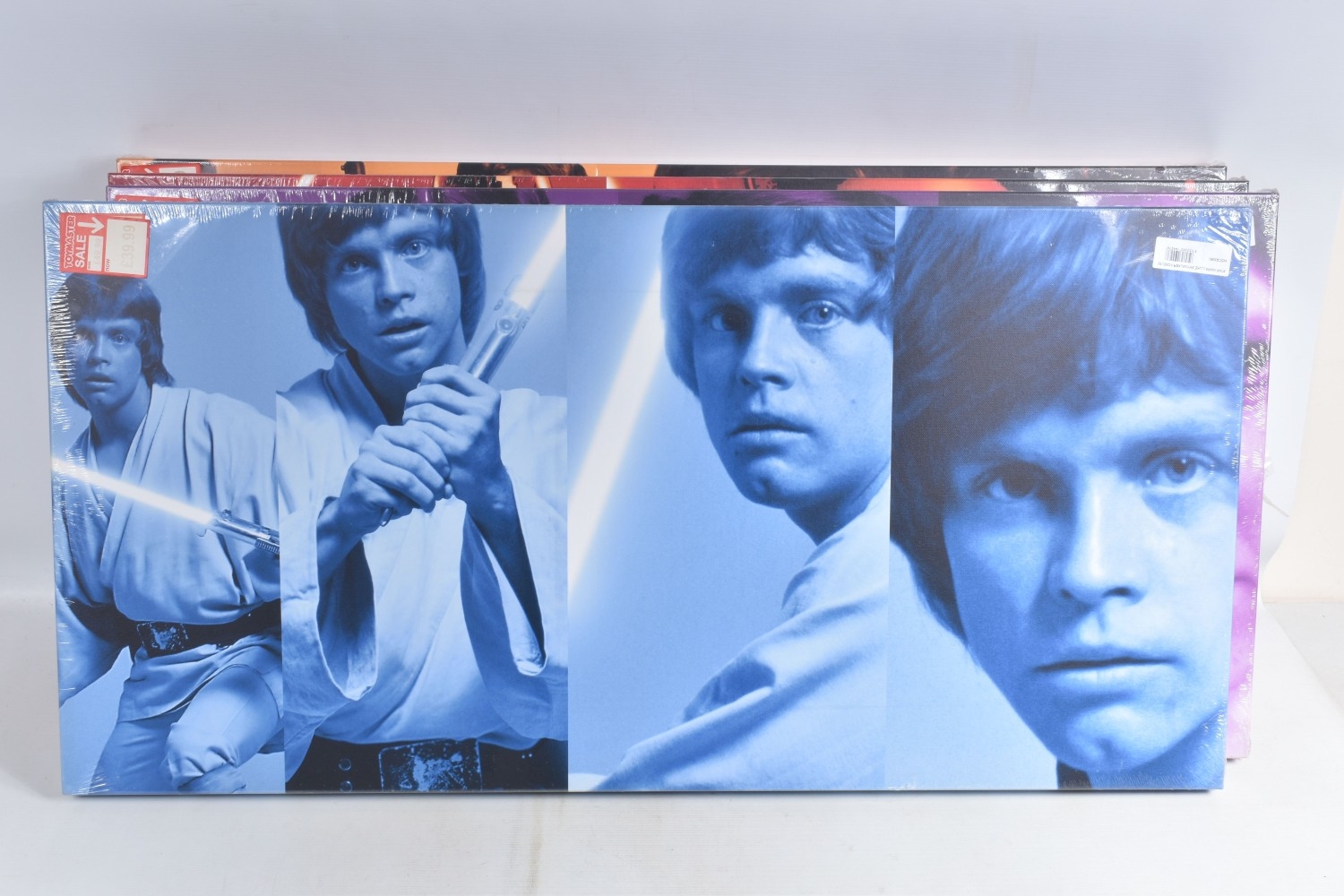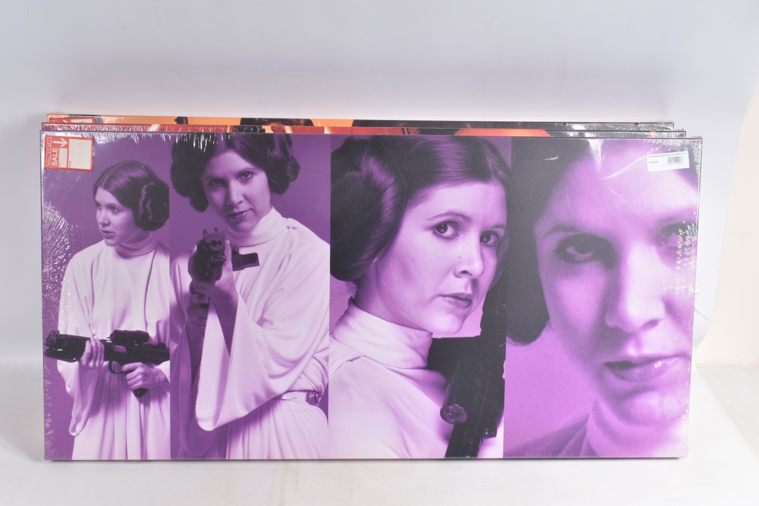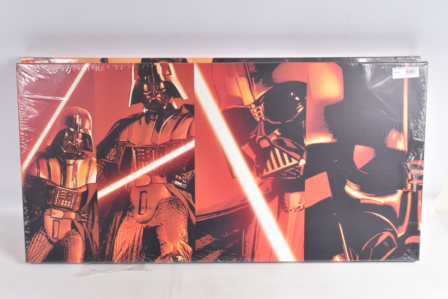 SIX NEW STAR WARS PRINTS ON CANVAS, featuring Han Solo, Chewbacca, two Darth Vader, Luke Skywalker and Princess Leia, each 100cm wide by 50cm tall, approximately 4cm depth, produced by Pyramid International