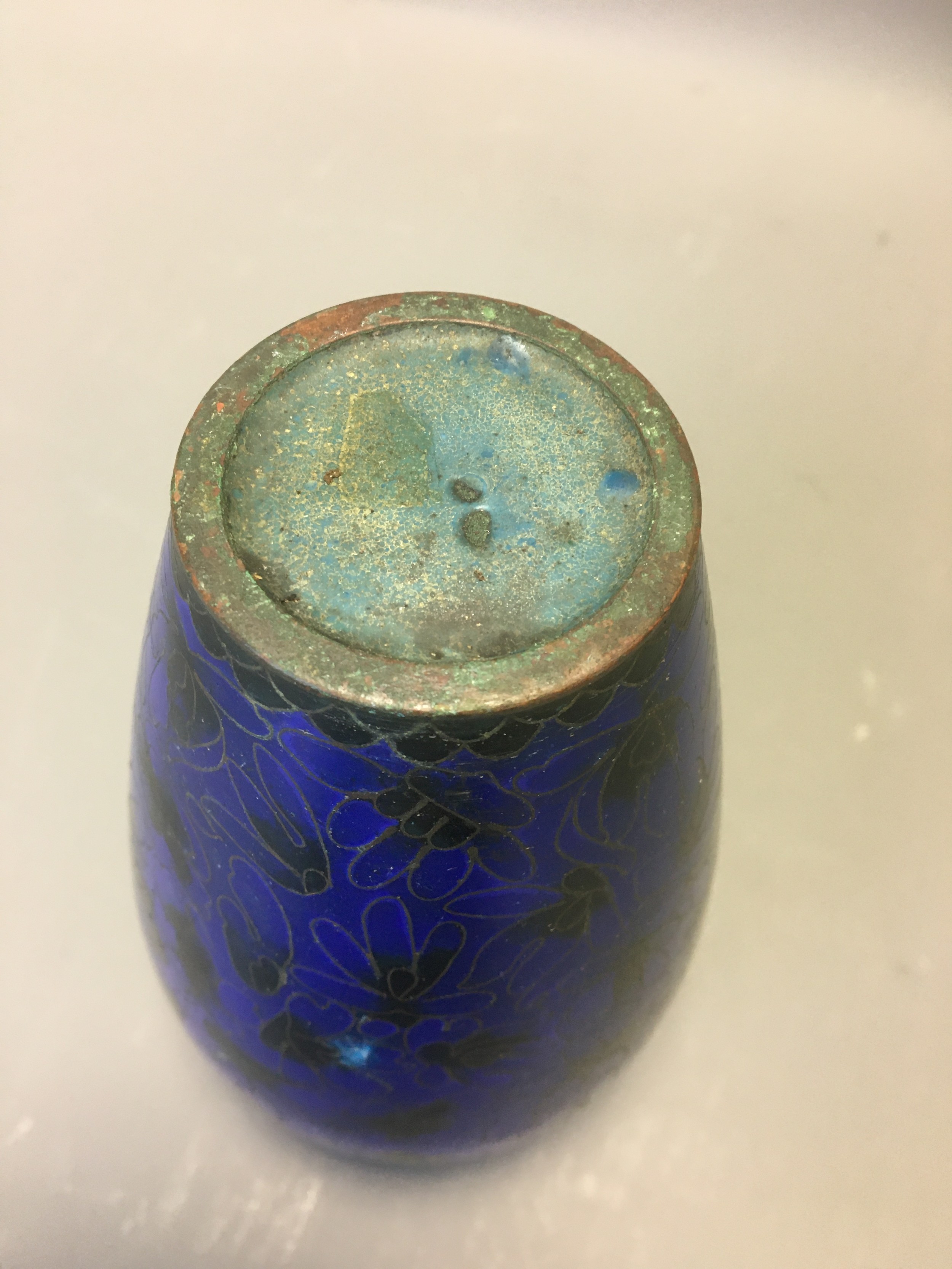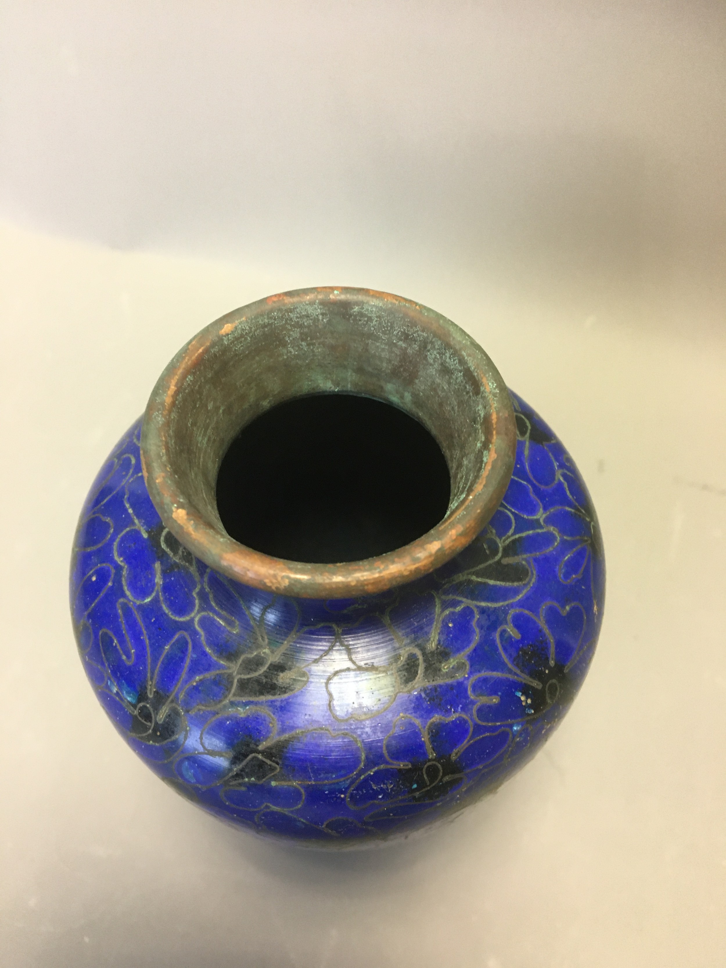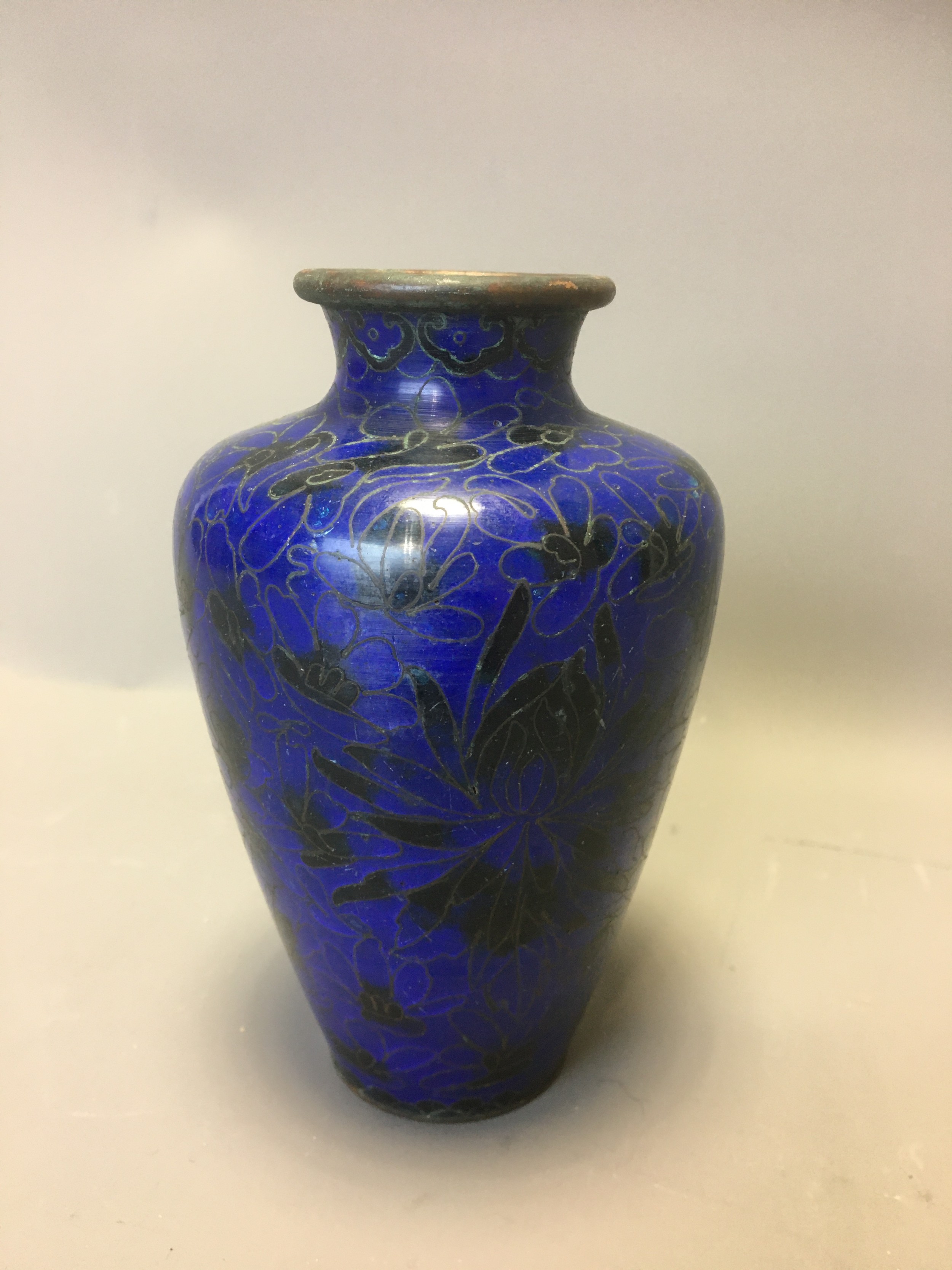 Vintage Cloisonne Chinese Vase Cobalt Blue Flowers Design.