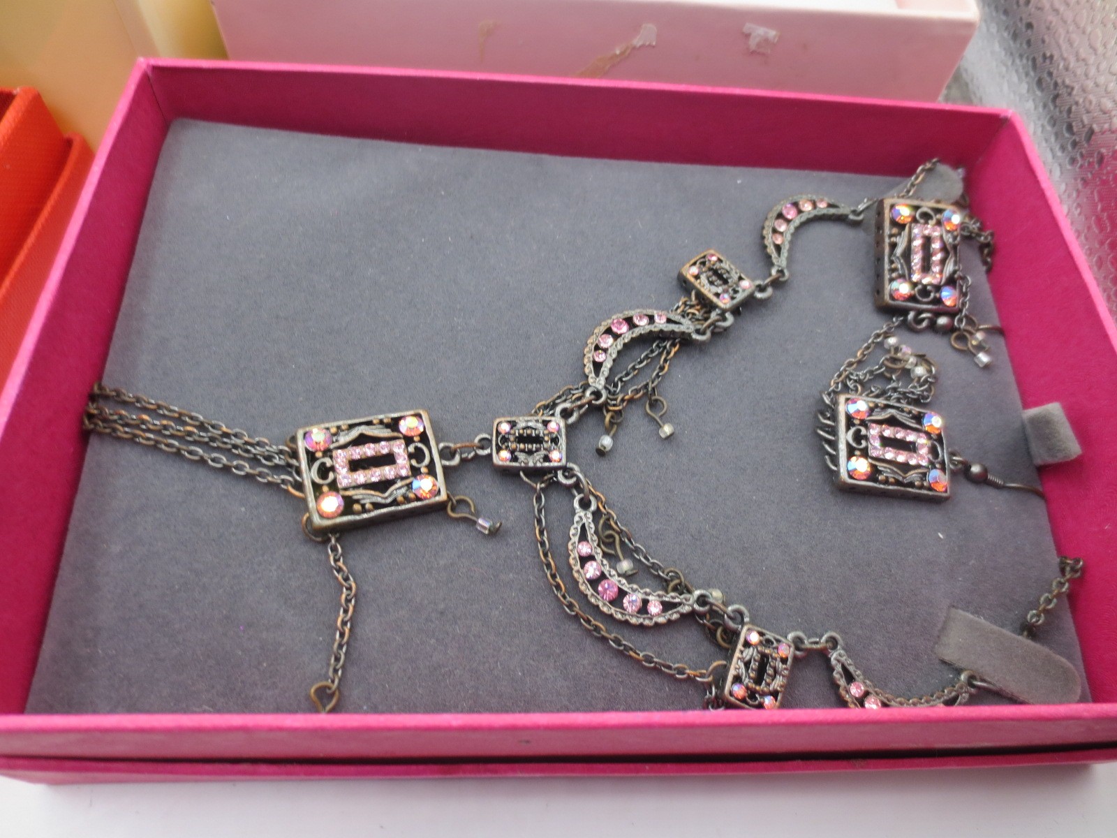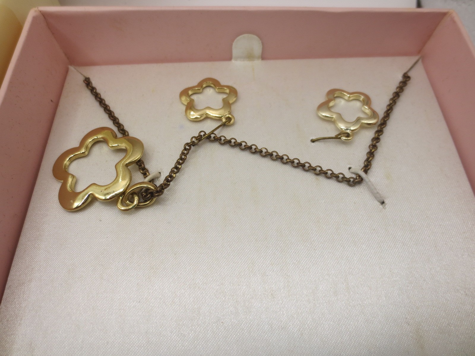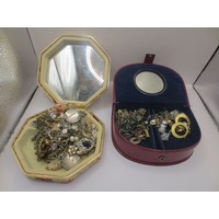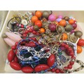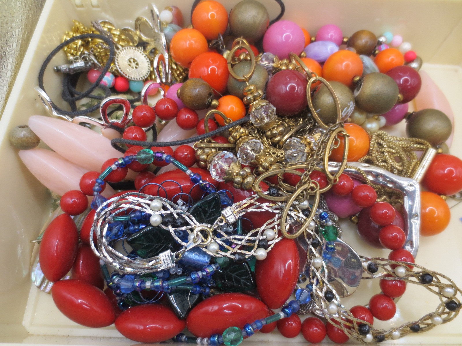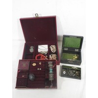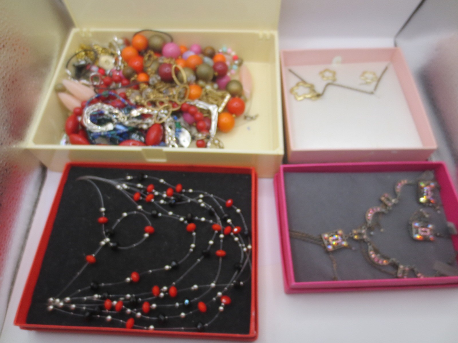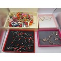A white plastic box with assorted costume jewellery, and three boxed items of costume jewellery