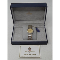 18ct Gold Gentleman's Universal Geneve wristwatch with sweep seconds hand: white dial & gold hands on leather strap. Currently working.