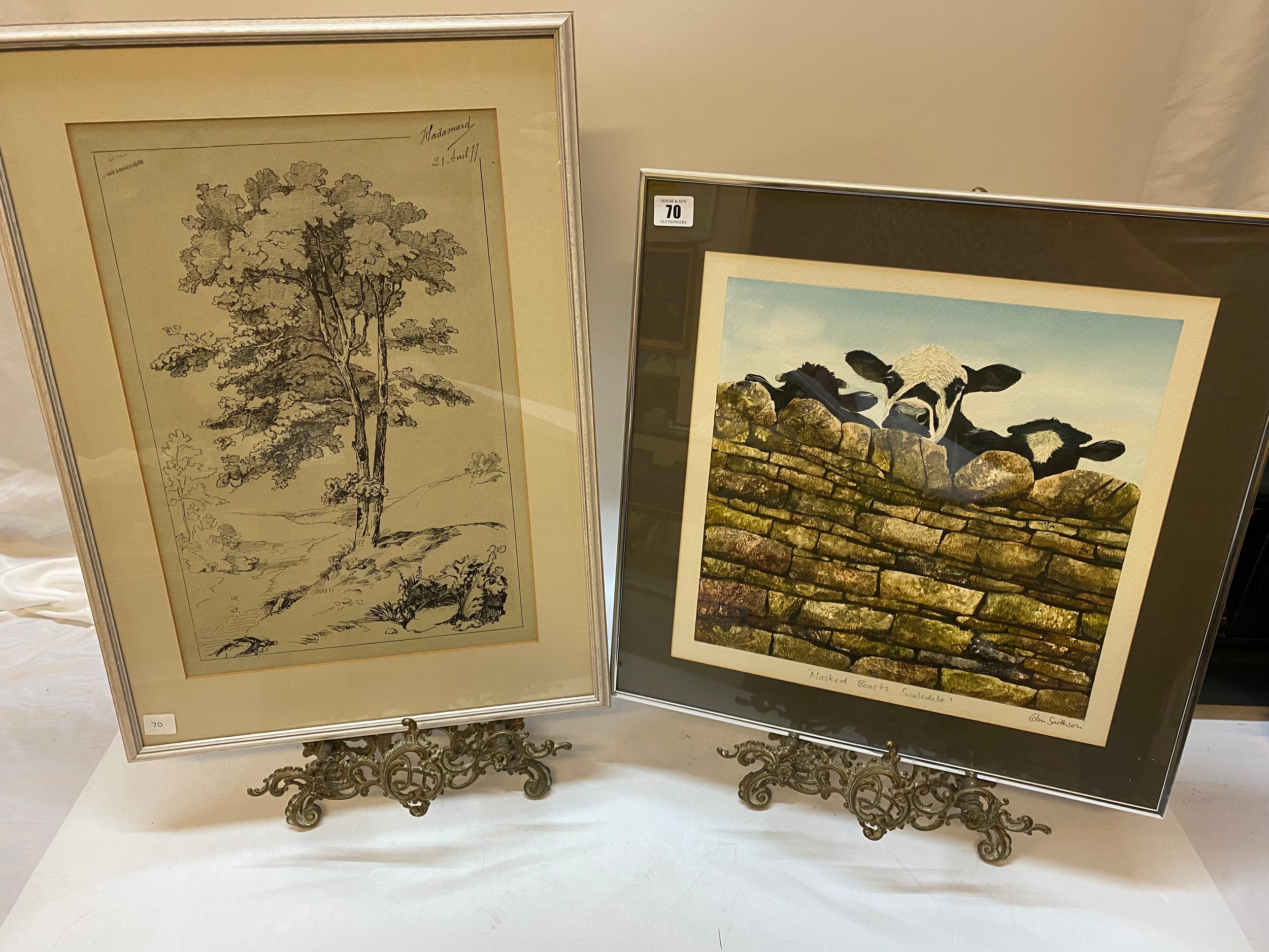 Colin Smithson. A coloured engraving entitled 'Masked Beasts Swaledale', framed and glazed - 14in. square and a pen and ink drawing of a tree, mounted, framed and glazed - 17in. x 11 1/2in.