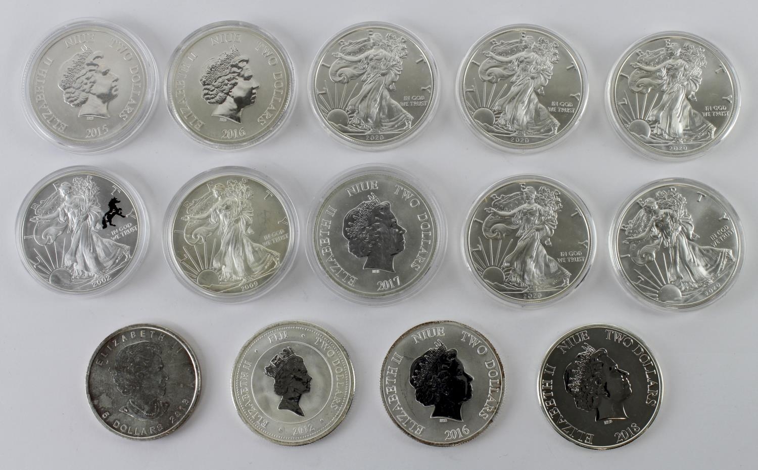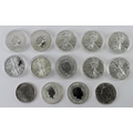 World Silver 1oz coins (14) includes USA Walking Liberty Dollars x7, Nuie "Turtles" x5 along with Canada & Fiji issues. EF - BU