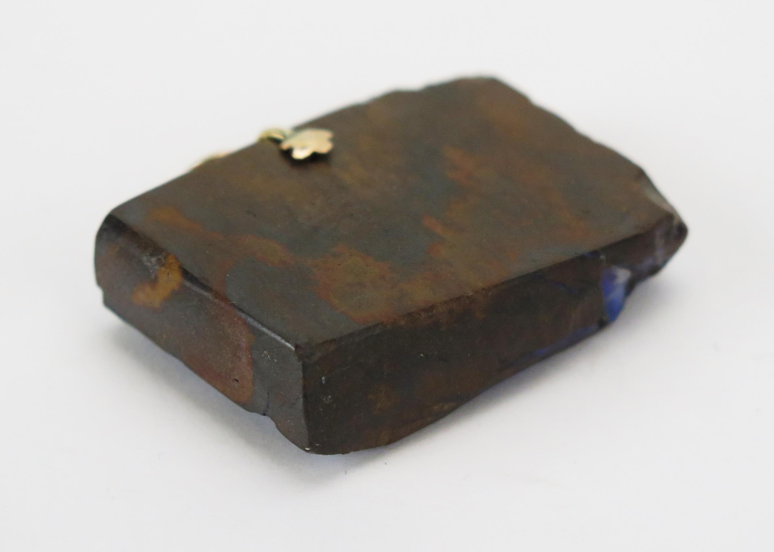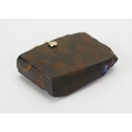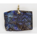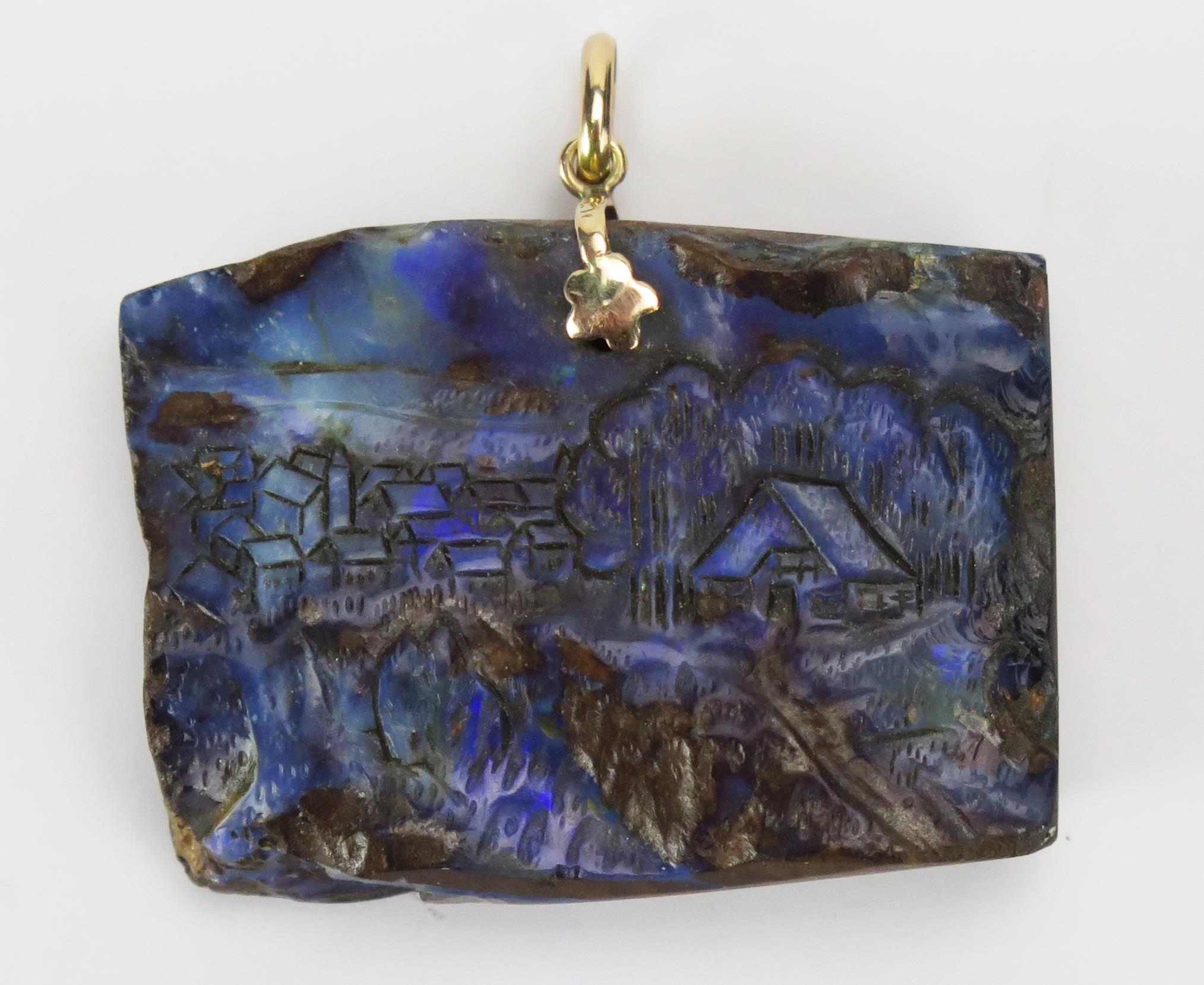 A 9ct Gold Carved Bolder Opal Pendant decorated with a village scene, 41.3mm wide, stamped 375, 27.83g