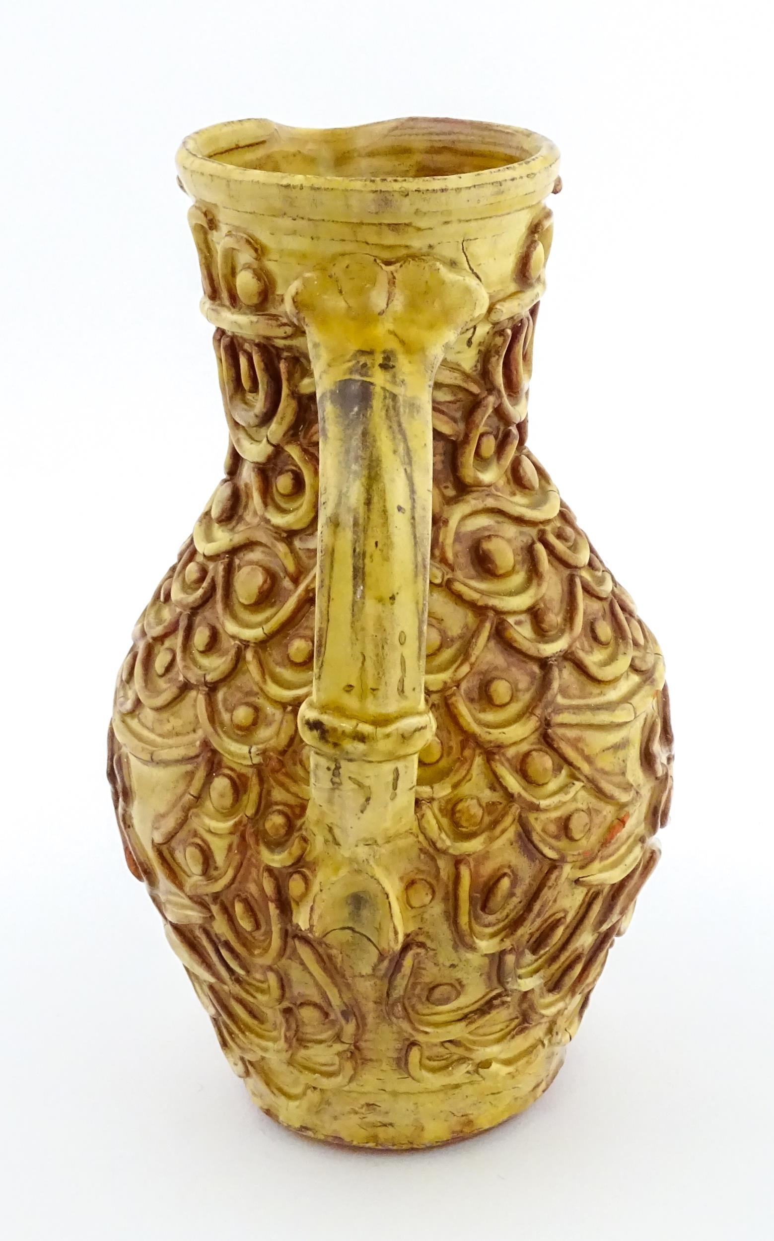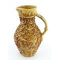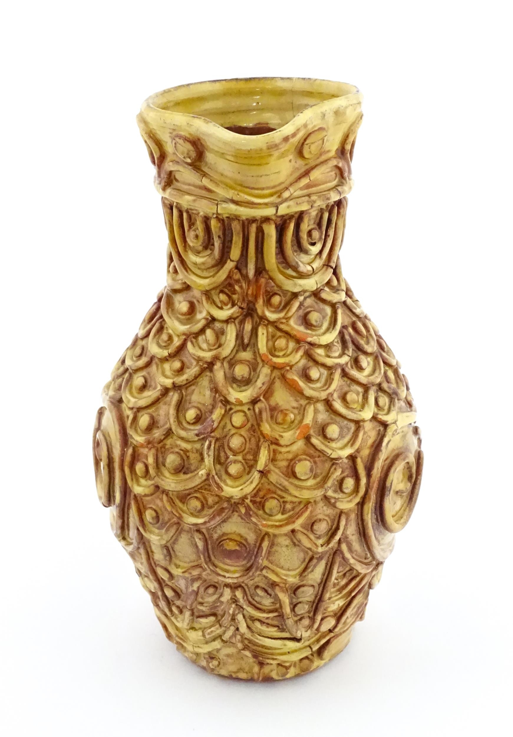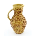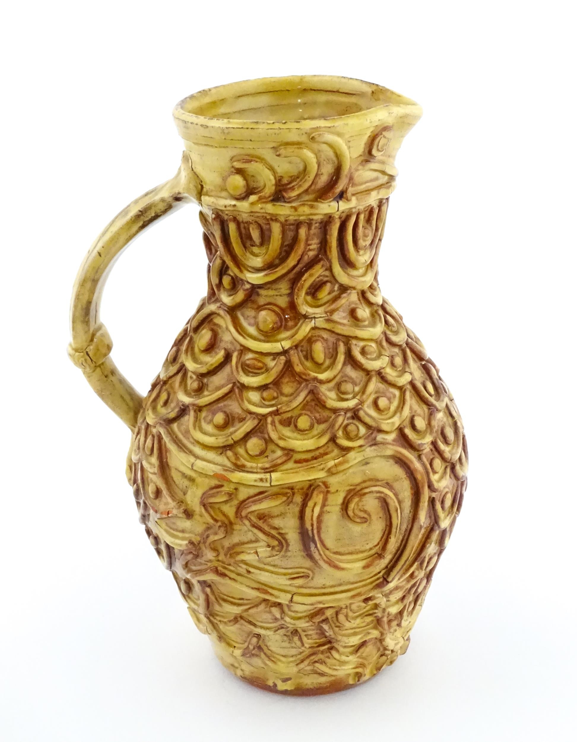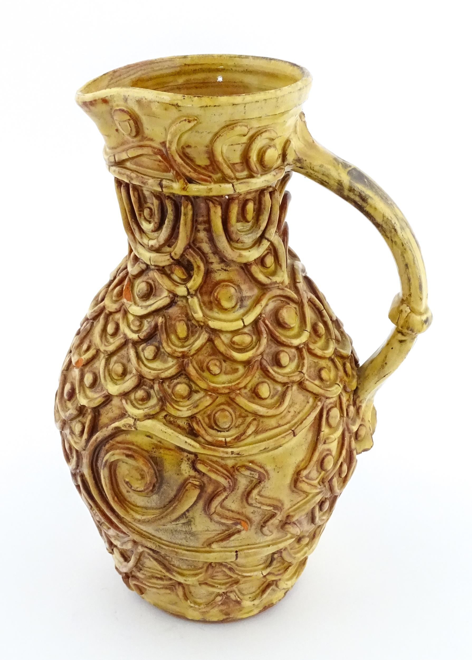 An Alistair Blake studio pottery jug with ochre glaze with applied stylised scale decoration. Stamped with maker's mark under. Approx. 11 1/4" high