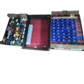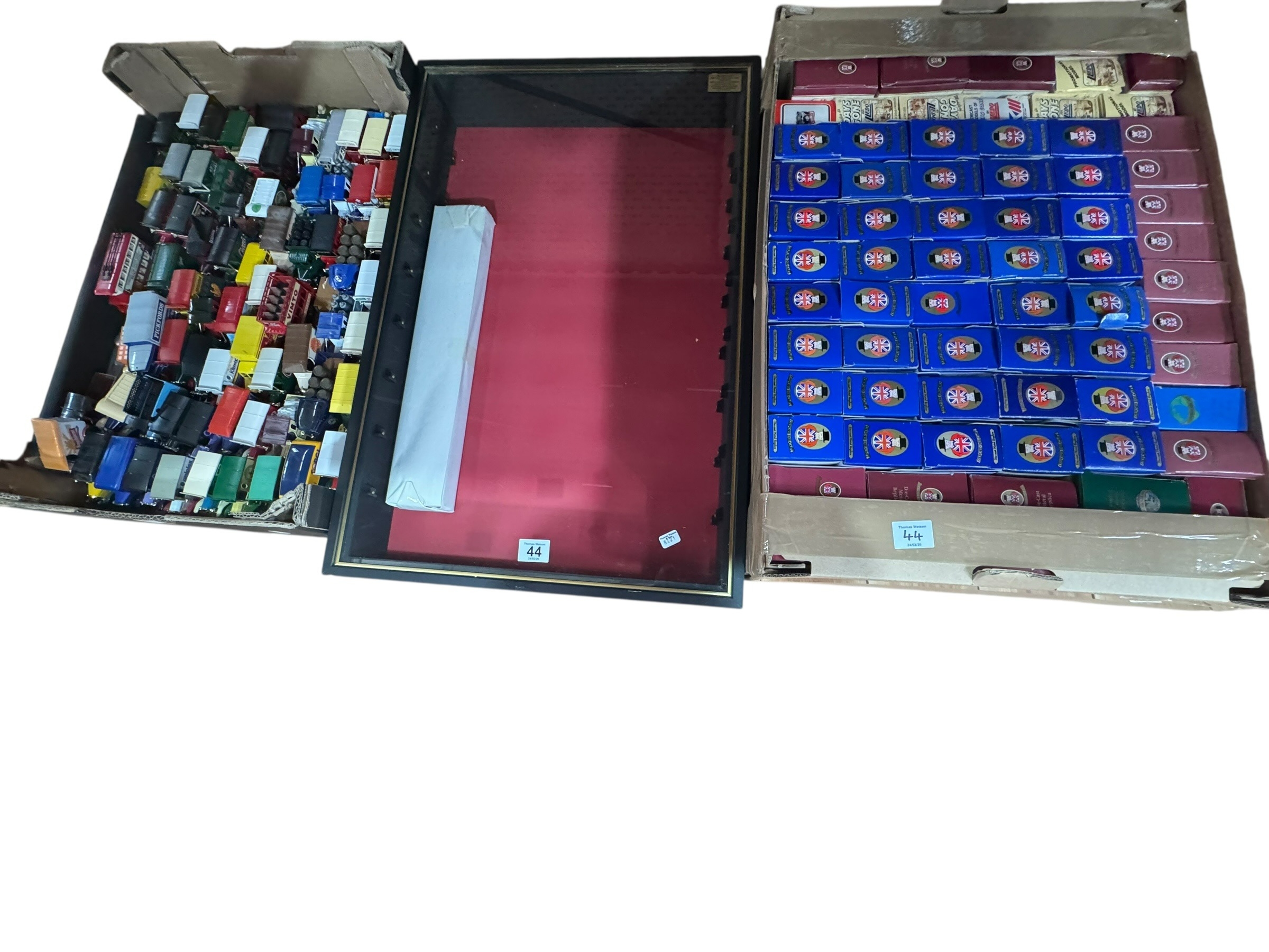 Two boxes of model vehicles and display case.