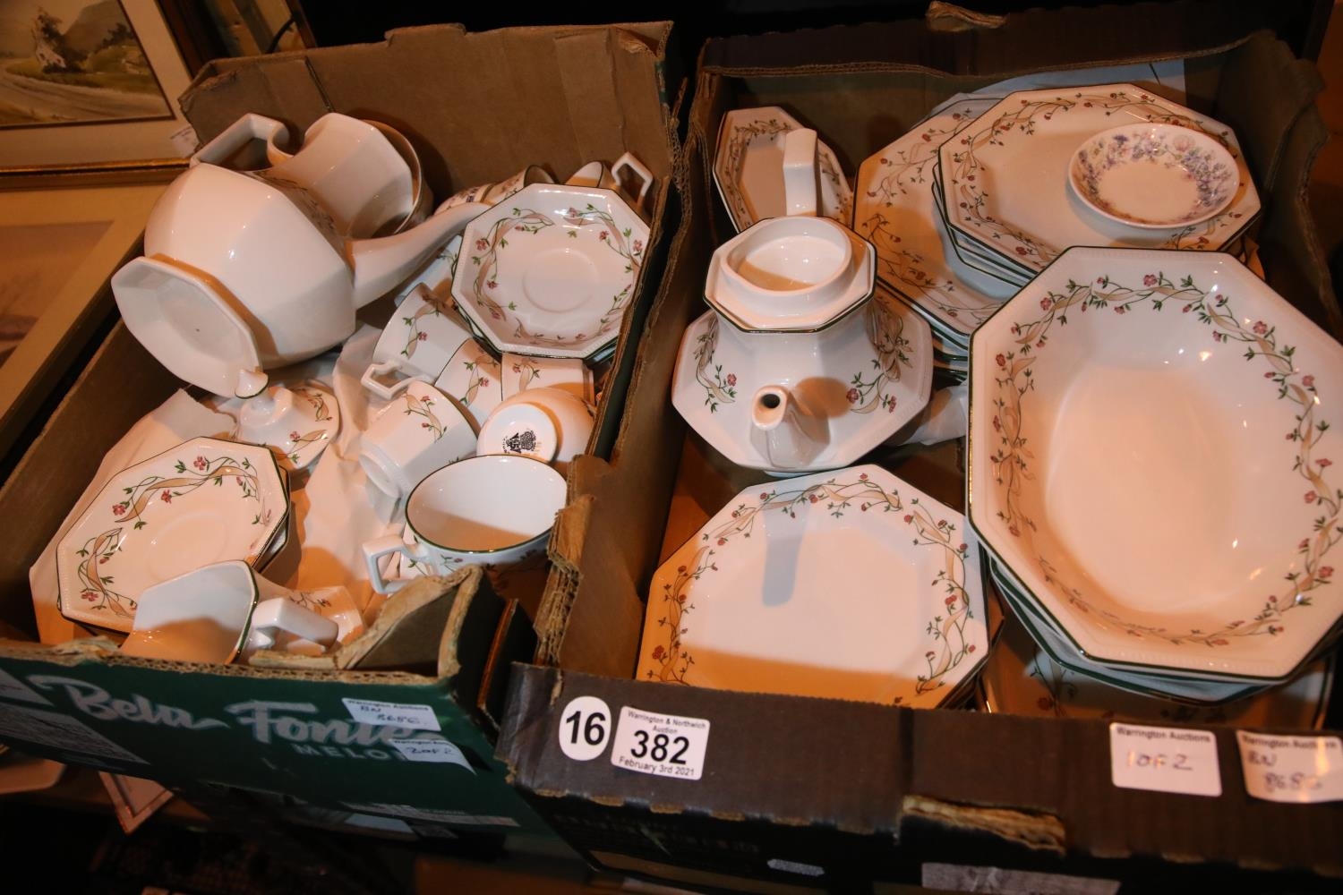 Two boxes of Johnson Brothers decorative dinner service. Not available for in-house P&P, contact Paul O'Hea at Mailboxes on 01925 659133