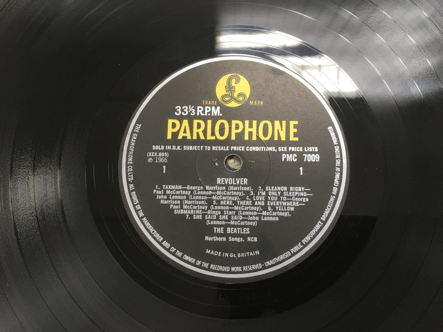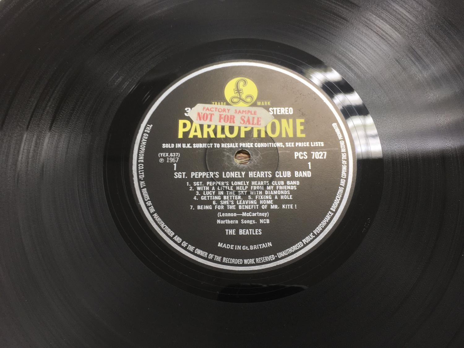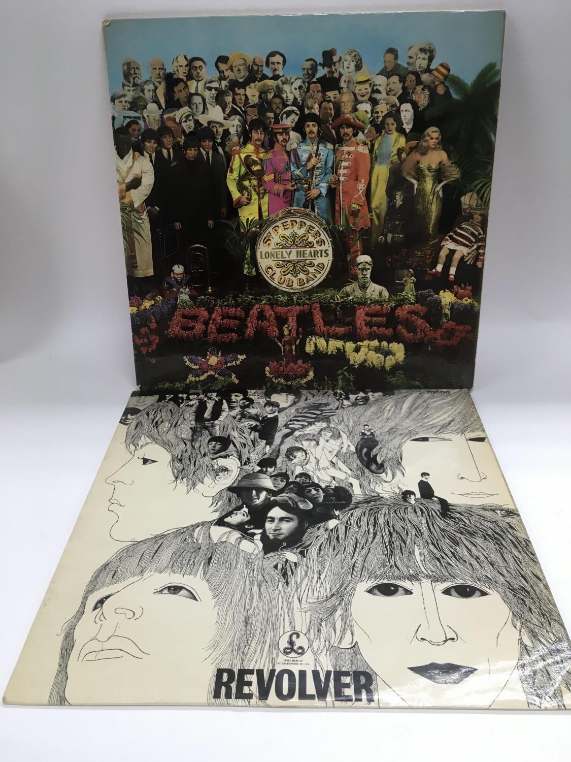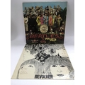Two Beatles LPs comprising a first UK mono pressing of 'Sergeant Pepper's Lonely Hearts Club Band' with Factory Sample sticker to Side 1 label, sleeve bumped in corners and owner's name written in biro to inside of record opening, vinyl is excellent with light spindle marks to centre holes, has original psychedelic inner sleeve but lacking cut outs. The other LP is a second UK mono pressing of Revolver with corrected Doctor Robert spelling on label, sleeve bumped in one corner, light surface marks and a deeper mark after the end of 'Tomorrow Never Knows' to vinyl.