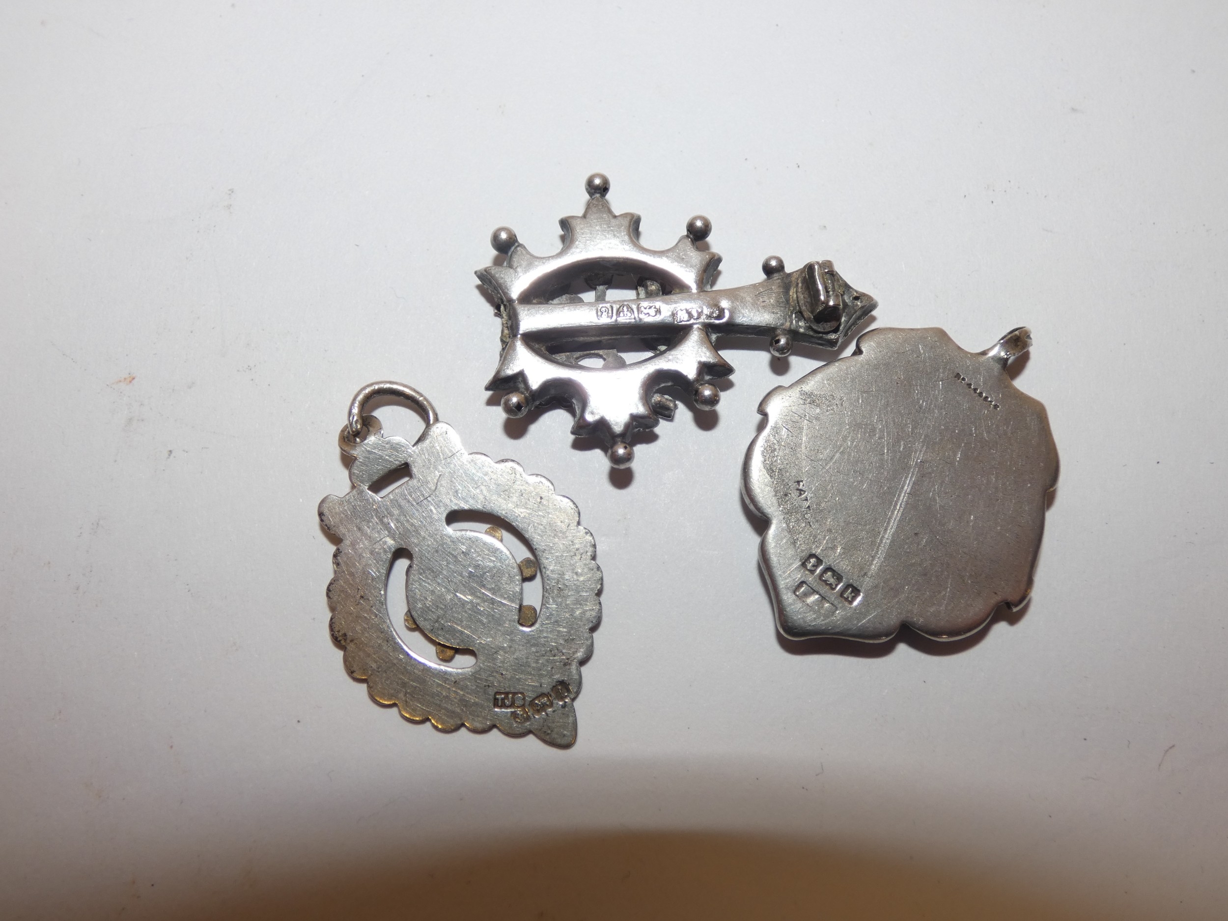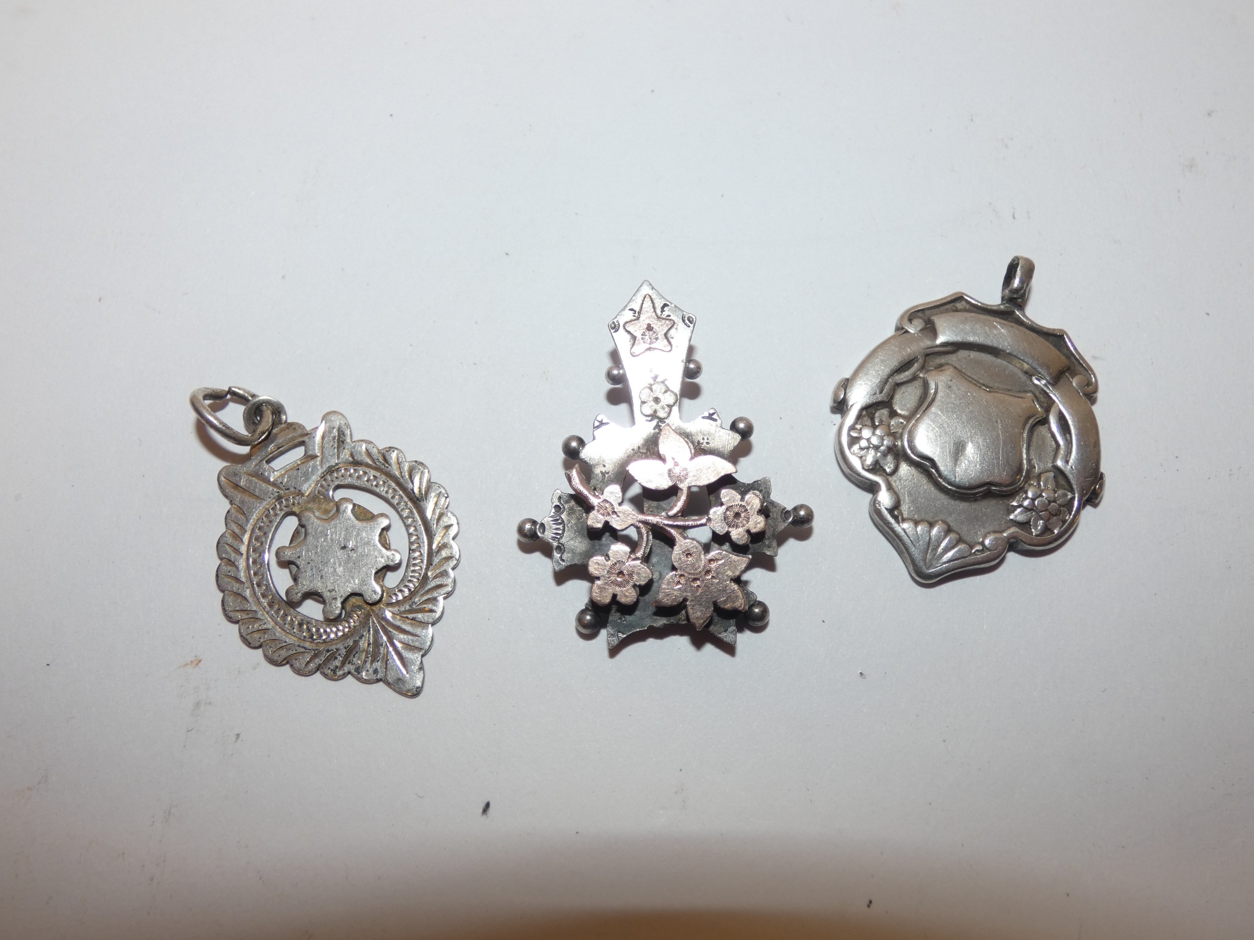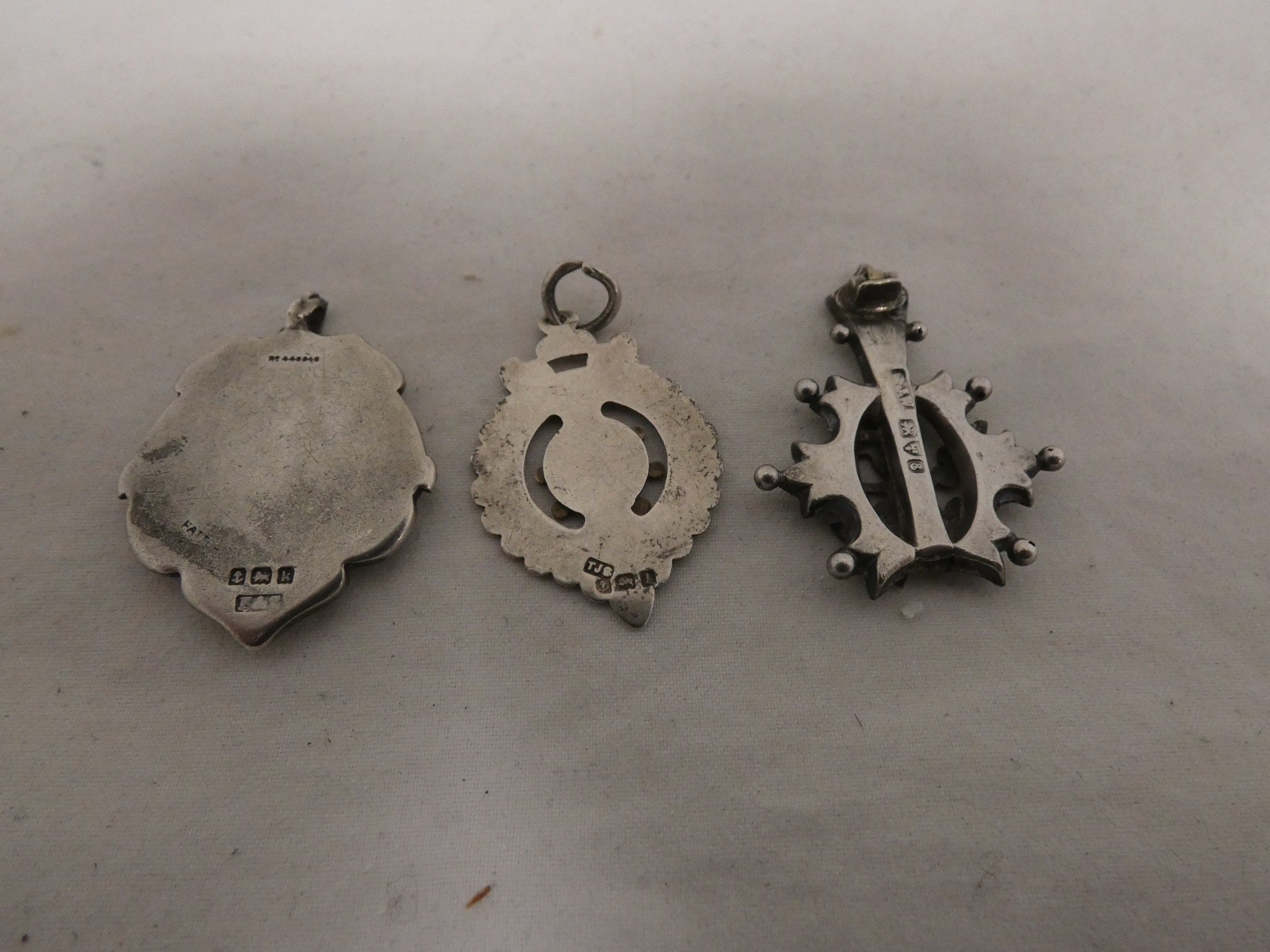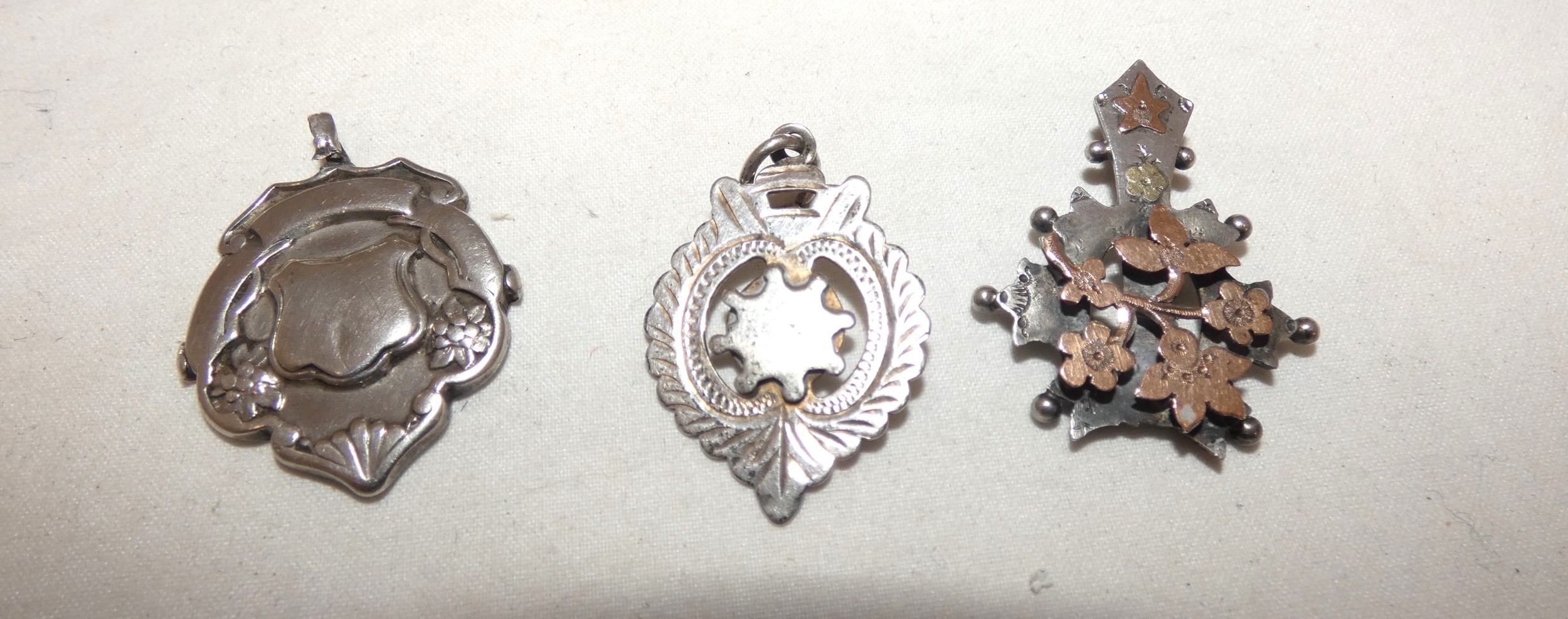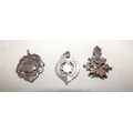 Silver overlaid pendant and two silver medal fobs, 178g gross.  (3)
