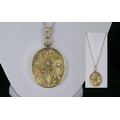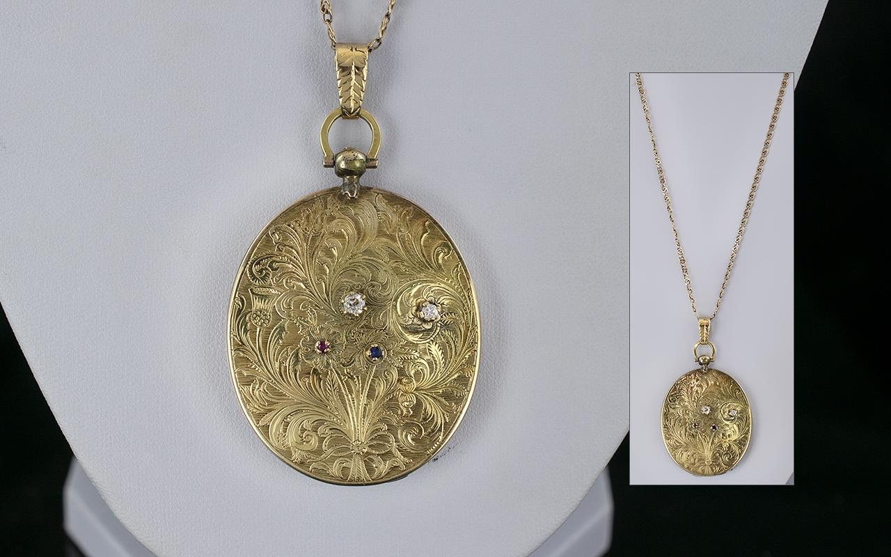 Antique Period - Excellent Quality 15ct Gold Large Oval Shaped Hinged Locket, With Exquisite Chased Decoration to Front and Back Covers, Which are Inset with 2 Diamonds, 1 Ruby & 1 Sapphire, With Later Attached 9ct Gold Long Fancy Chain. Size - Locket 2 Inches - 5 cms High. Gold Weight 17.2 grams.