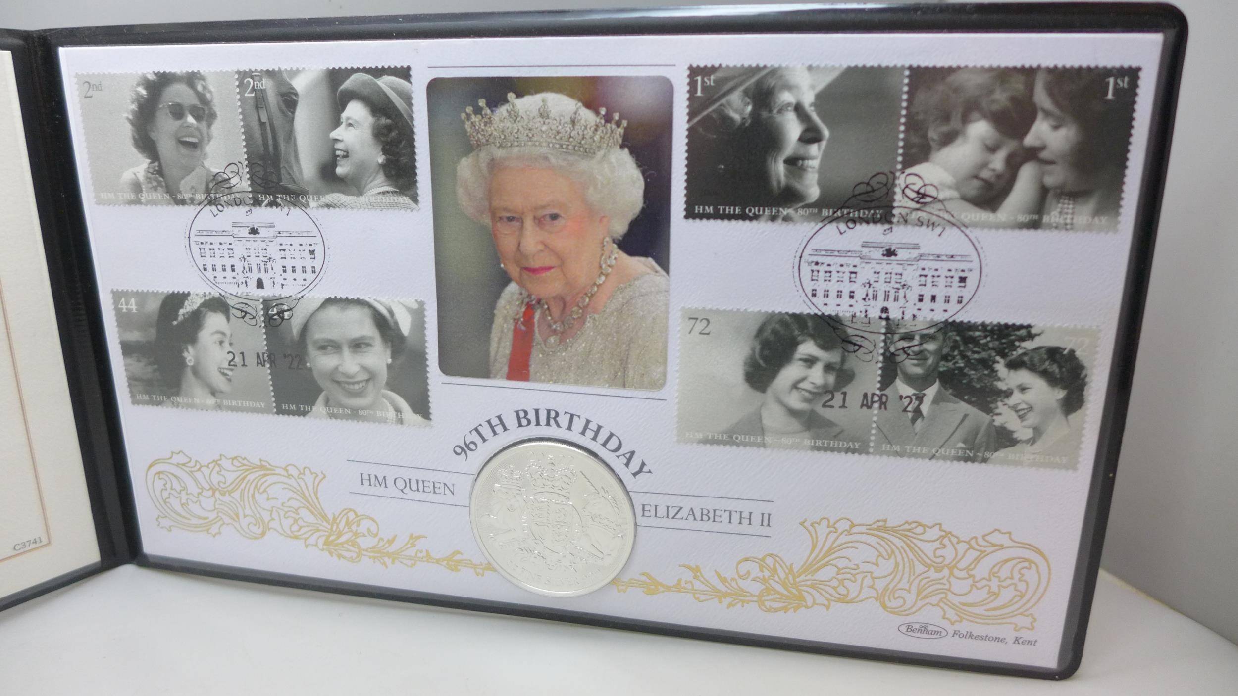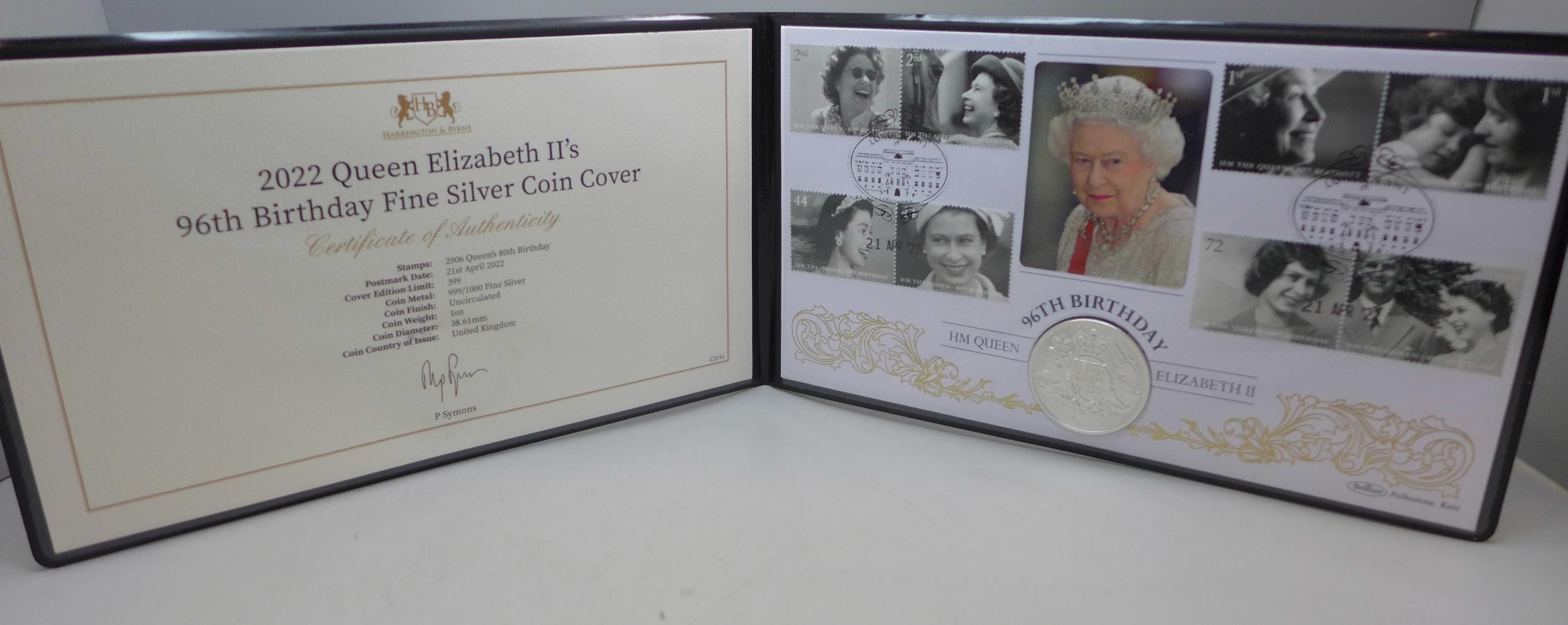 HM Queen Elizabeth II 96th Birthday, Harrington & Byrne, 2022 Queen Elizabeth II's 96th Birthday fine £2 10z silver coin cover, limited edition of 399