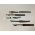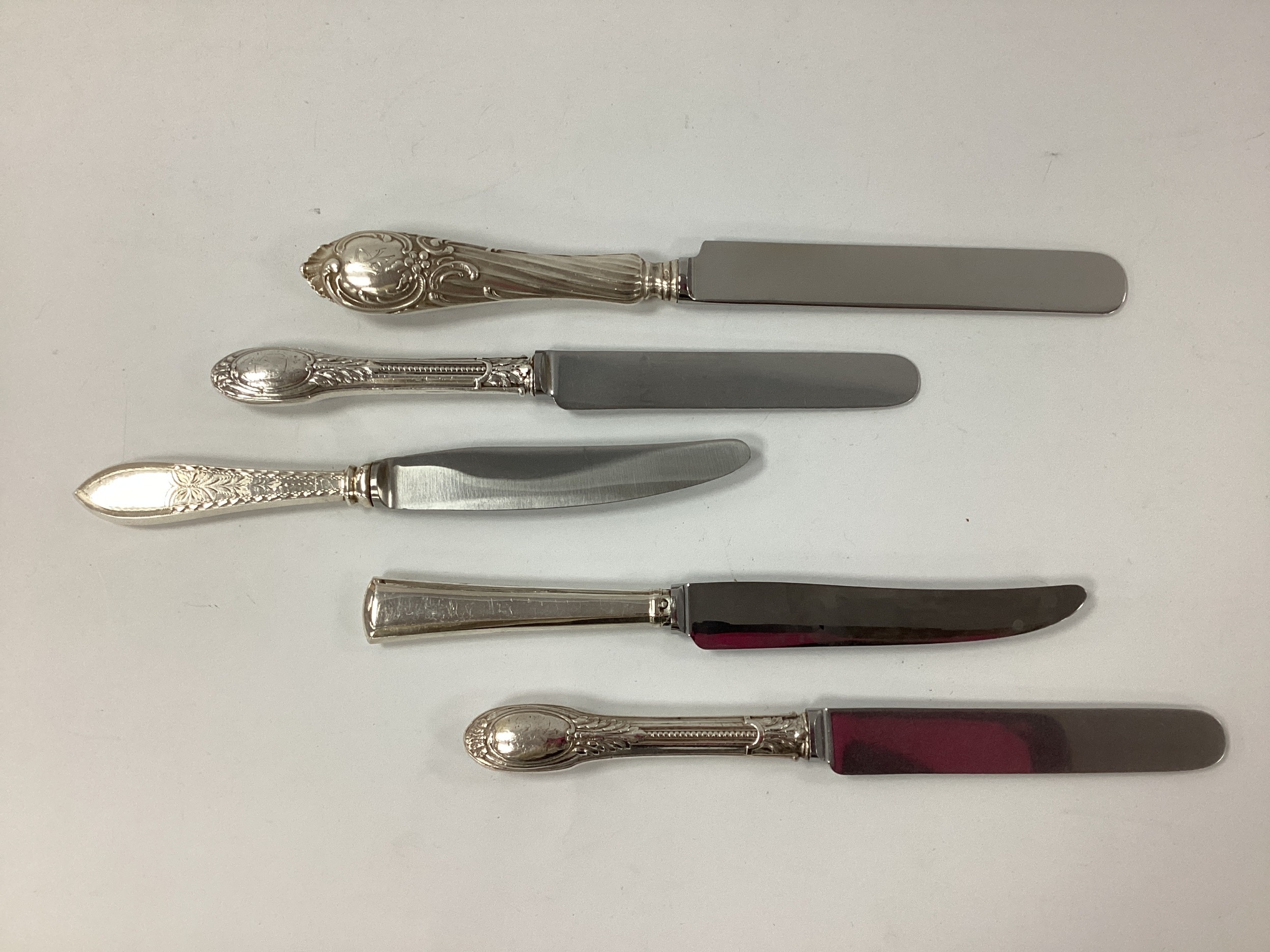 Five Decorative Continental Dessert and Table Knives, including 875 Russia, initialled; pair of French knives (Joseph Rodgers blades), Denmark (1910), etc, longest 26cm (all later blades). (5)