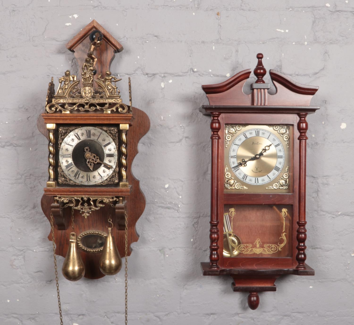 An oak Dutch Wuba wall clock, along with a Bentima Westminster chime wall clock.