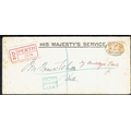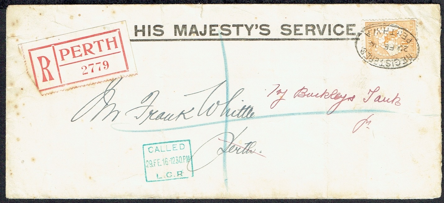 AUSTRALIA - Officials: 1916 (29 Feb) OHMS long cover (tone spots) bearing 4d orange OS perfin tied registered PERTH oval cancel and large red etiquette sent locally. Green boxed CALLED / 29 FE 16 - 12.30PM ./ L.C.R. Faults.