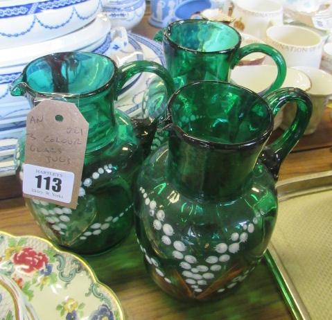 THREE ANTIQUE COLOURED GLASS JUGS