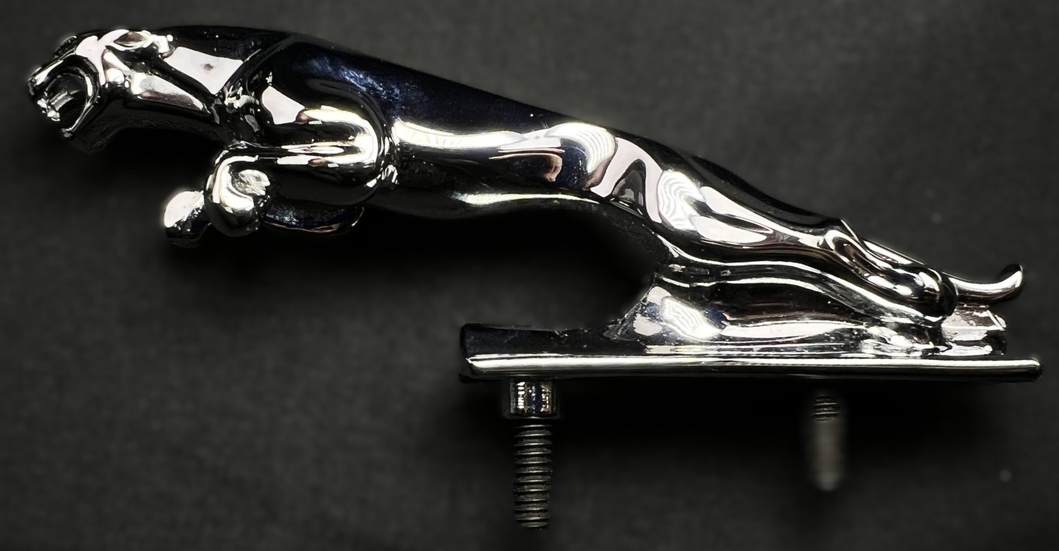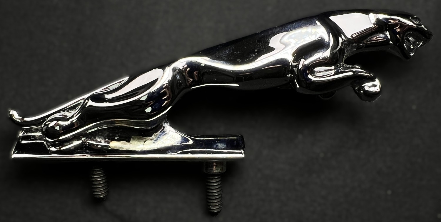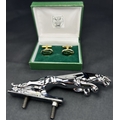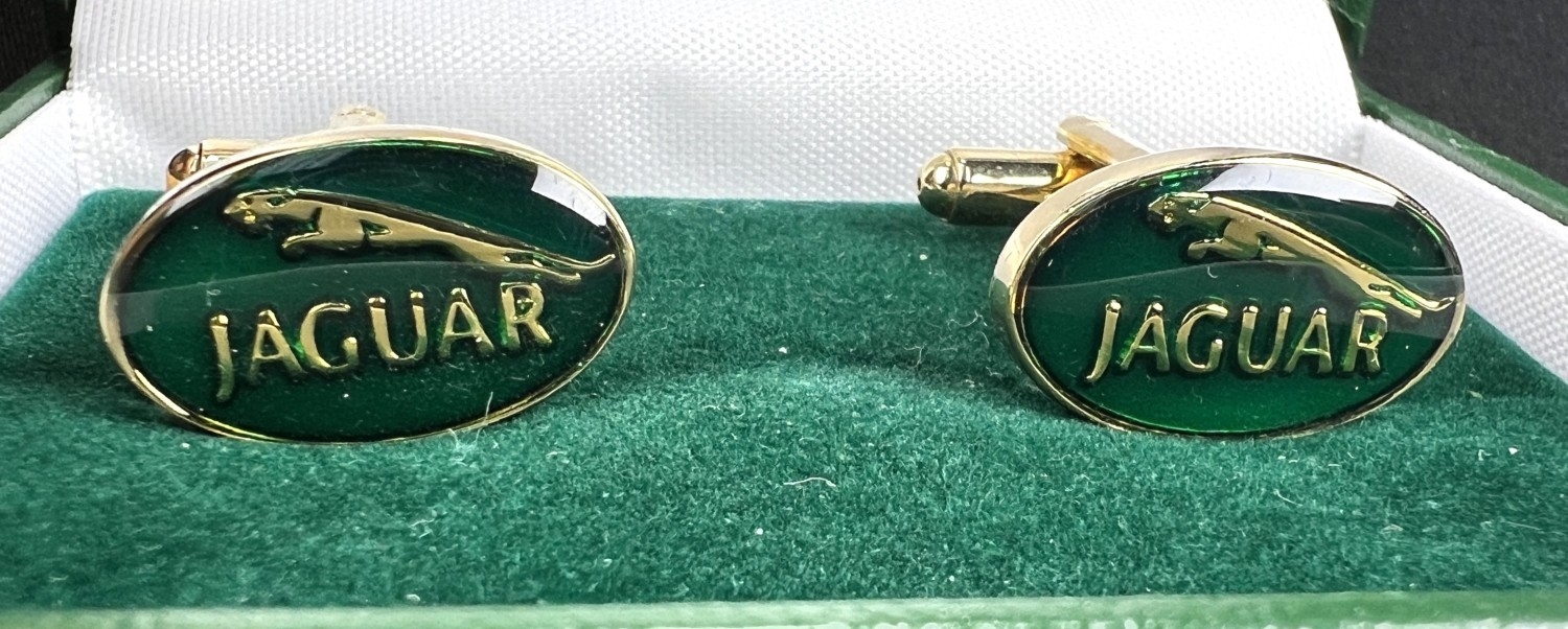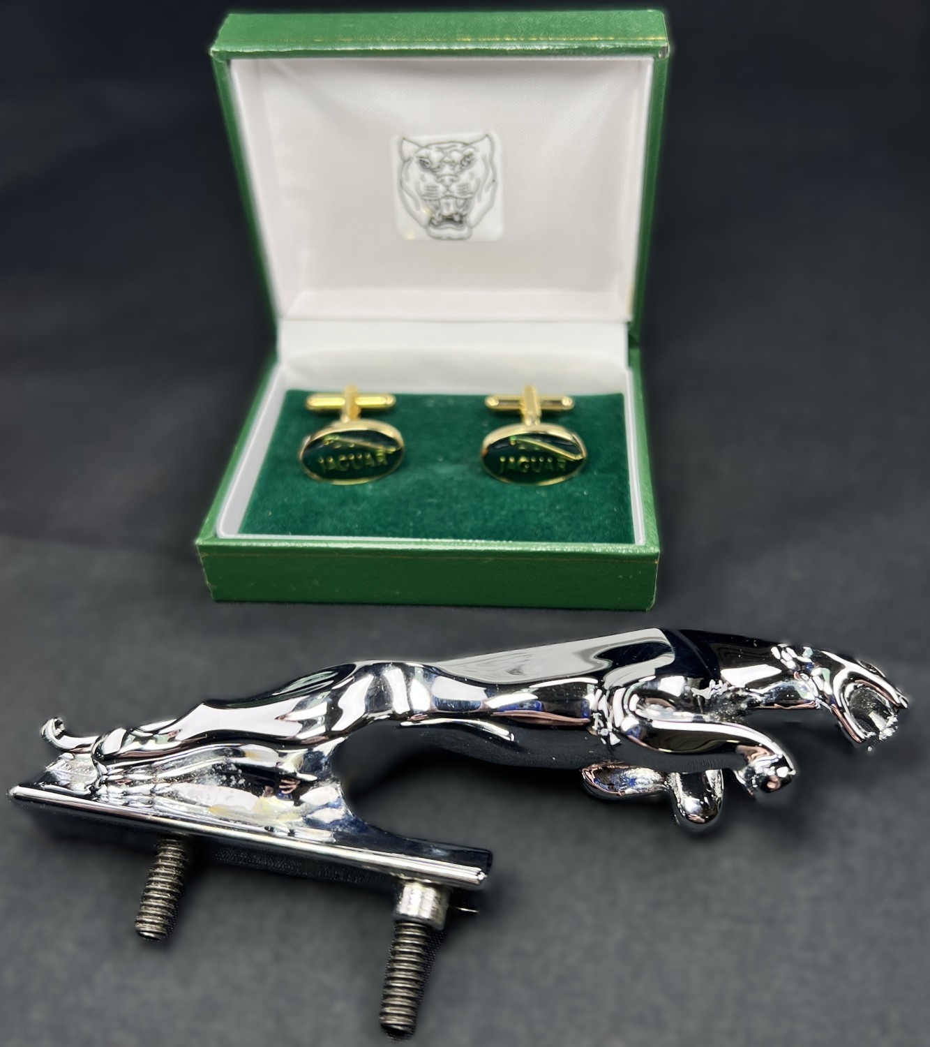 A chrome Jaguar car mascot and a pair of boxed Jaguar cufflinks