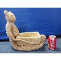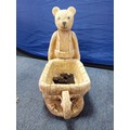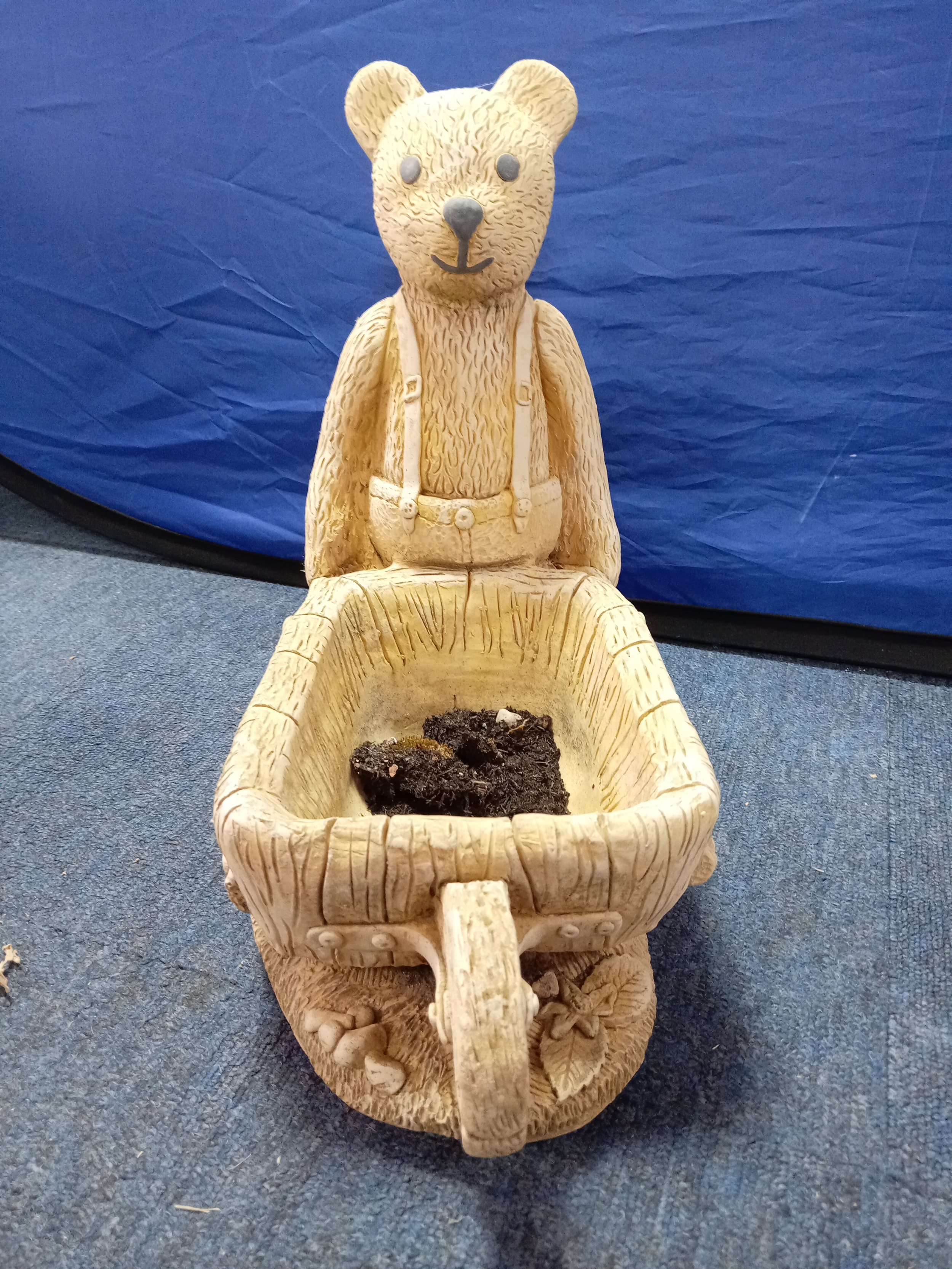 A heavy stone teddy bear pushing a wheel barrow planter