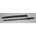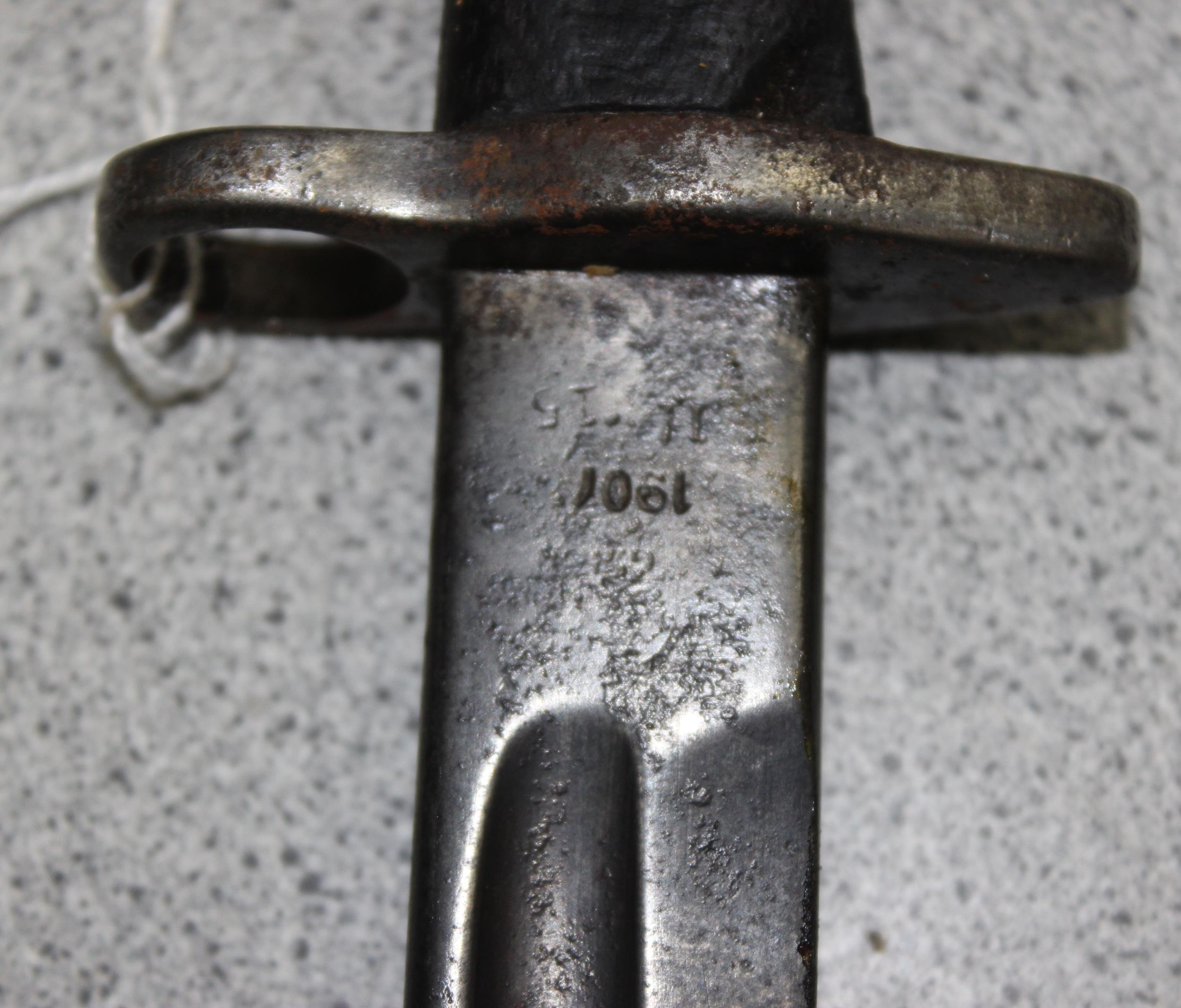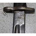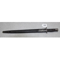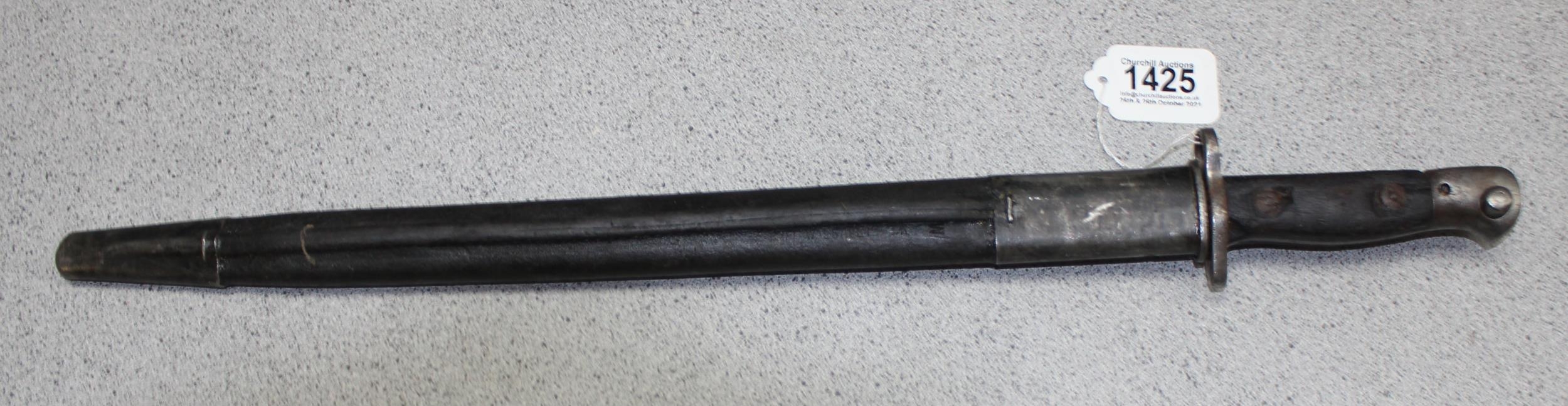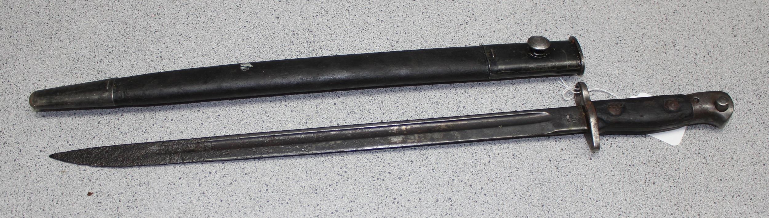 A WW1 period 1907 pattern Short Magazine Lee Enfield (SMLE) rifle sword bayonet with scabbard, various military markings to inc dated 1915 or 1916, approx 58cm long inc sheath