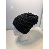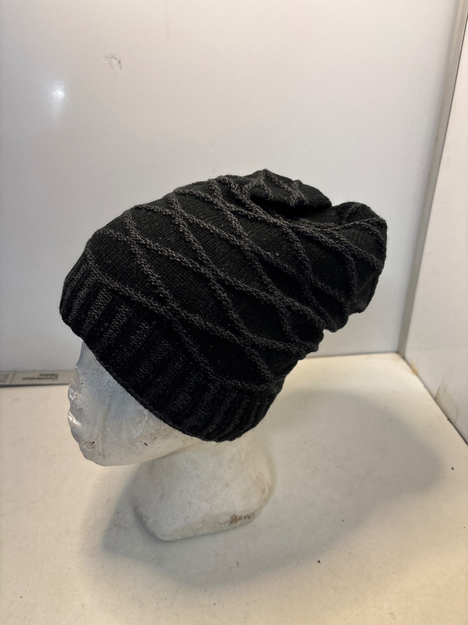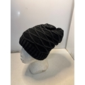 Black knit beanie with diagonal ribbed pattern.