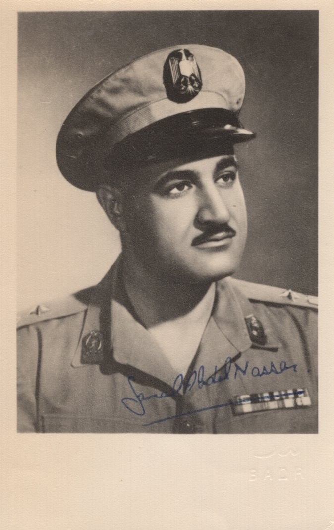 Gamal Abdel Nasser,(1918-1970) signed 5.5x3.5 inch portrait postcard. Nasser was a pivotal Egyptian military officer and revolutionary leader who served as the second president of Egypt from 1954 until his death in 1970. His policies and actions deeply influenced the political and social landscape of Egypt and the wider Arab world.
