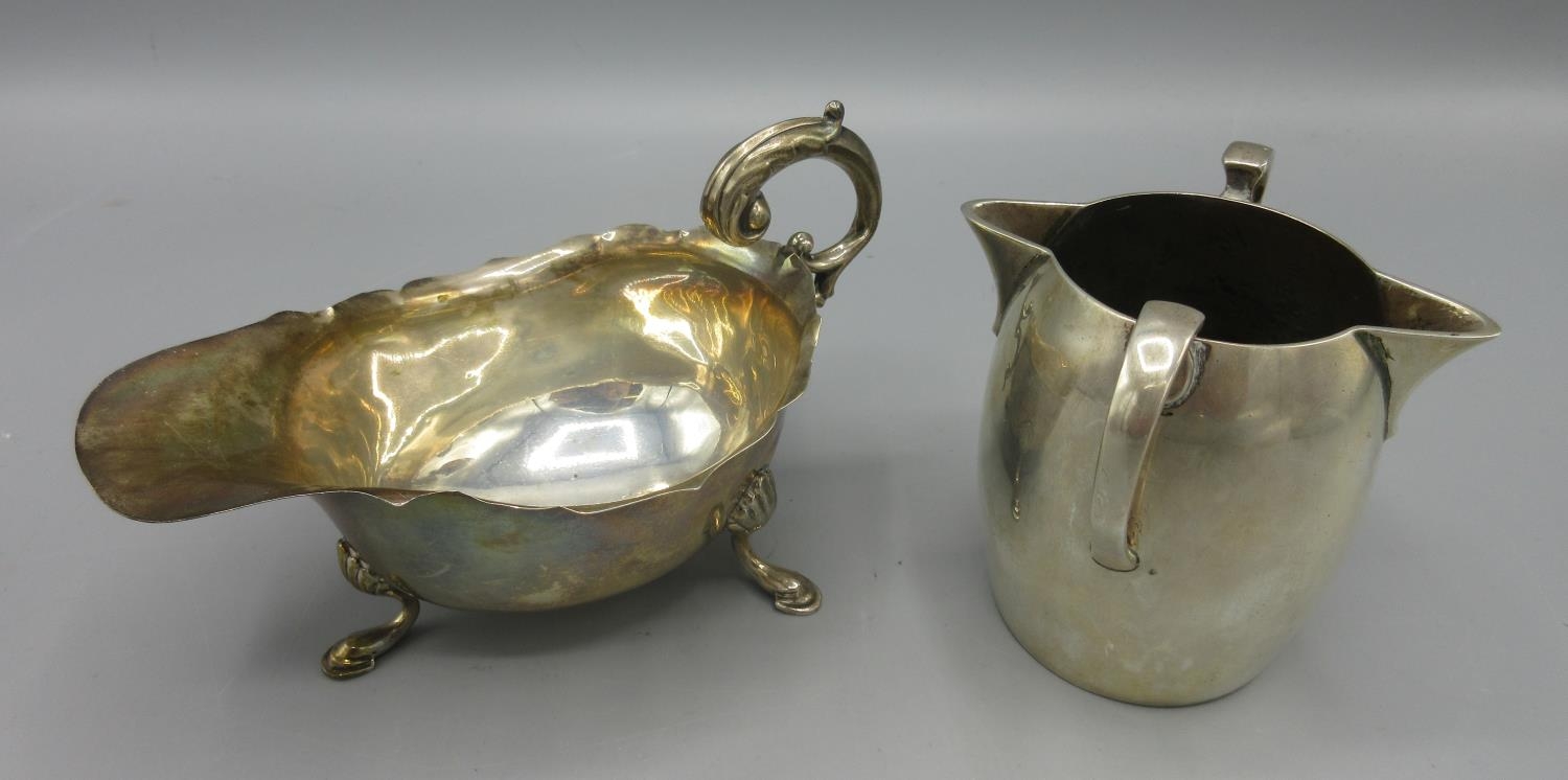 George V silver double spout cream jug by Page, Keen & Page, London 1913, and a silver sauce boat with flared pie crust rim, three shell cast hoof feet and scroll handle by S Blanckensee & Son Ltd, 6.27ozt