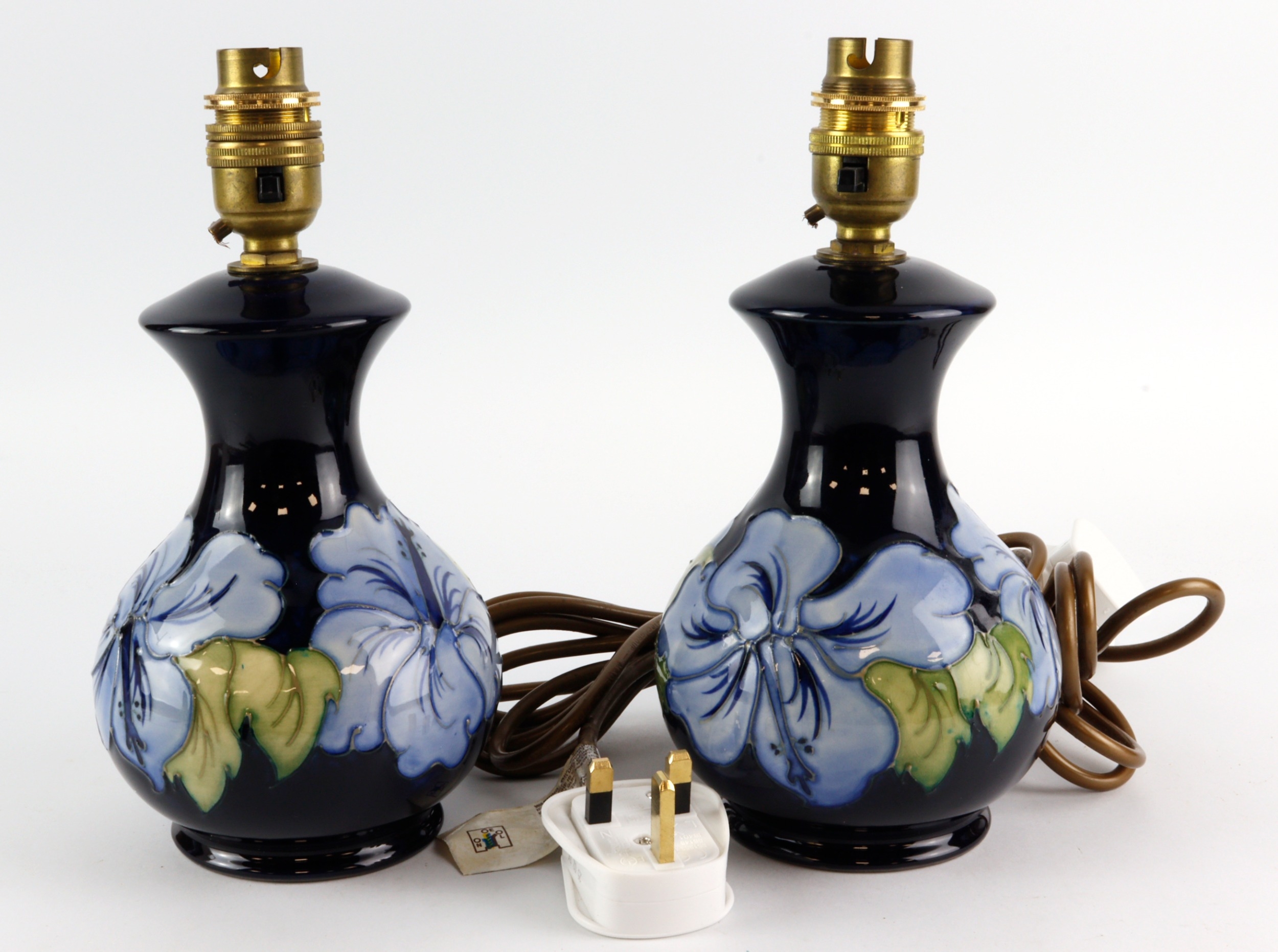 Moorcroft. Two 'Hibiscus' pattern blue lamps, design by Walter Moorcroft, height 23cm approx including fittings, stamped to base. Untested.