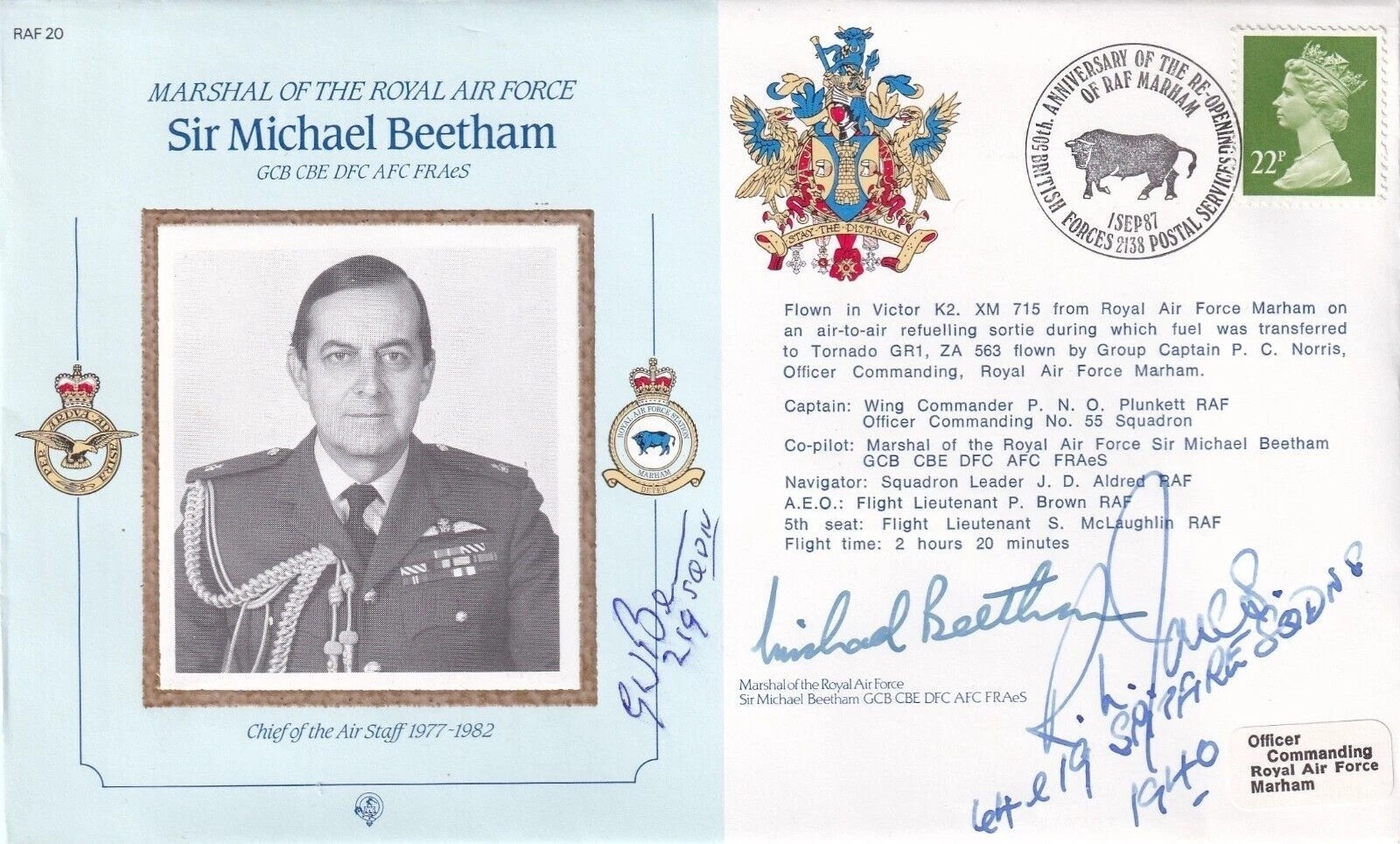 MRAF Michael Beetham Signed, G W Benn, R L Jones both Battle of Britain. 1 Sep 87 BFPS 2138 50th Anniversary of the Re Opening of RAF Marham Special postmark. Marshal of The Royal Air Force Sir Michael Beetham GCB CBE DFC AFC FRAeS. Chief of the Air Staff 1977 to 1982 Blue flown cachet Flown in Victor K2 XM 715 from RAF Marham on an air to air refuelling sortie during which fuel was transferred to Tornado GR1, ZA 563. Personally Signed by Marshal of the Royal Air Force Sir Michael Beetham, GCB CBE DFC AFC FRAES. G W Benn 219 Sqn Air Gunner Battle of Britain. R L Jones 64 and 19 Sqns Battle of Britain Fighter. Certified copy no 0744 of 1200 Signed F/O R J Brown Very Few additional Signed by Benn and Jones. G Holder. Single Vendor RAF cover collection. Good condition. All autographs come with a Certificate of Authenticity. We combine postage on multiple winning lots and can ship worldwide. UK postage from £5.99, EU from £7.99, Rest of World from £9.99