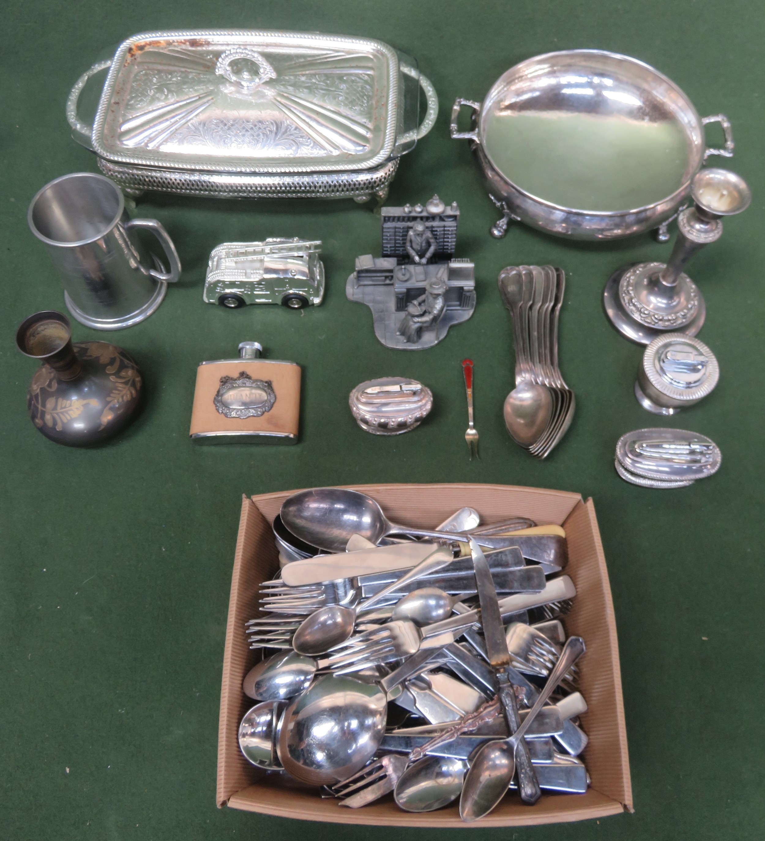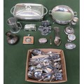 Mixed lot of Silver Plated ware, flatware including first period Christofle, enamelled silver spoon, pewter figure group, table lighters etc