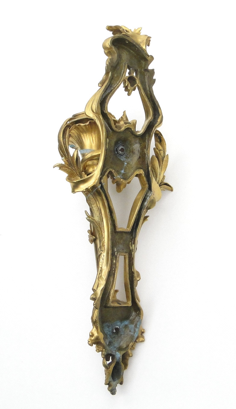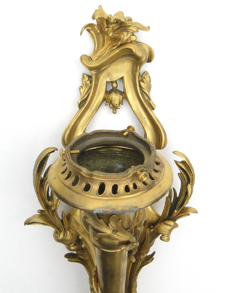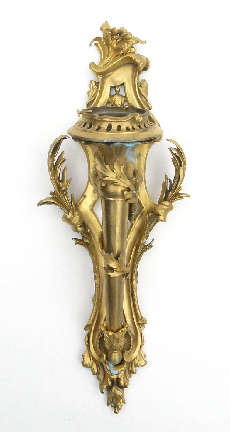Ormolu wall applique, the torch shaped stem supported by leaves on a lyre shaped back, 60cm high