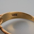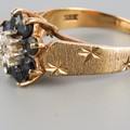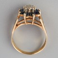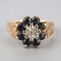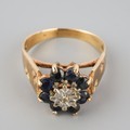 A 9ct gold diamond and sapphire cluster ring. Hallmarked 9ct gold, approx ring size O, approx gross weight 3.5 grams.