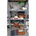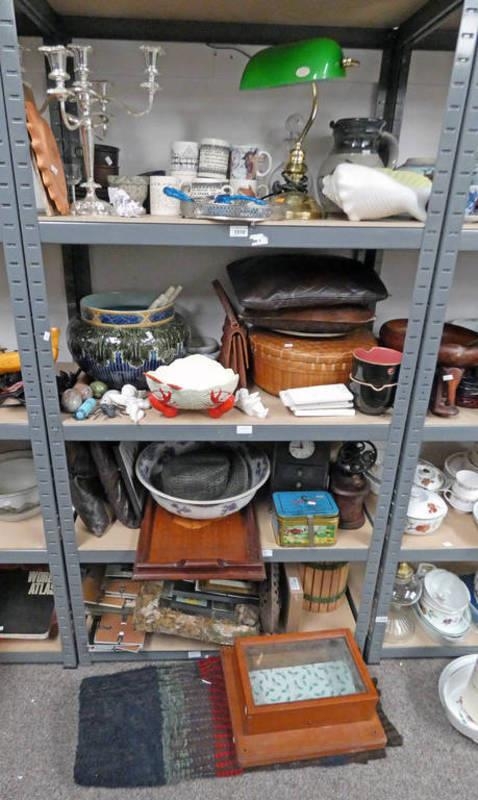 SELECTION OF VARIOUS ITEMS INCLUDING BANKERS LAMP, CUSHIONS, MUGS AND OTHERS OVER FOUR SHELVES