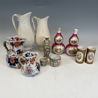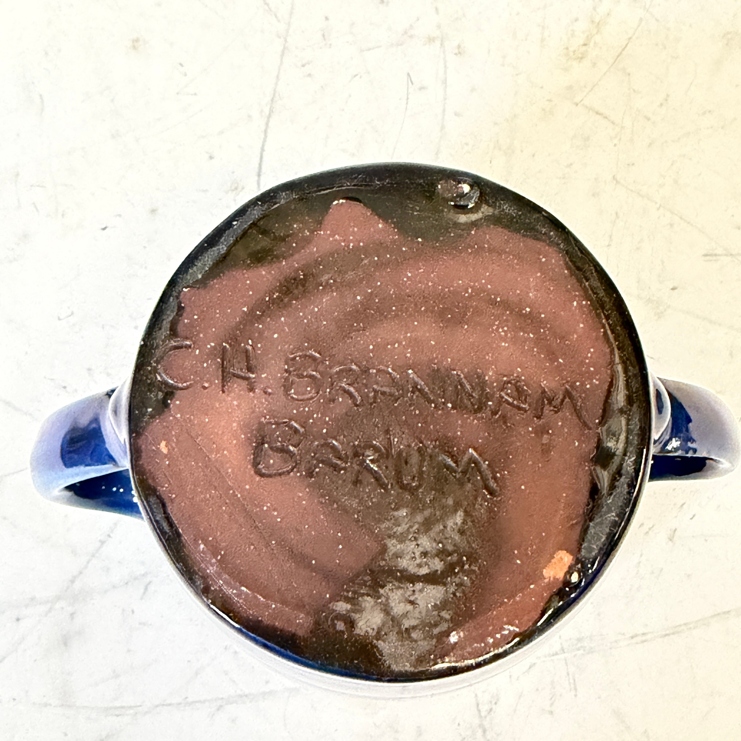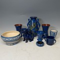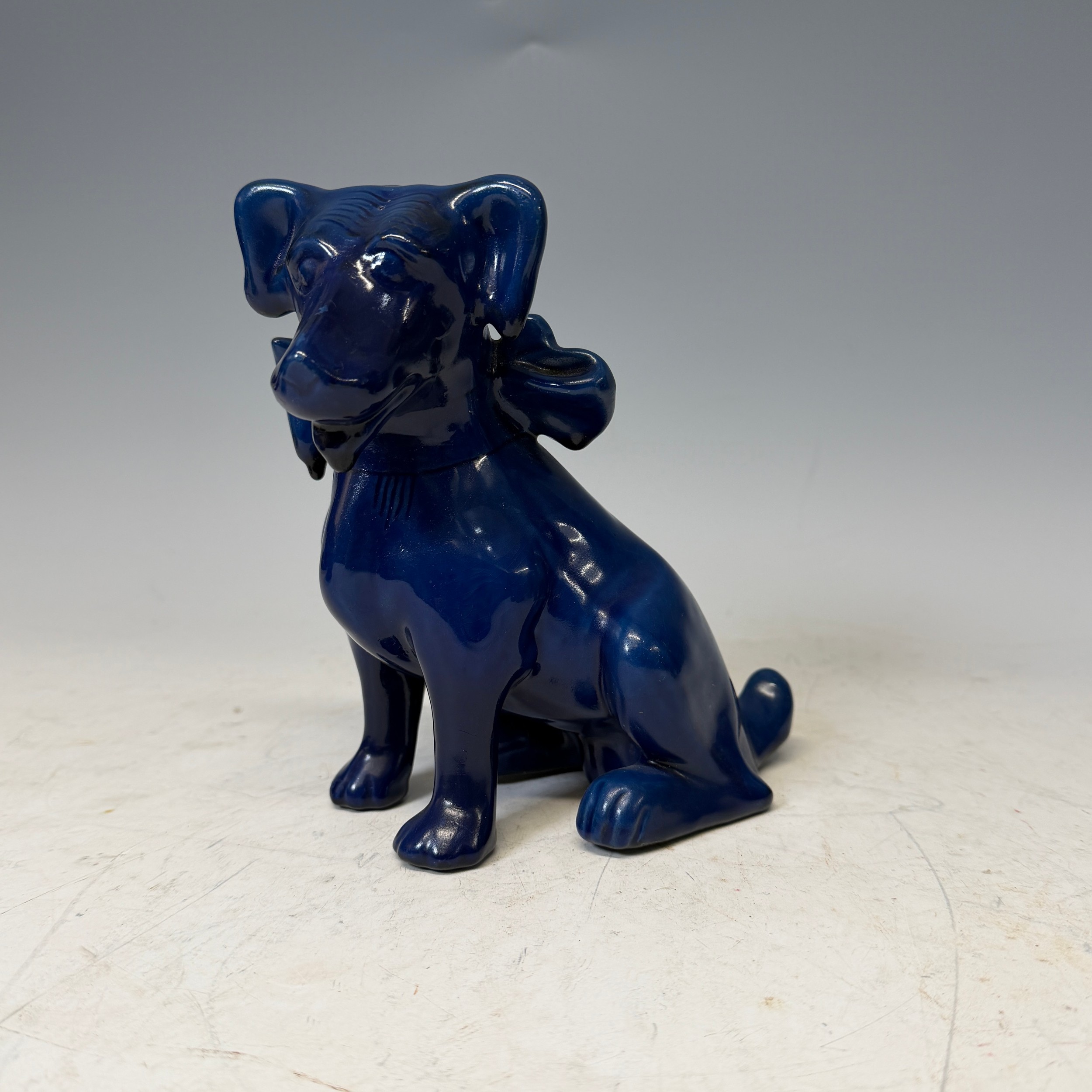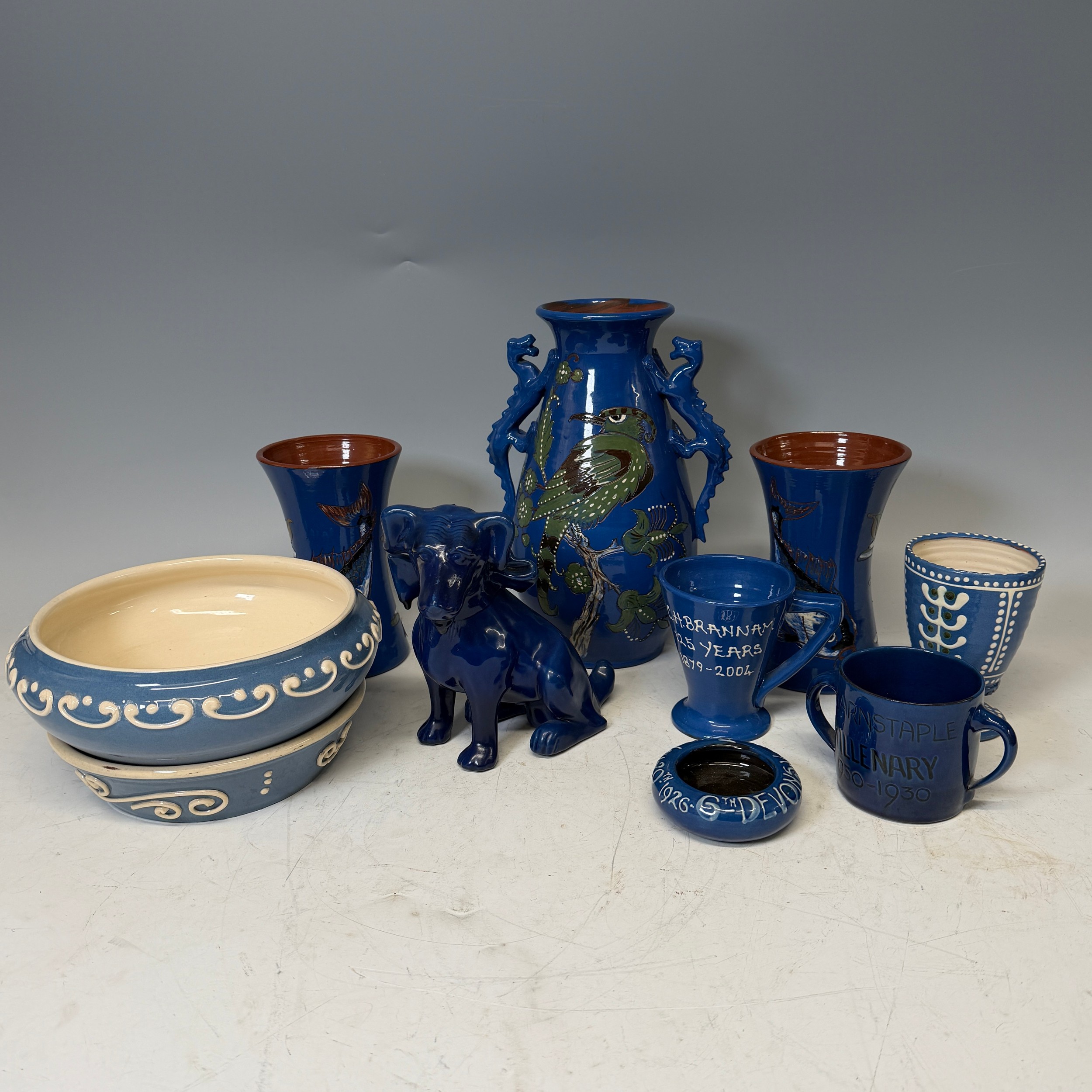 A C. H. Brannam glazed figure of a Dog, modelled with collar, impressed signature to base, H 18cm, with five other pieces of Brannam pottery, including two cups, together with four pieces of North Devon pottery. (10)