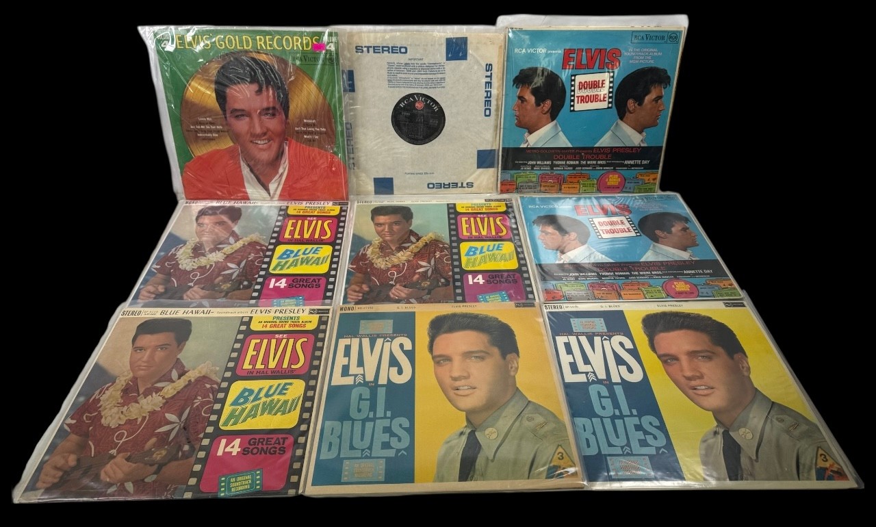 Selection of Elvis Presley records to include Double Trouble Mono RD-7892 Stereo SF-7892, Elvis in G.I. Blues RD-27192 SF-5078, Blue Hawaii RD-27238 3x SF-5115 and Elvis' Gold records Volume 4 Mono RD 7924
