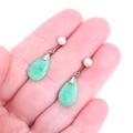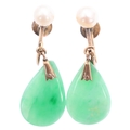 A pair of Chinese 14ct gold jade and pearl drop earrings, set with polished teardrop jade and whole pearl, with screw-back fitting, 27.2mm, 2.7g