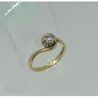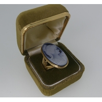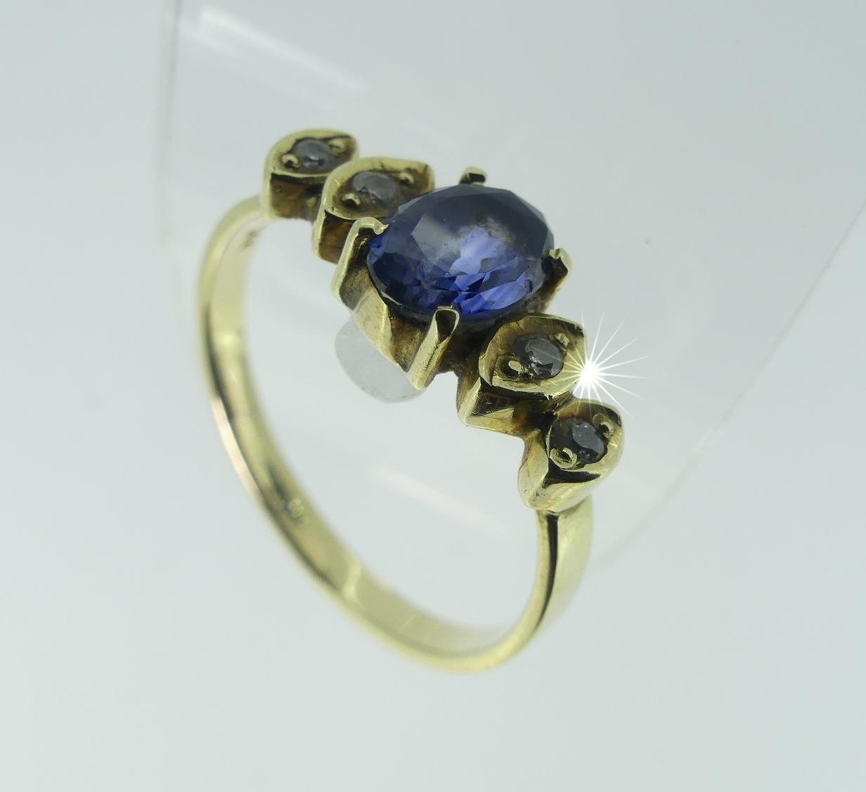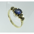 A sapphire and diamond Ring, the central facetted oval sapphire with two graduated diamonds on each side, the mount and shank in 14k gold, Size N.