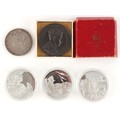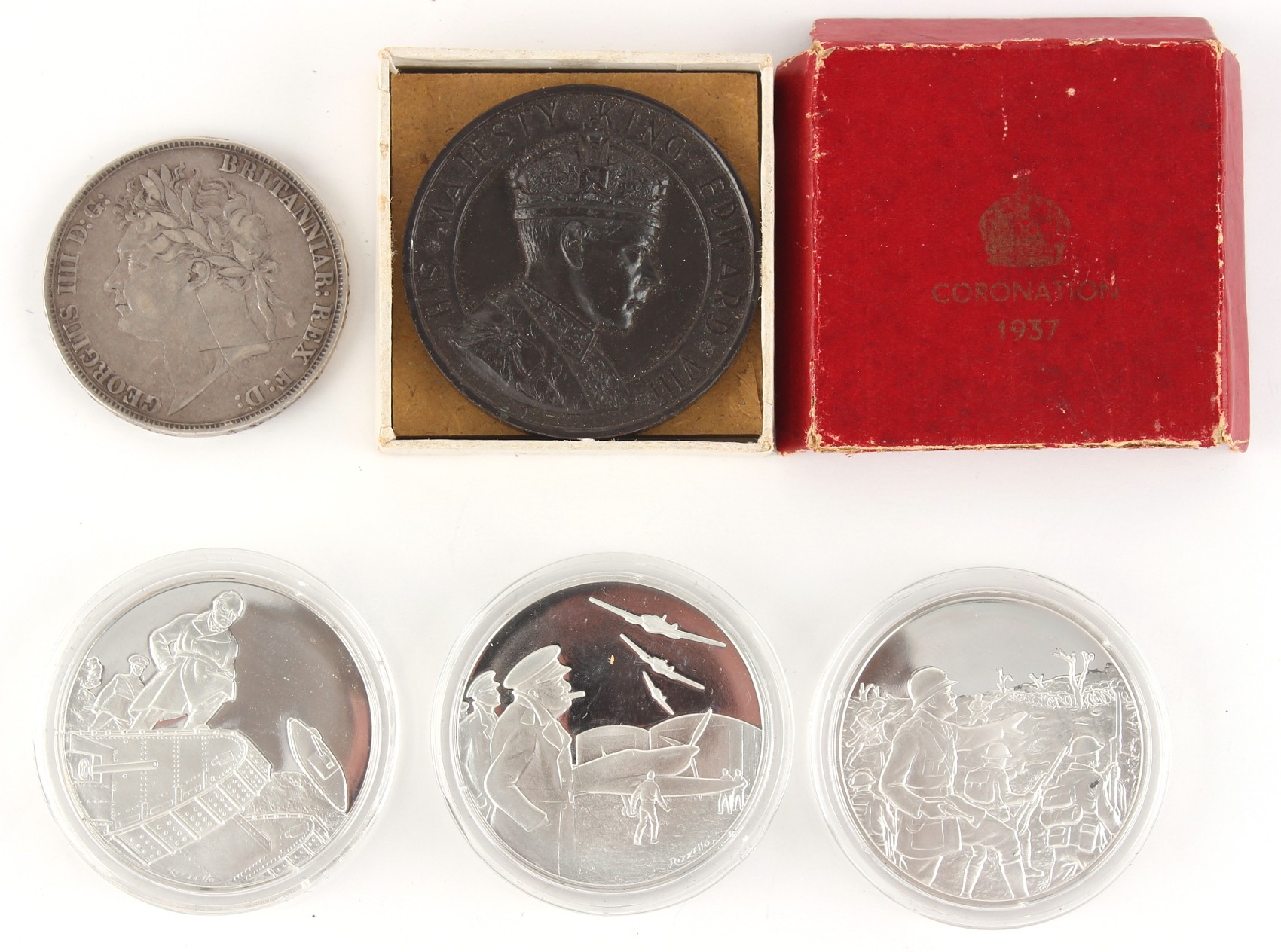 Property of a lady - coins - an 1821 George IV silver crown; together with three silver coins commemorating Winston Churchill, each approximately 25 grams, in capsules; and a boxed 1937 King Edward VIII coronation medal (5).