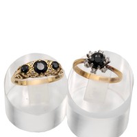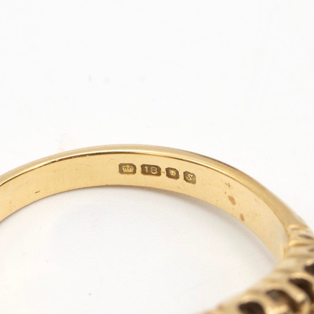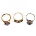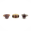 An 18ct gold, diamond and garnet set ring, size N 1/2, along with two other 18ct gold cluster rings, size L 1/2 and N 1/2, 15.2 grams.