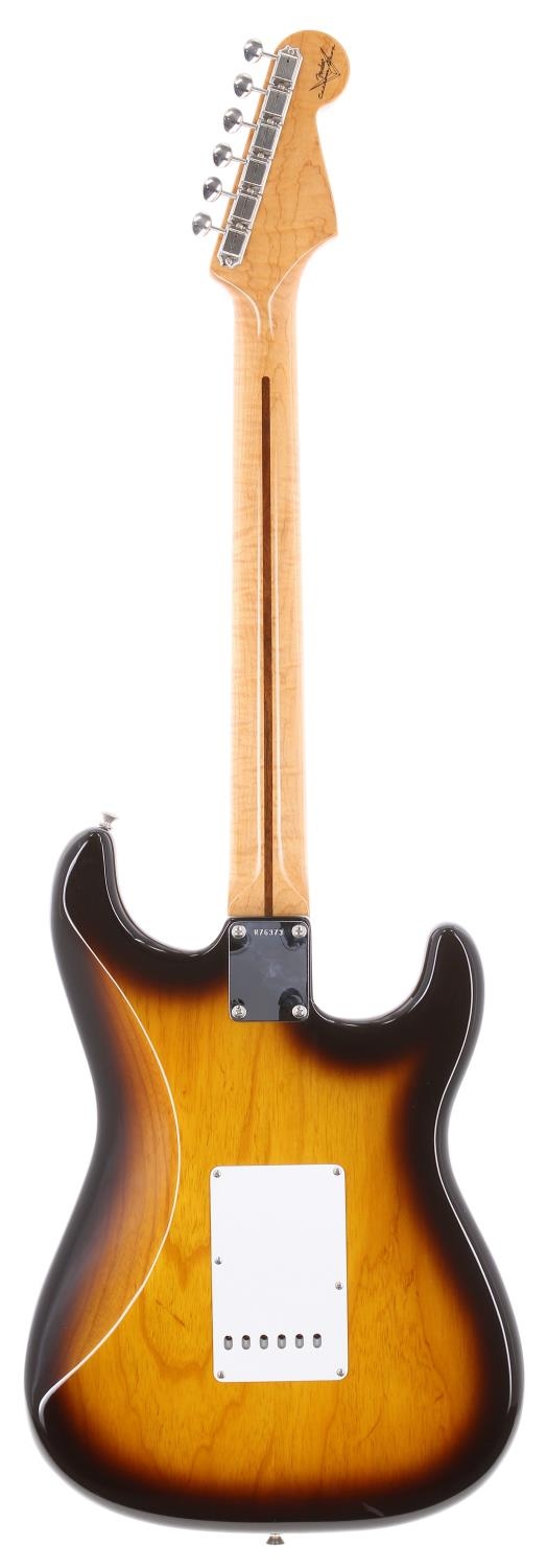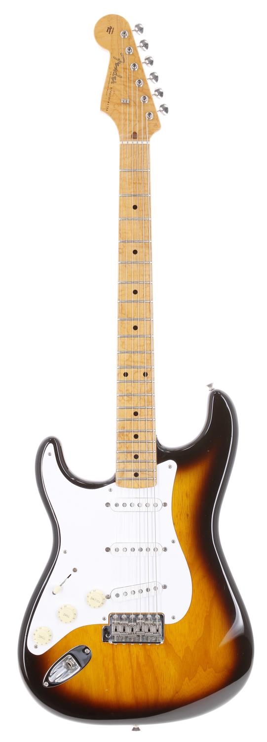 2014 Fender Custom Shop 1955 Stratocaster NOS left-handed electric guitar, made in USA; Body: two-tone sunburst finish; Neck: highly figured maple; Fretboard: maple; Frets: good; Electrics: working; Hardware: good; Case: original hard case with certificate of authenticity, papers and accessory pack; Weight: 3.17kg; Overall condition: very good