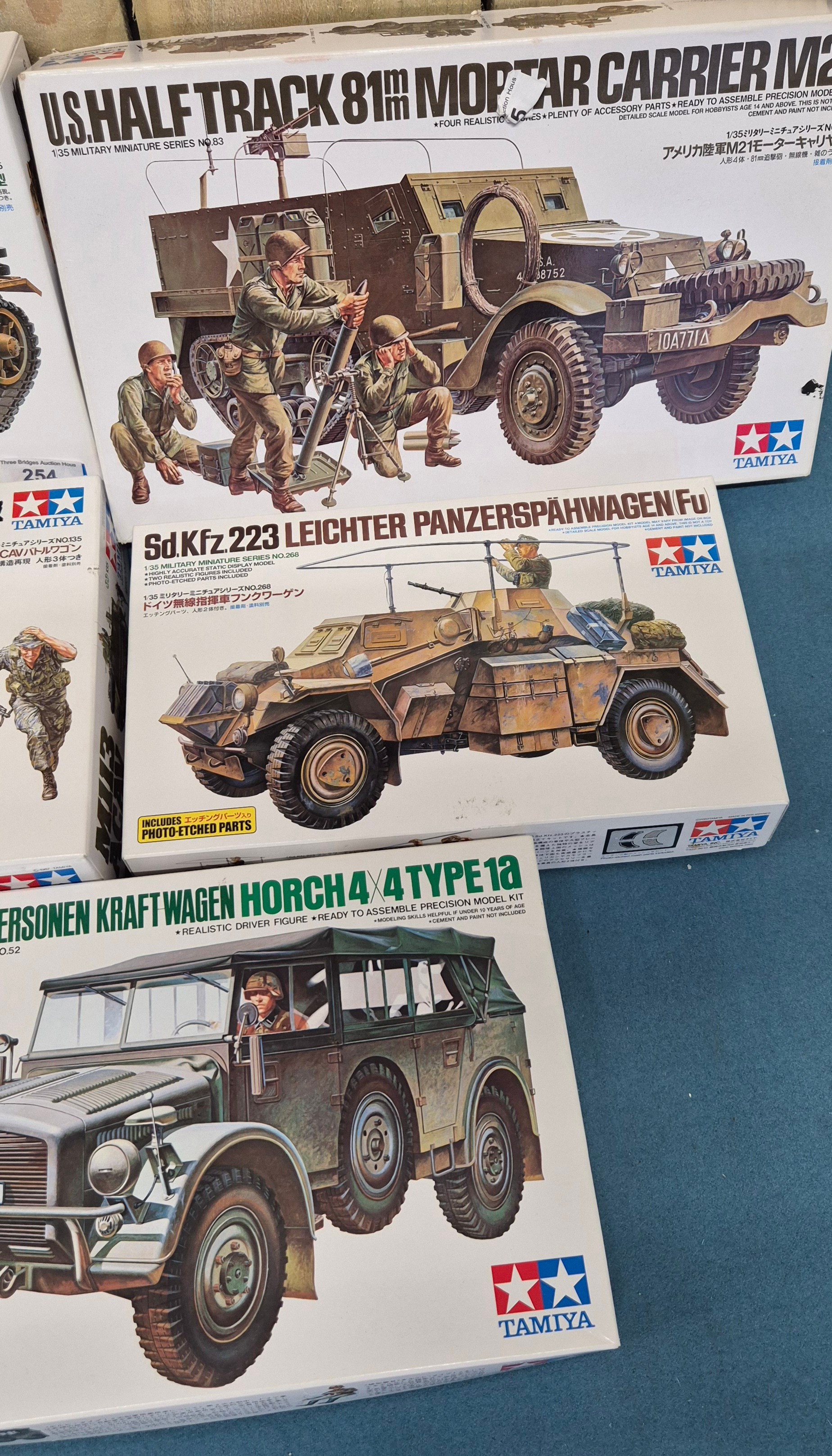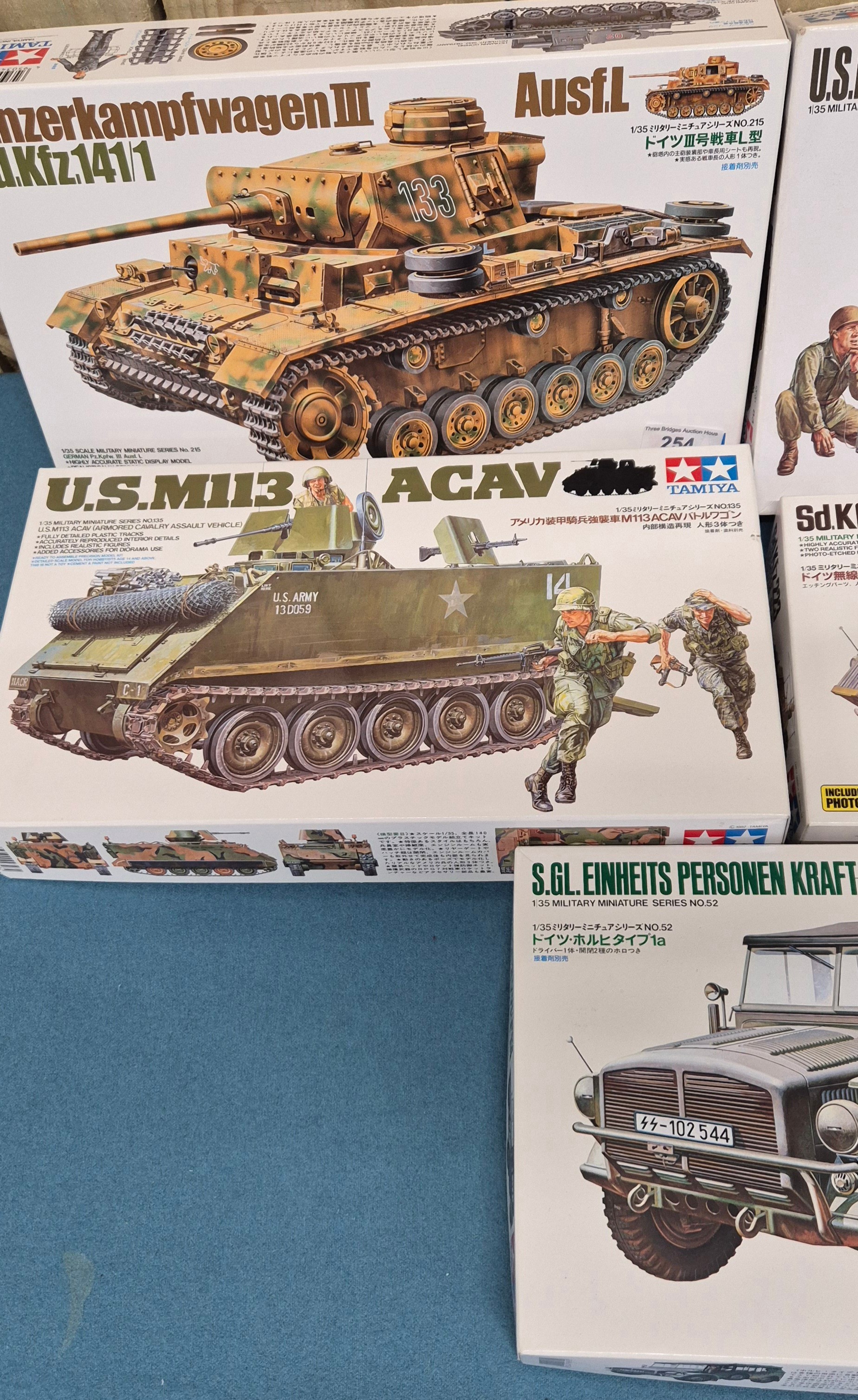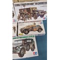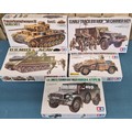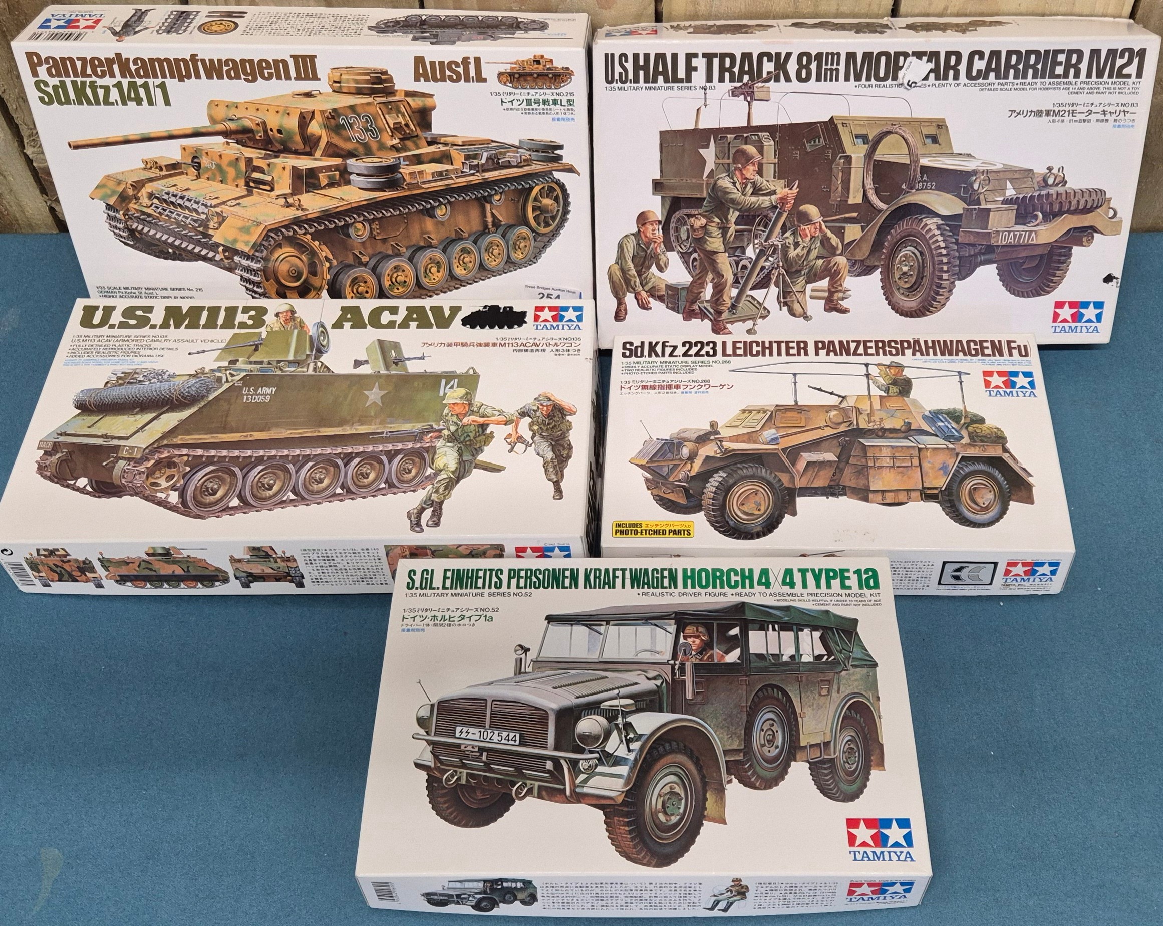 Five Tamiya Military Model Kits; U.S. MII3 ACAV Tank, U.S. Half track 81mm Mortar Carrier and Panzerkampwagen III Tank. Unchecked.
