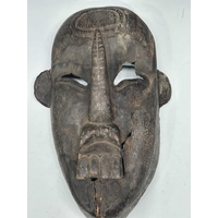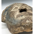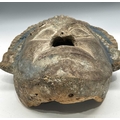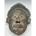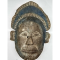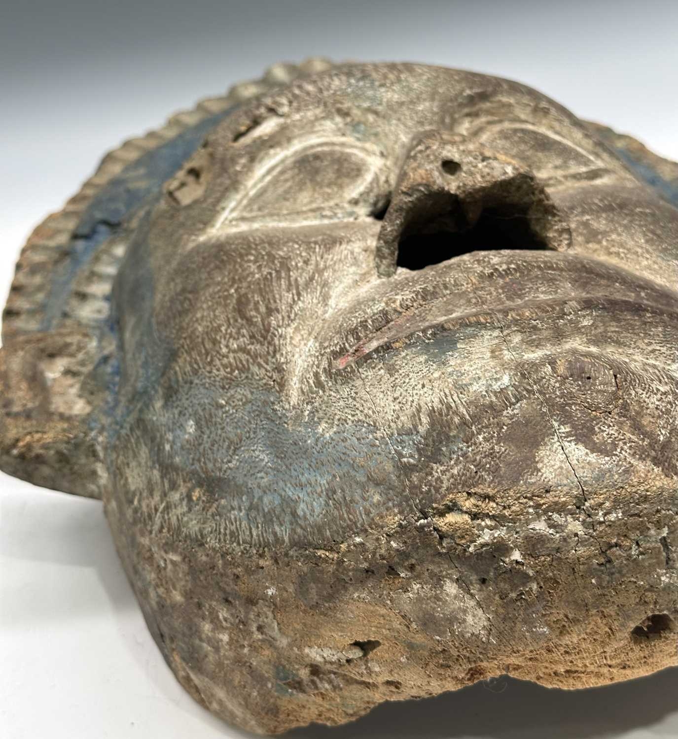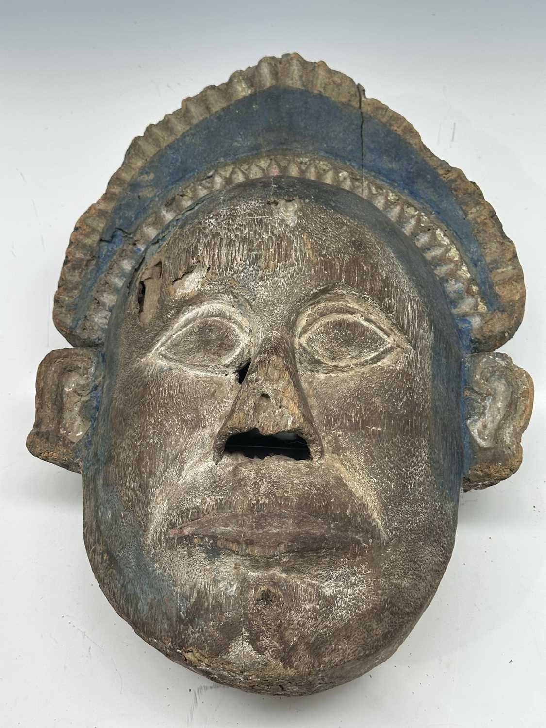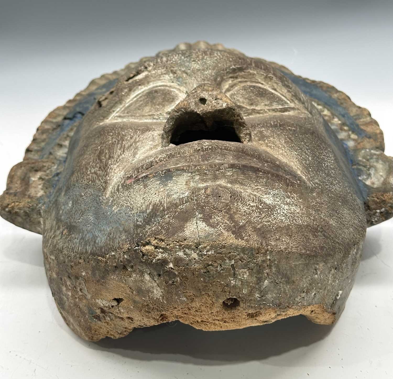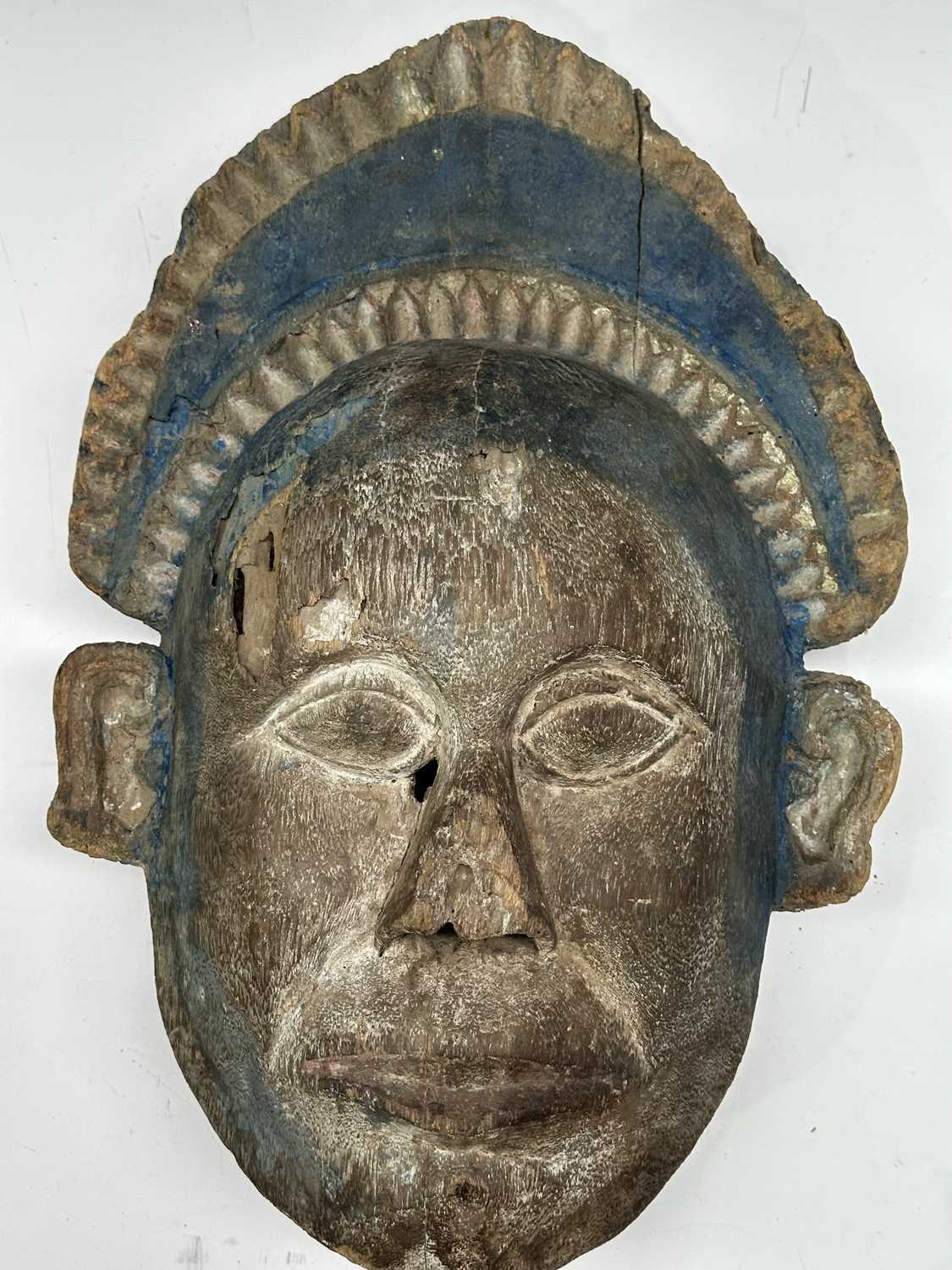 A guardian mask, Terai region, Nepal, late 19th/early 20th century, a painted blue halo headdress above a serene and symmetrical face with protruding ears and almond-shaped eyes, remnants of surface polychrome decoration, hollowed interior, 51.5 by 38cm Provenance: The Alain Rouveure Collection