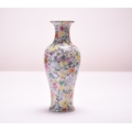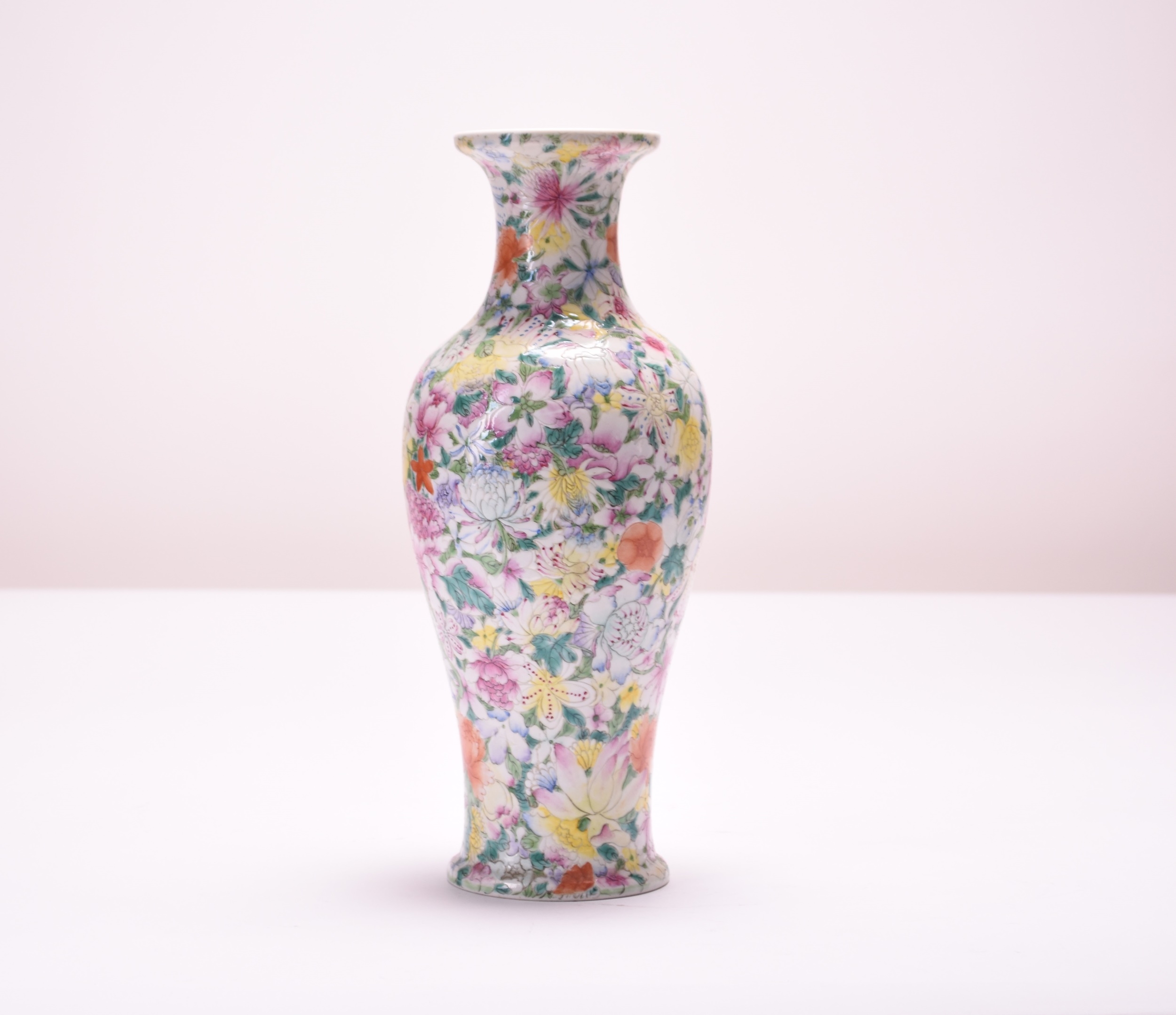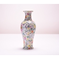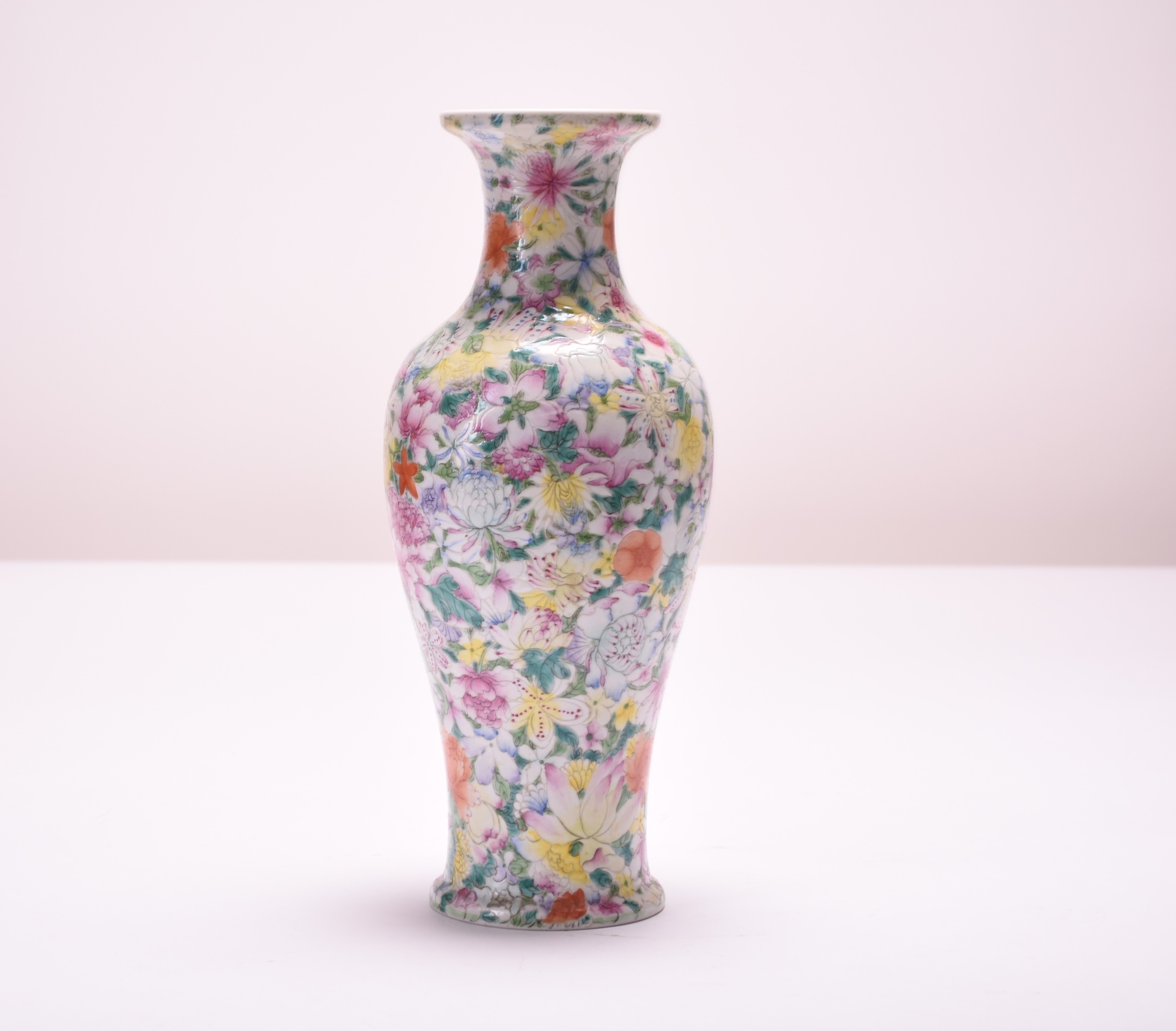 A Chinese famille rose ‘thousand flower’ vase, Qianlong seal mark but Republic period Of baluster form and decorated with an all-over pattern of dense flowers and foliage. 33cm high