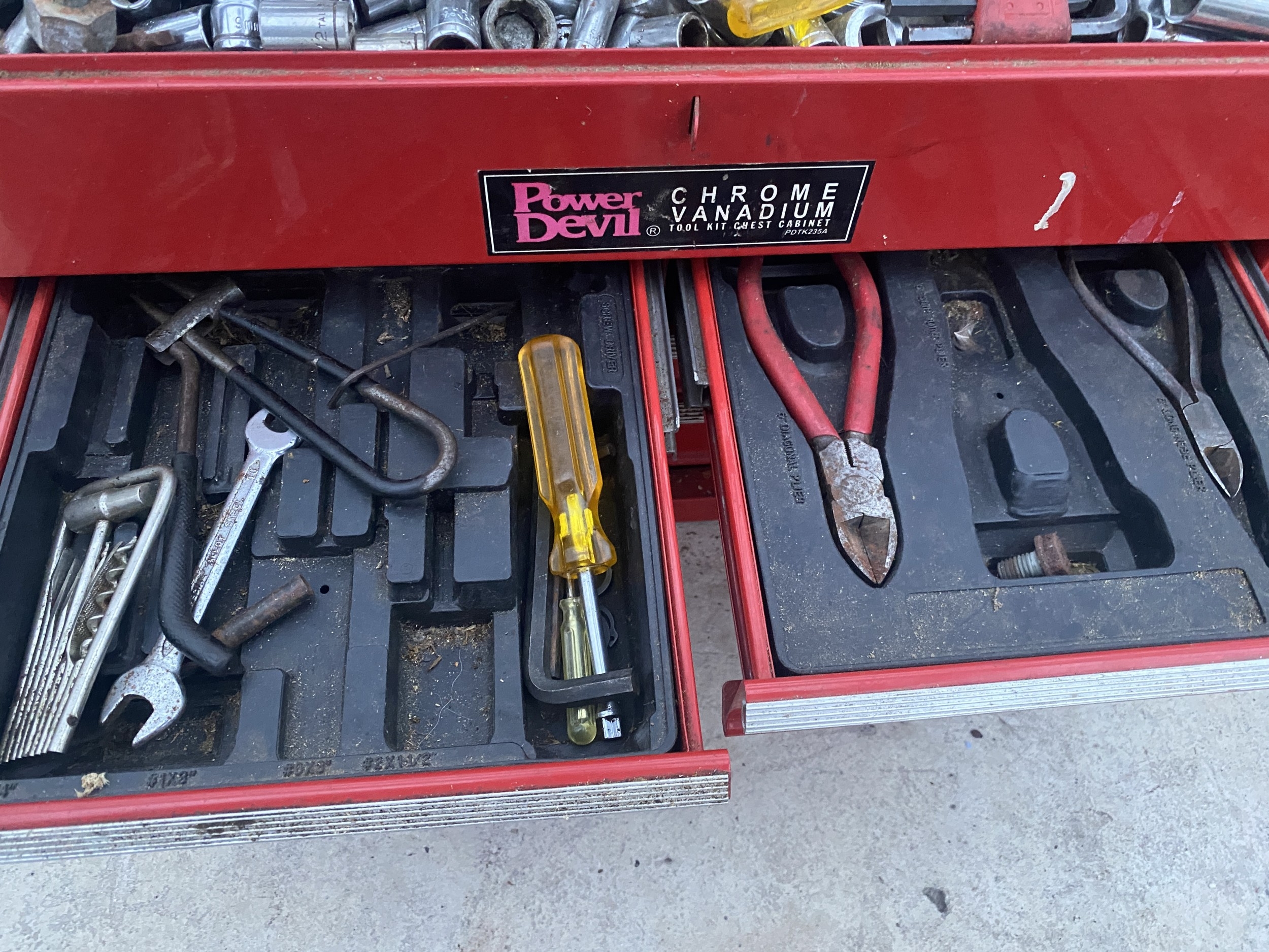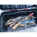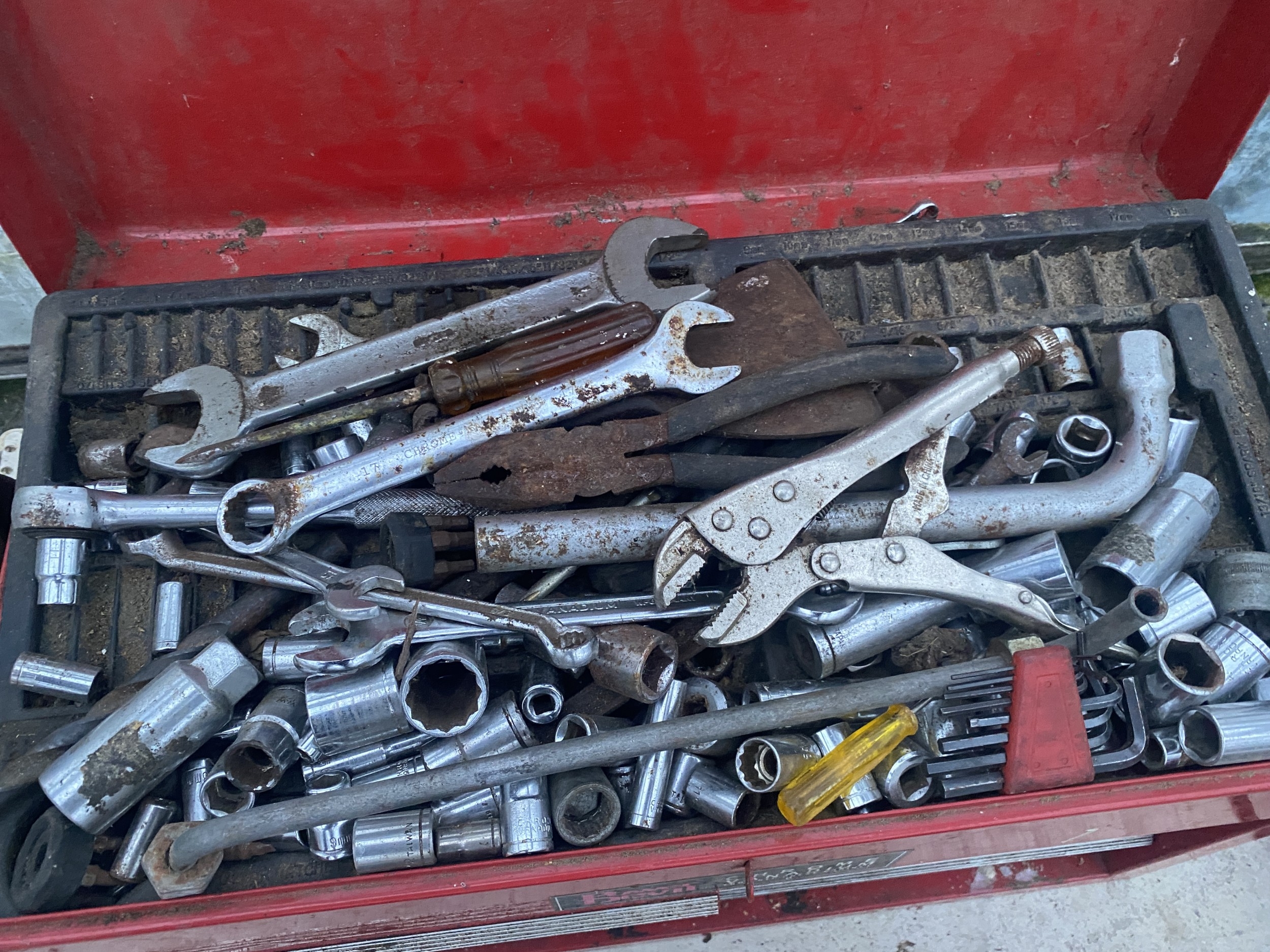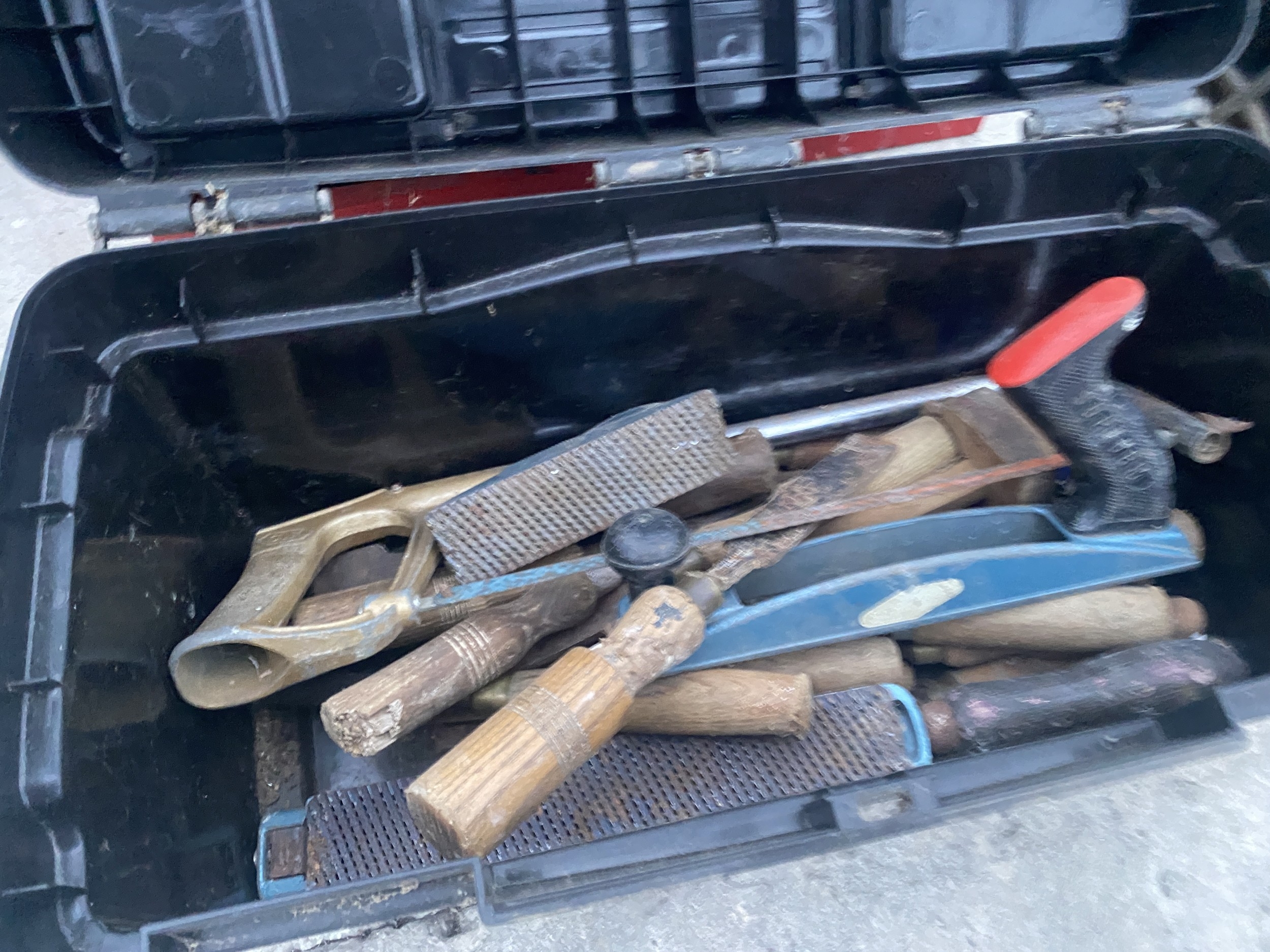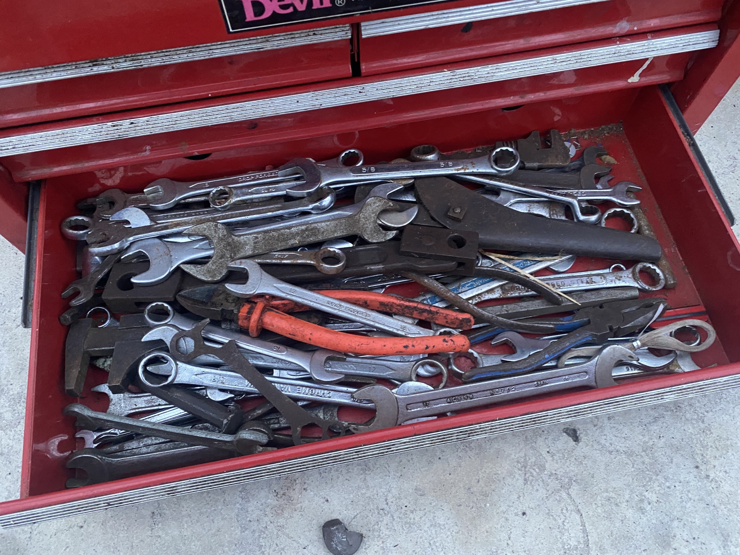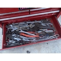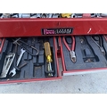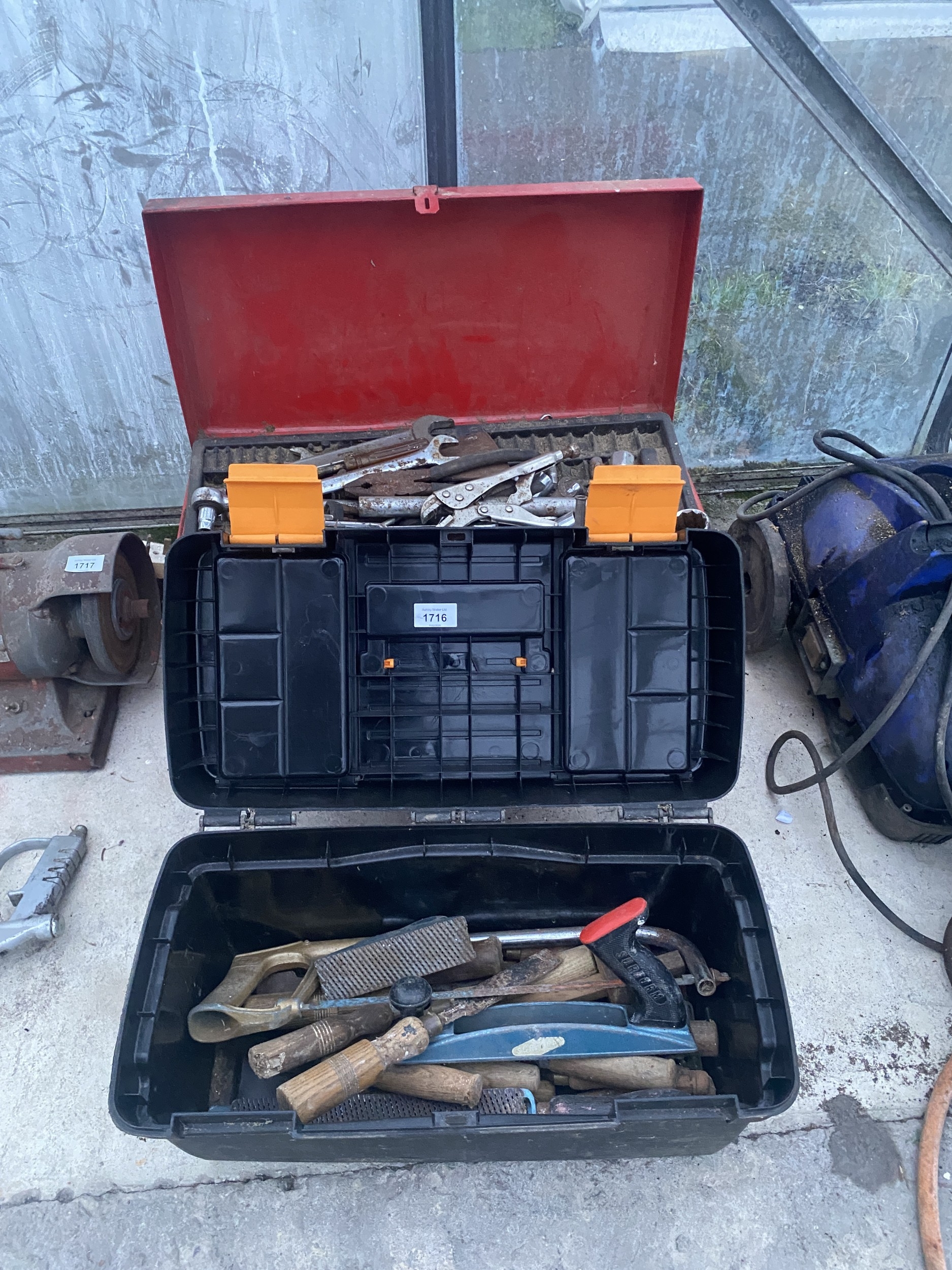 A WORK BENCH TOP TOOL CHEST AND A PLASTIC TOOL BOX WITH AN ASSORTMENT OF TOOLS TO INCLUDE SPANNERS, SOCKETS, PLIERS AND RASPS ETC