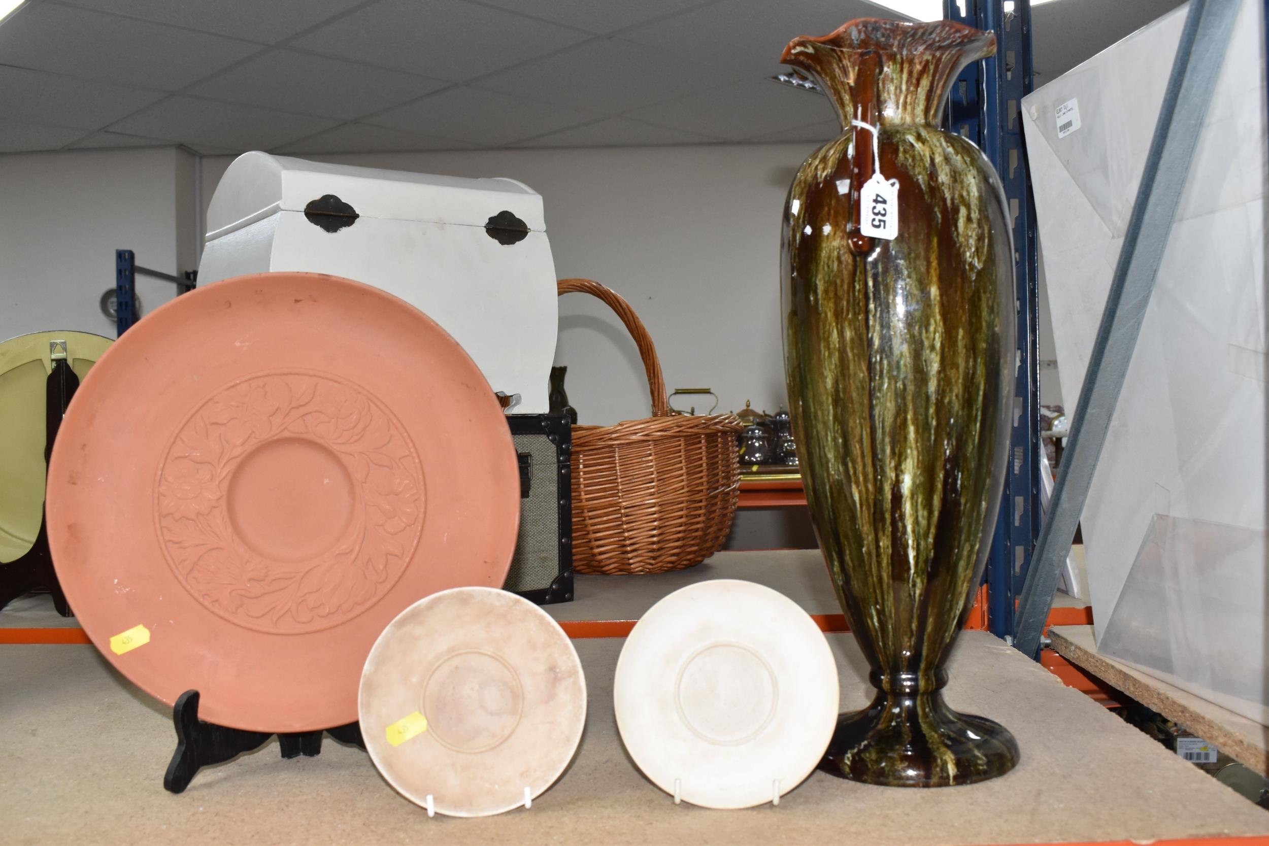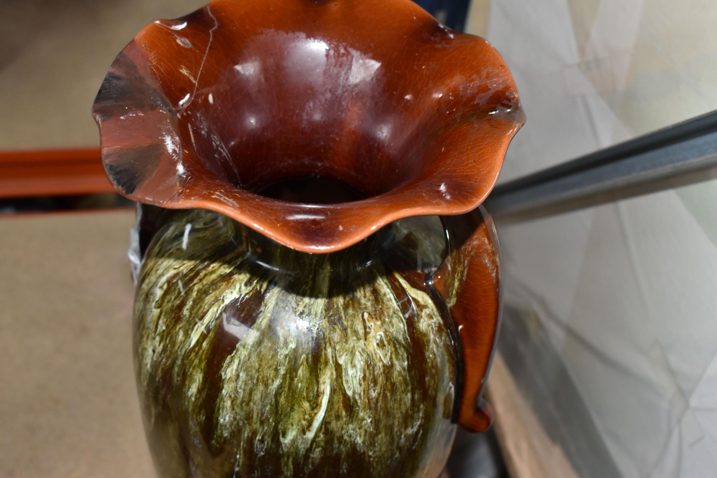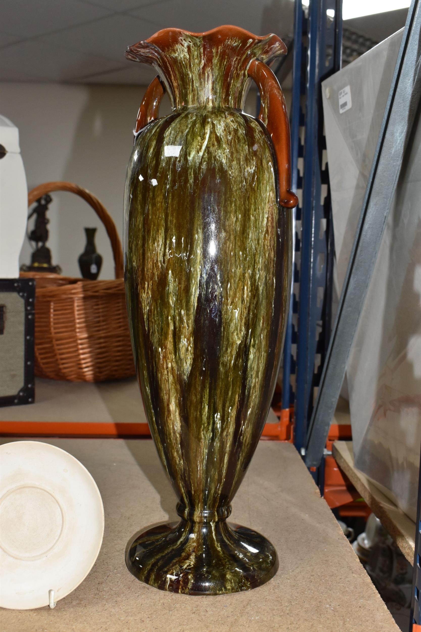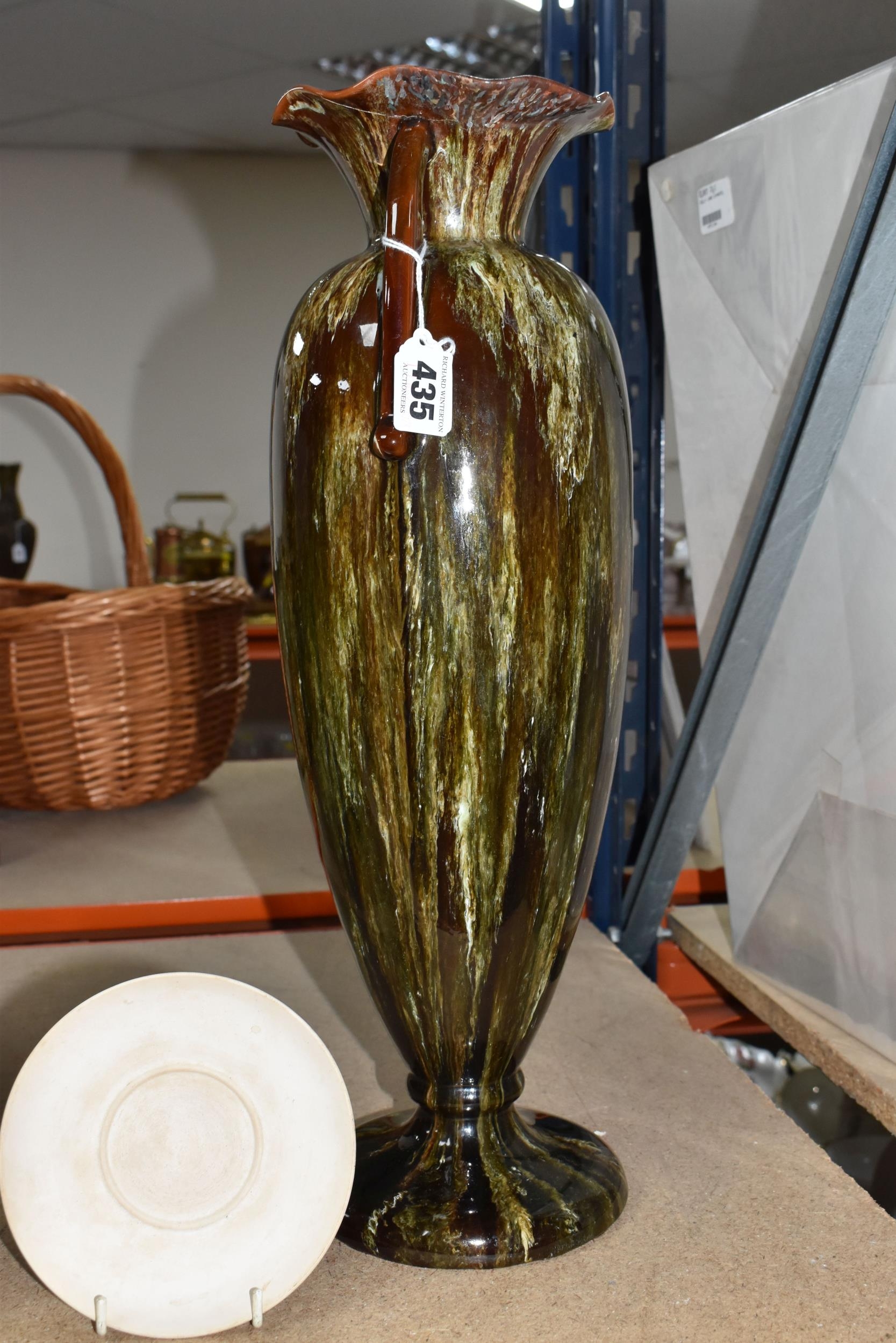 A SMALL QUANTITY OF LINTHORPE POTTERY, to include a pottery vase shape 1687, brown, green and white running glaze, brown handles and a ruffle edge to the top, height 47cm, (has had restoration work to the top, and some nibbles around the base, overall condition ok), two saucers stamped no. 640, (very dirty no glaze), a terracotta plate no. 299, (no glaze, marked in varies places), (Condition Report: see main description for individual items, all in ok condition), (4)