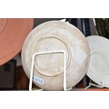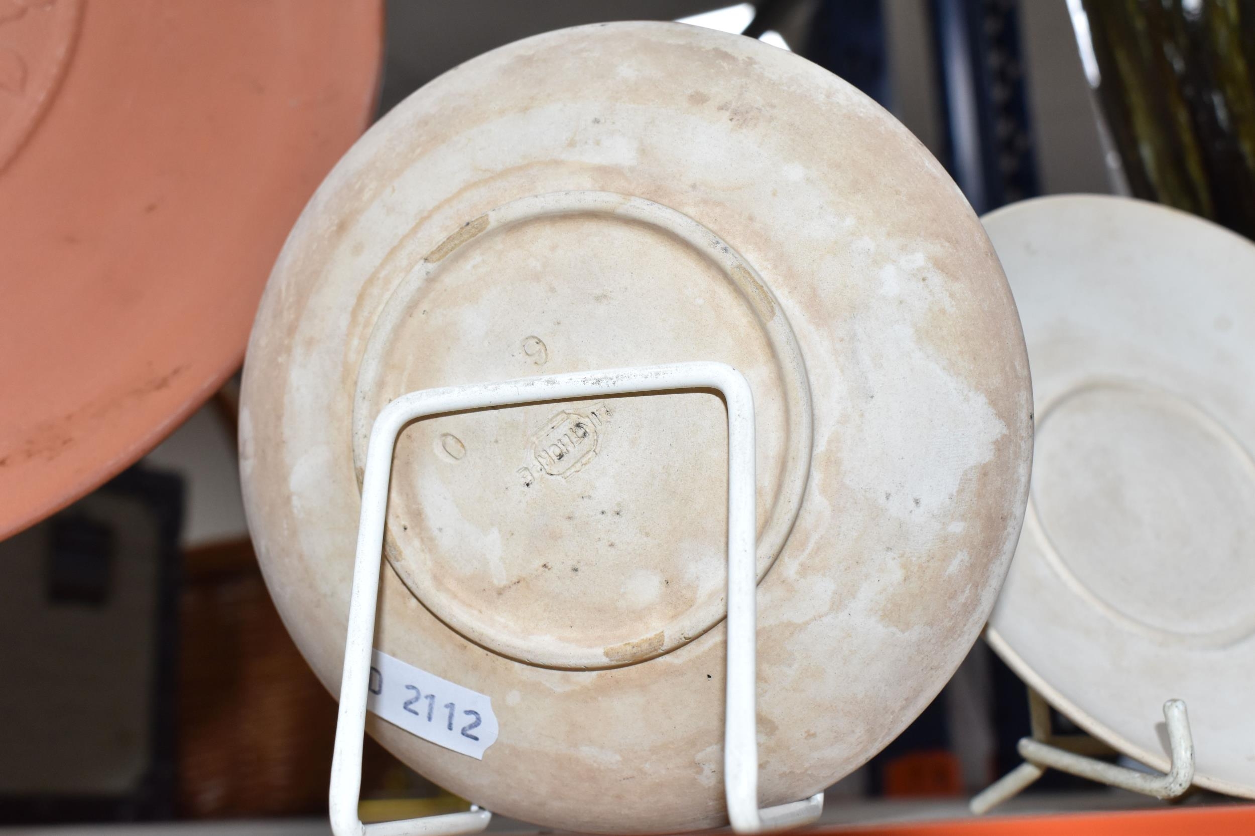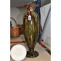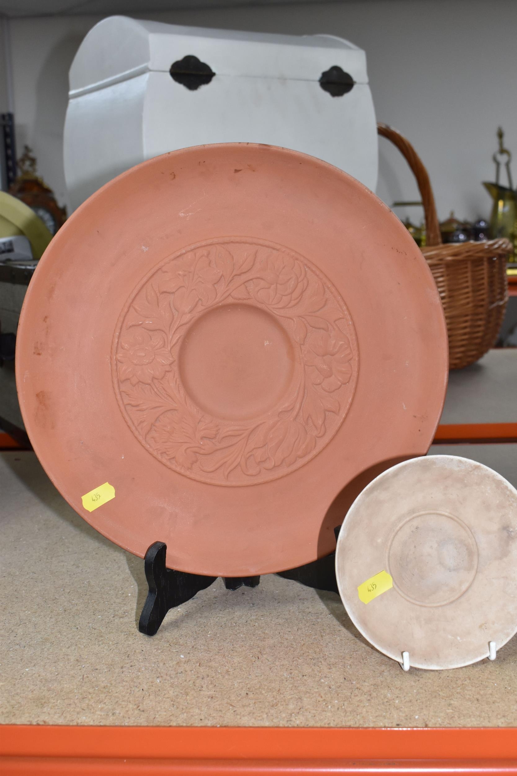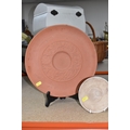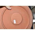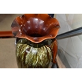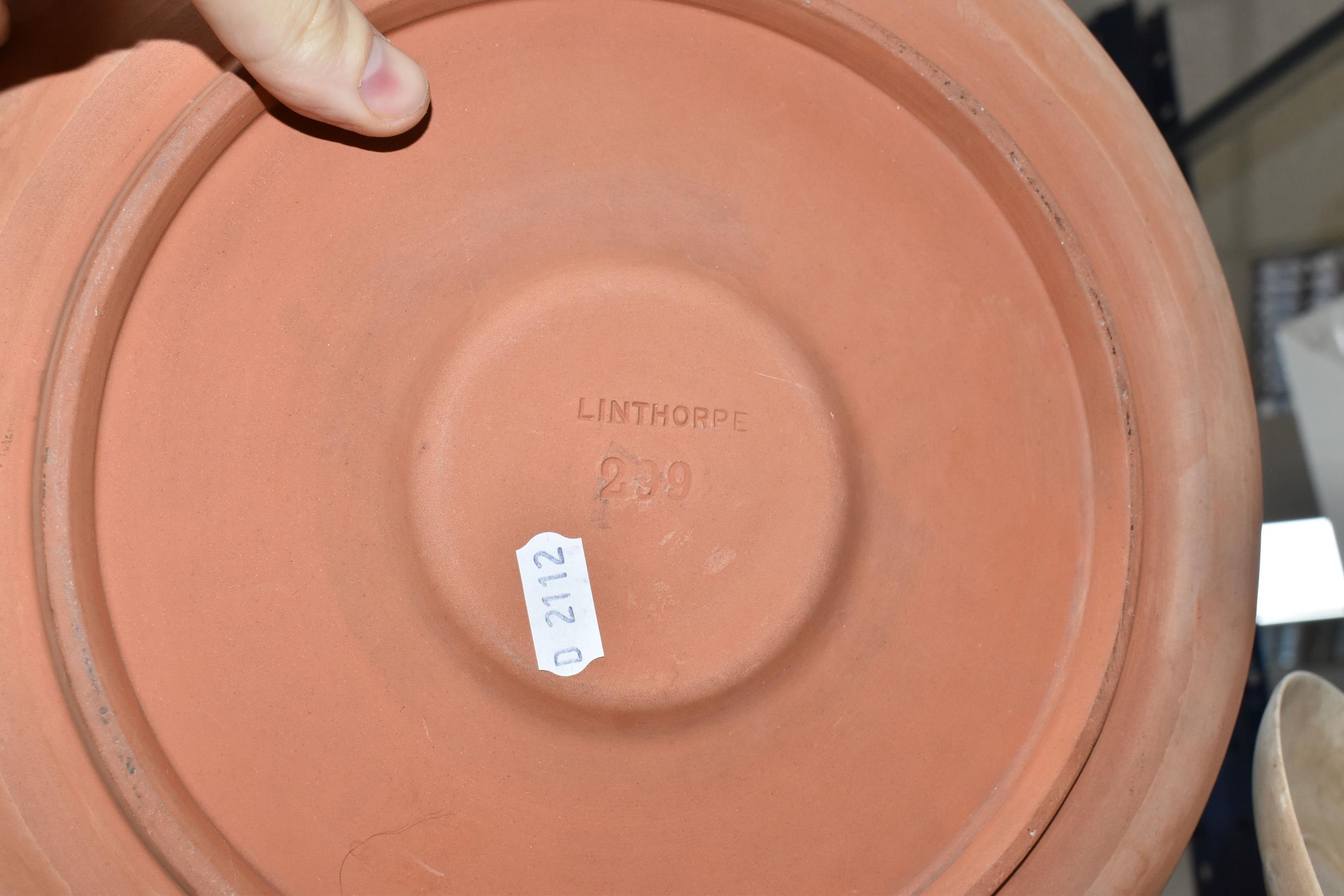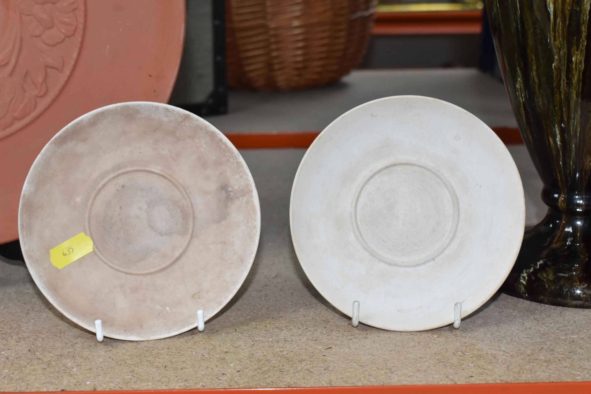 A SMALL QUANTITY OF LINTHORPE POTTERY, to include a pottery vase shape 1687, brown, green and white running glaze, brown handles and a ruffle edge to the top, height 47cm, (has had restoration work to the top, and some nibbles around the base, overall condition ok), two saucers stamped no. 640, (very dirty no glaze), a terracotta plate no. 299, (no glaze, marked in varies places), (Condition Report: see main description for individual items, all in ok condition), (4)