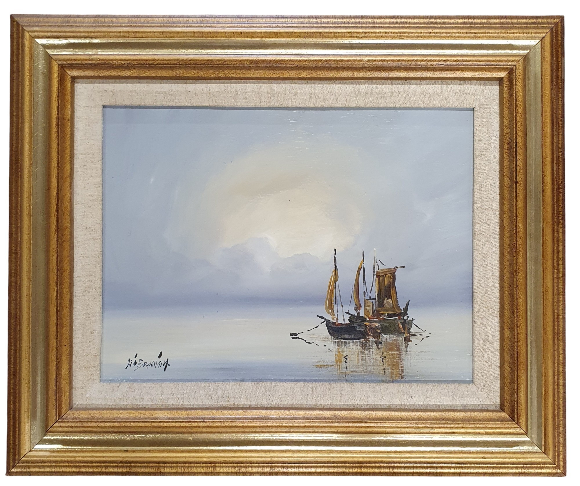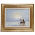 Donal O'Braonain (Irish) a 20th century Oil on Panel of moored ships at sunrise. Signed LL. In a good gilt frame.
