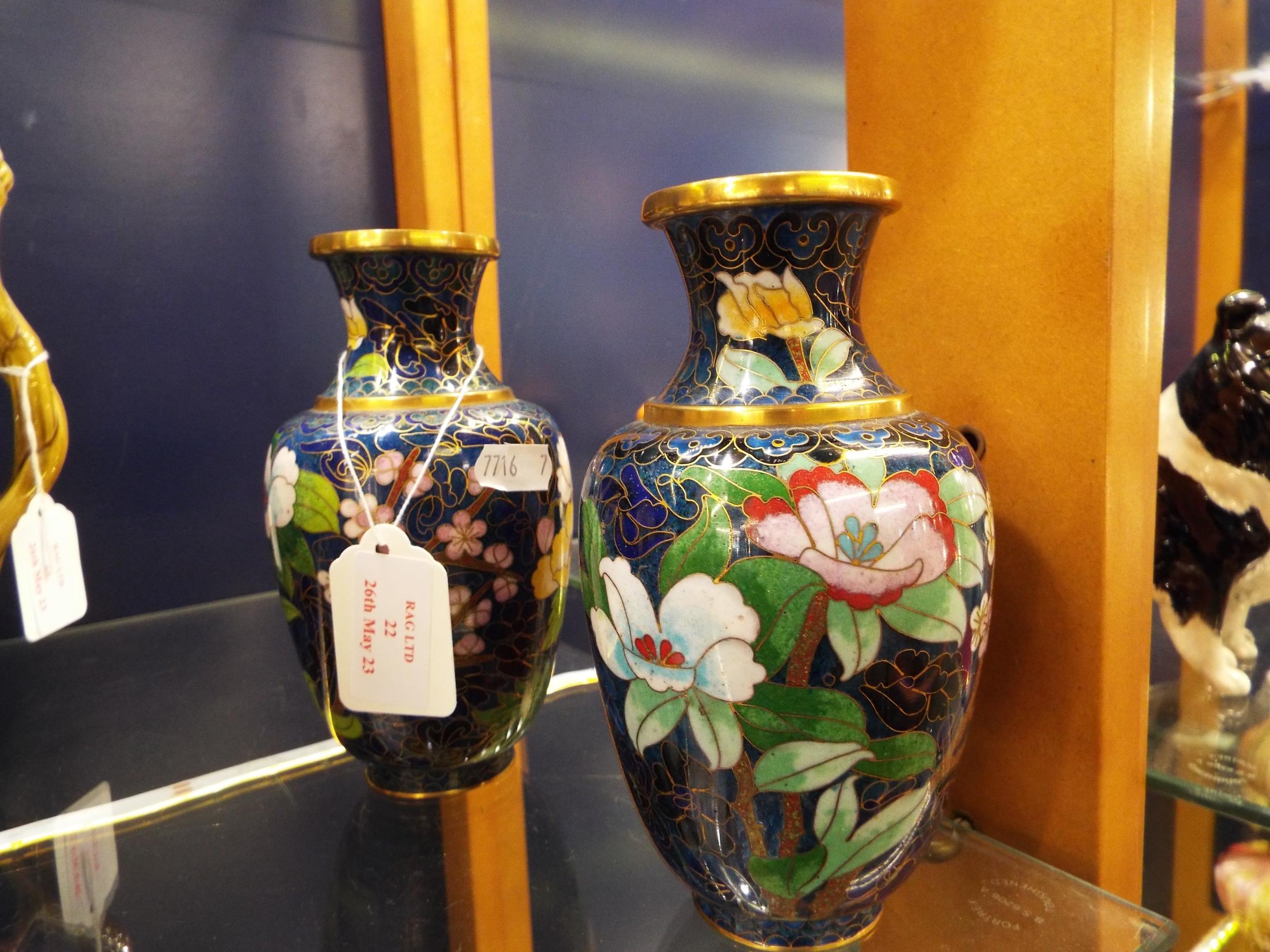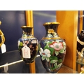 A pair of blue cloisonné vases with flower and blossom decoration