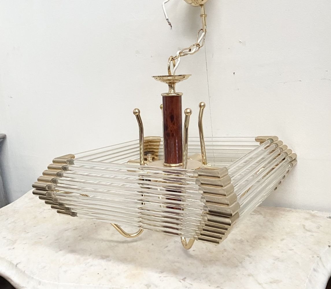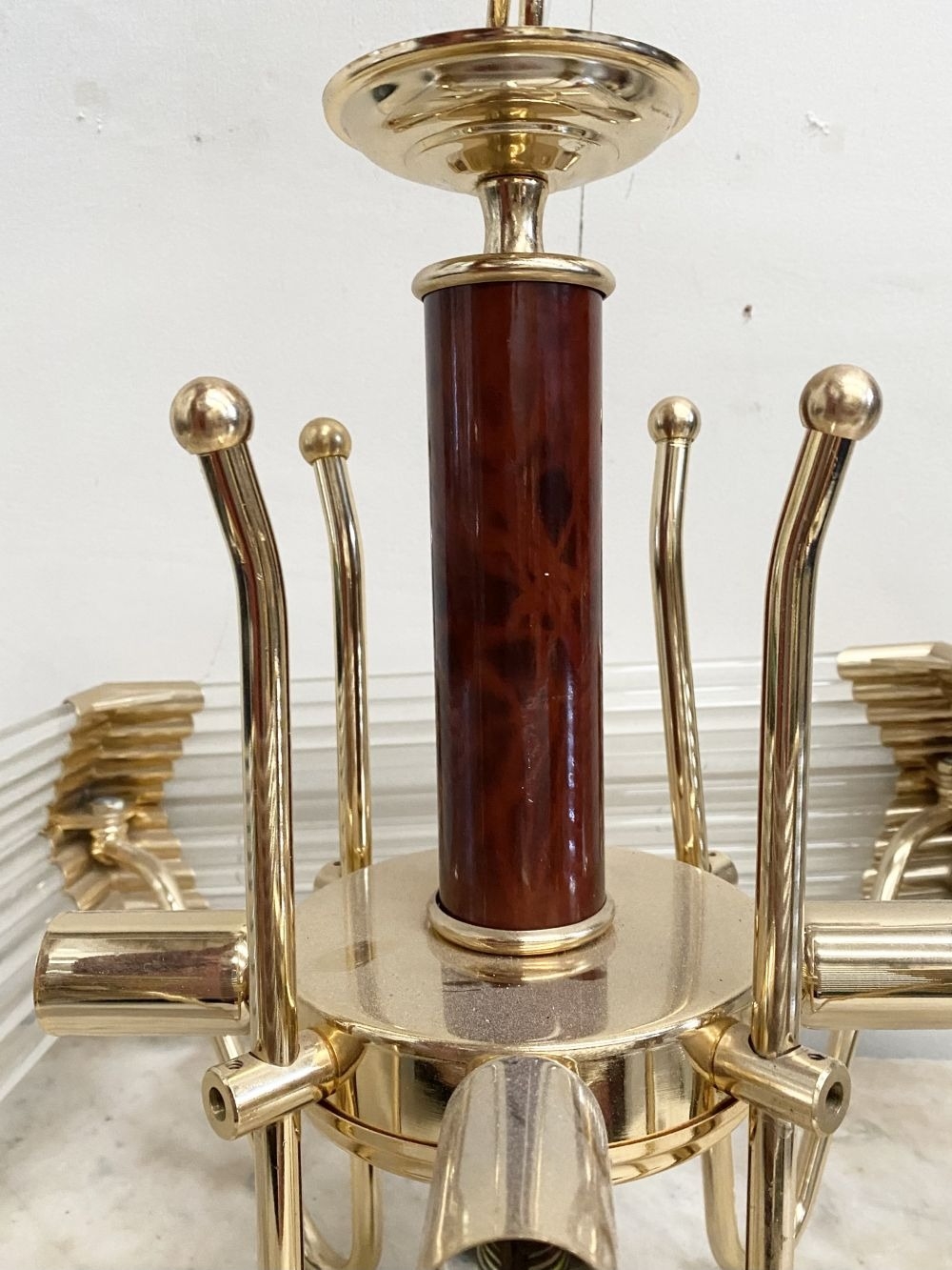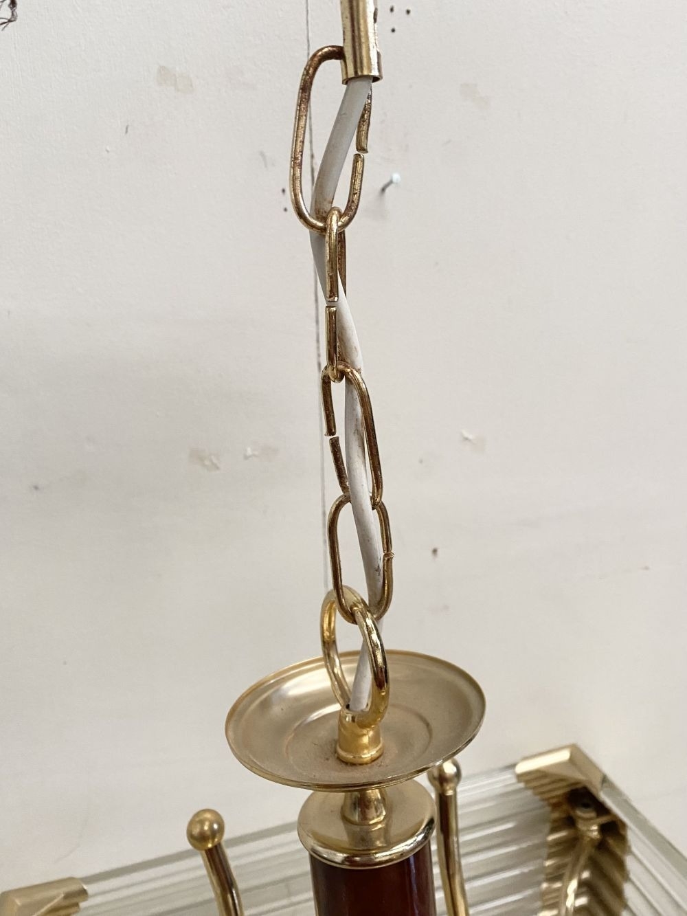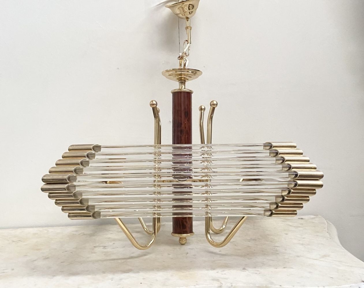 A BEAUTIFUL BRASS AND GLASS CHANDELIER, c.1980, the cylindrical simulated tortoiseshell column with a four arm light flanked on each side by cylindrical barring with link chain. Dimensions: 57cm high x 40cm wide x 40cm deep approx.