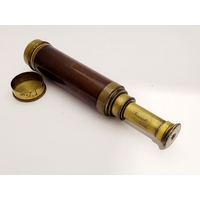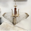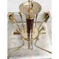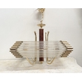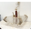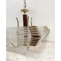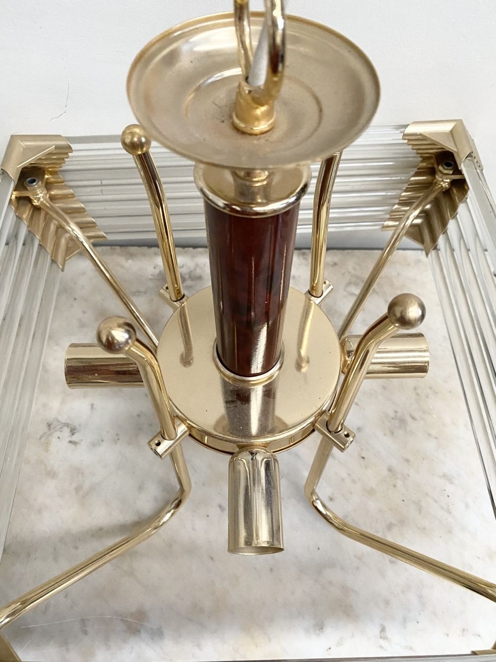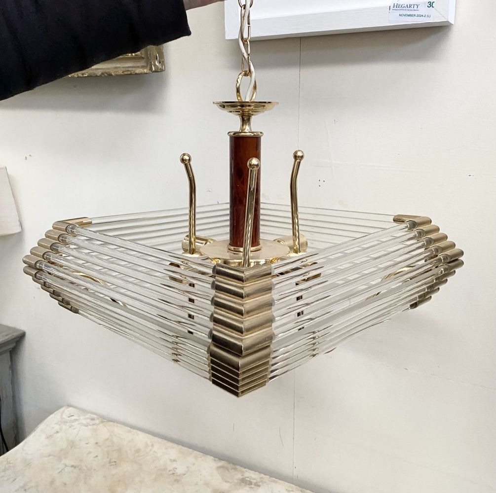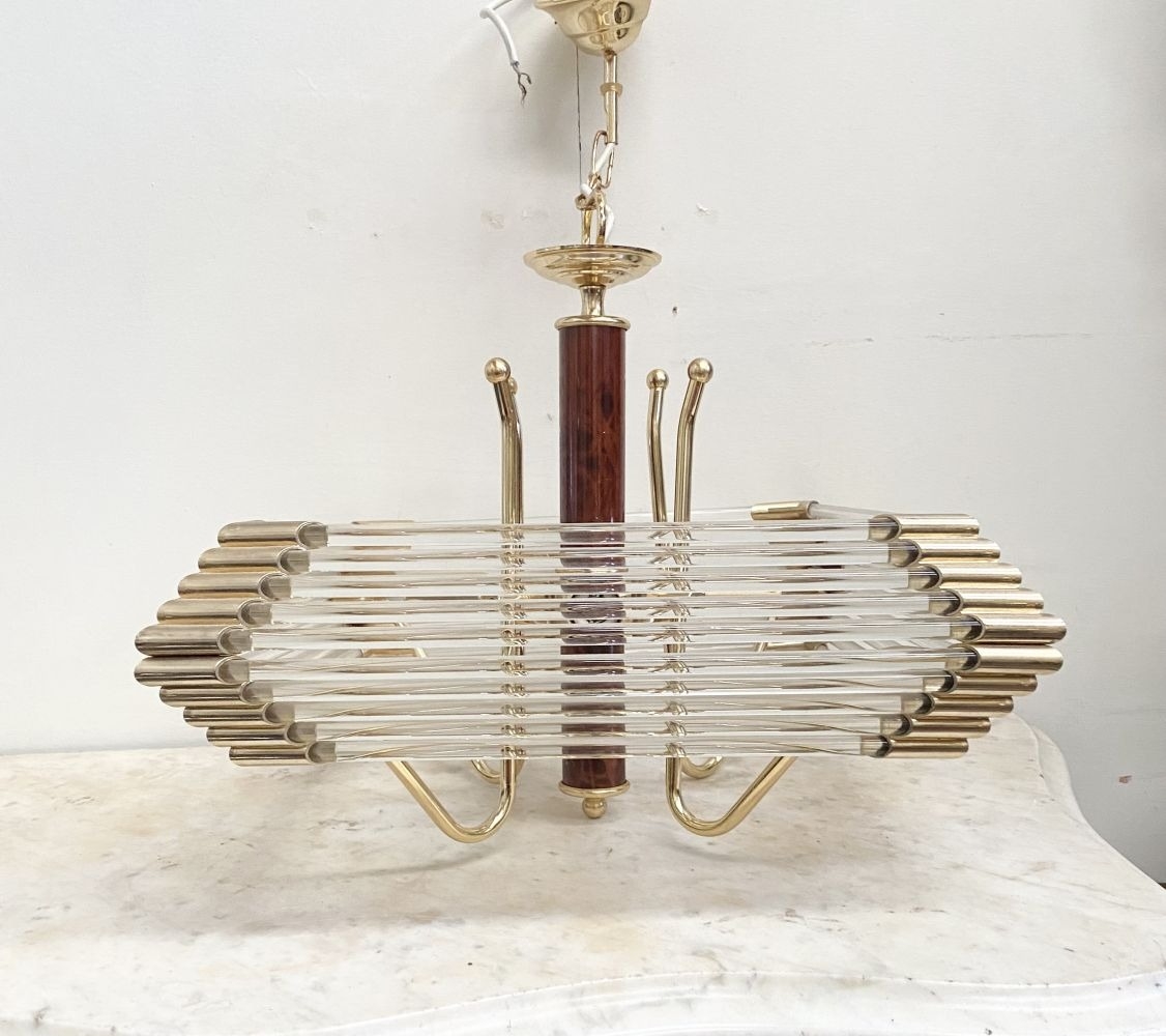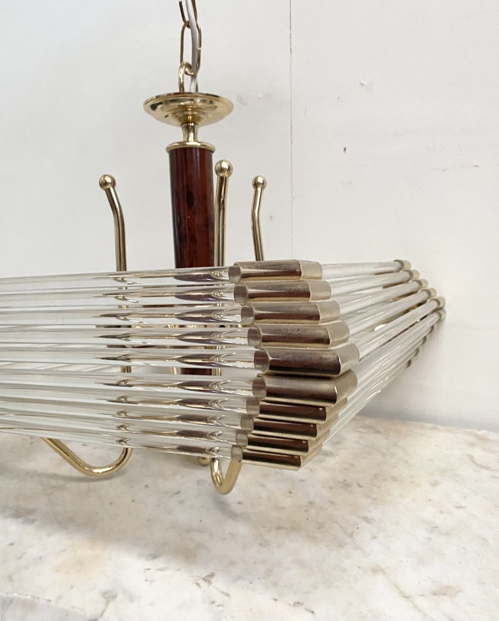 A BEAUTIFUL BRASS AND GLASS CHANDELIER, c.1980, the cylindrical simulated tortoiseshell column with a four arm light flanked on each side by cylindrical barring with link chain. Dimensions: 57cm high x 40cm wide x 40cm deep approx.